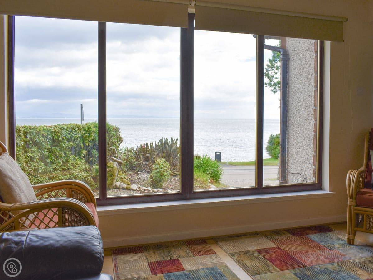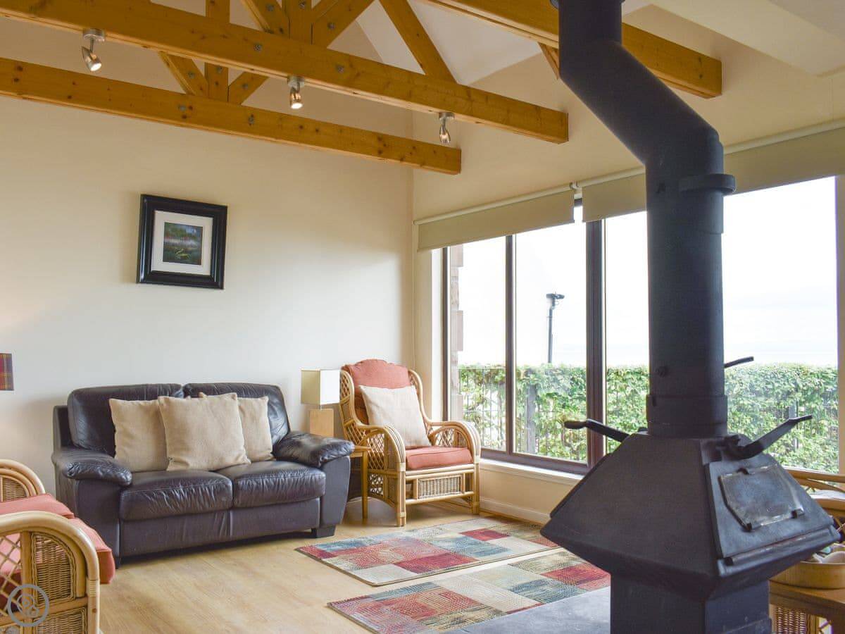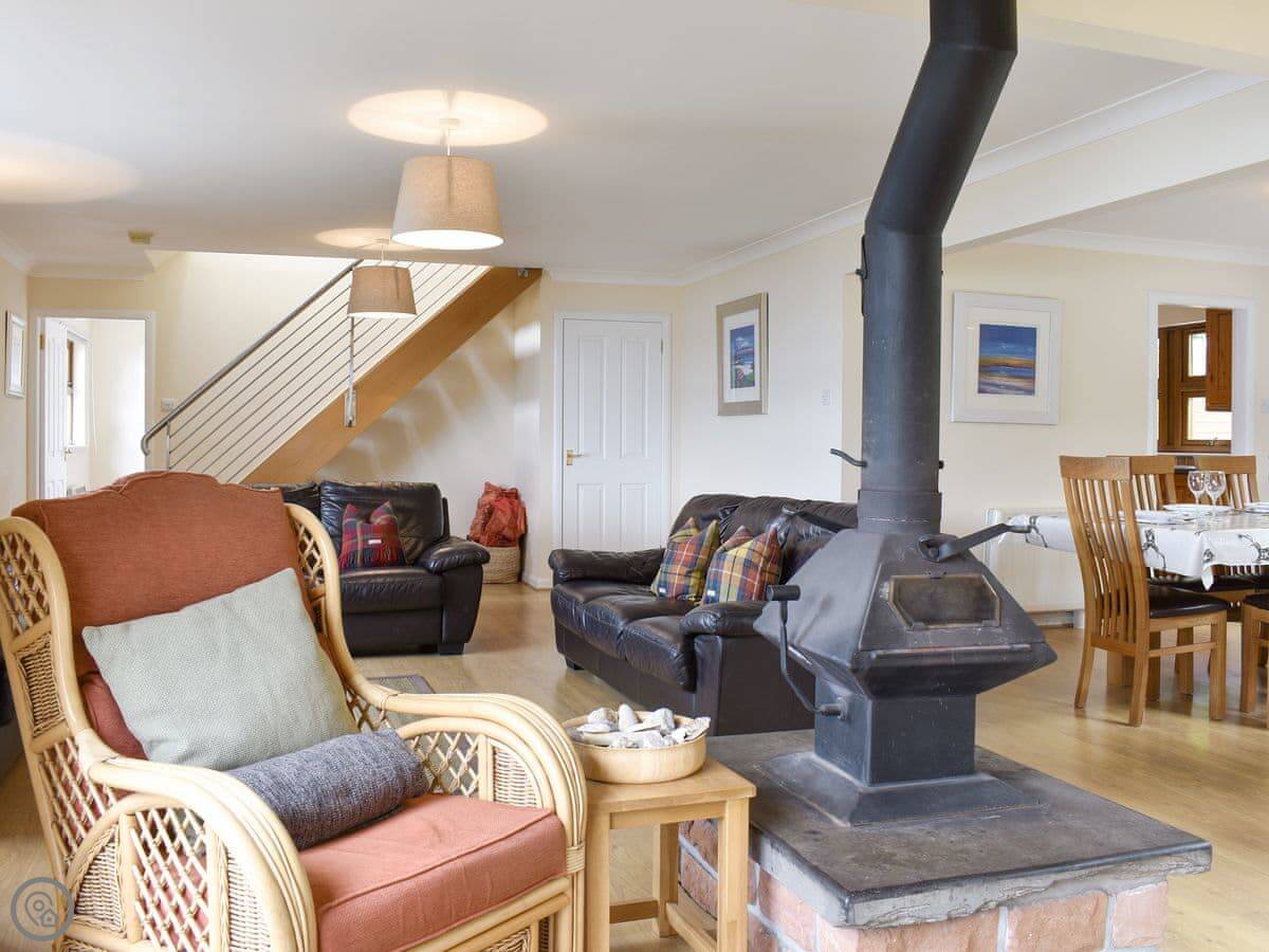 The living room is big and has a wood burner. It looks out over the sea towards Bute. You can see the beach from the windows.