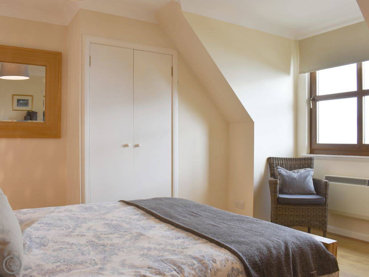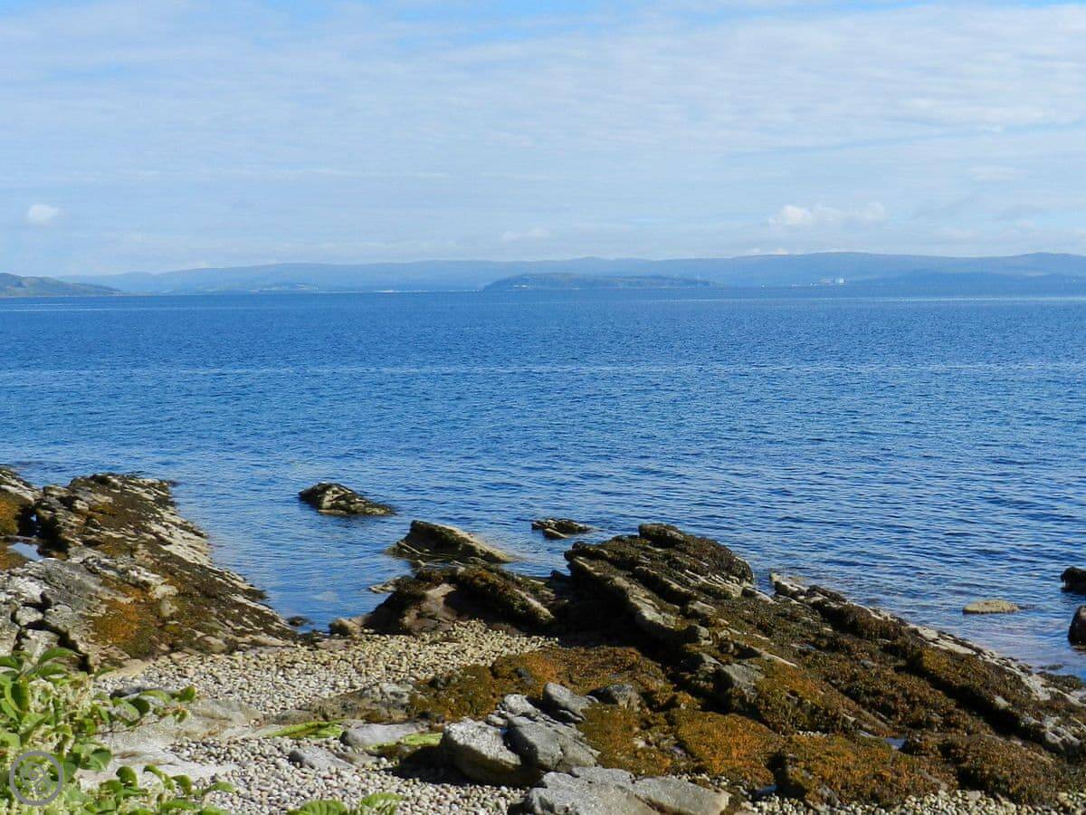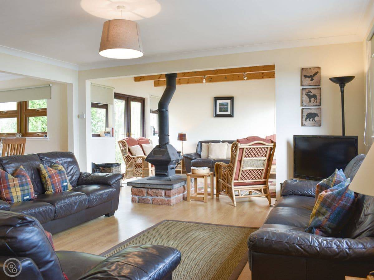 The living room is big and has a wood burner. It looks out over the sea towards Bute. You can see the beach from the windows.