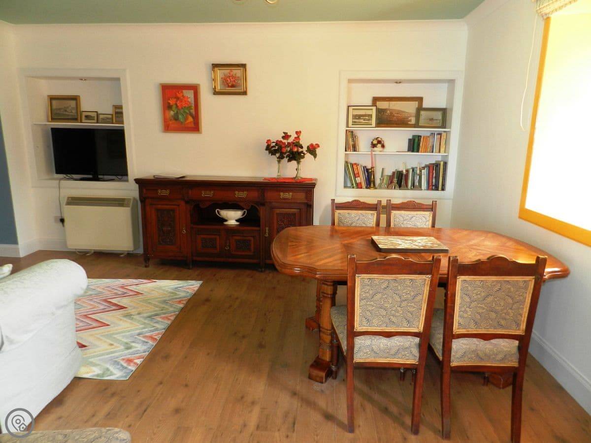 The living room has patio doors out to the garden. The garden is south-facing, so you get the sun. There's some outdoor furniture out there. You can sit and watch the ferries go past.