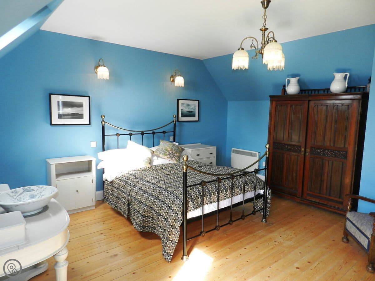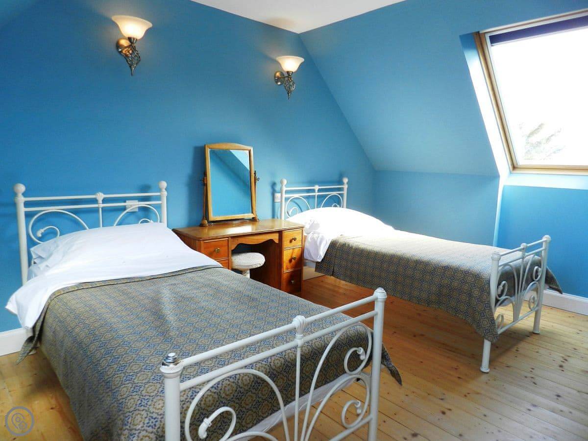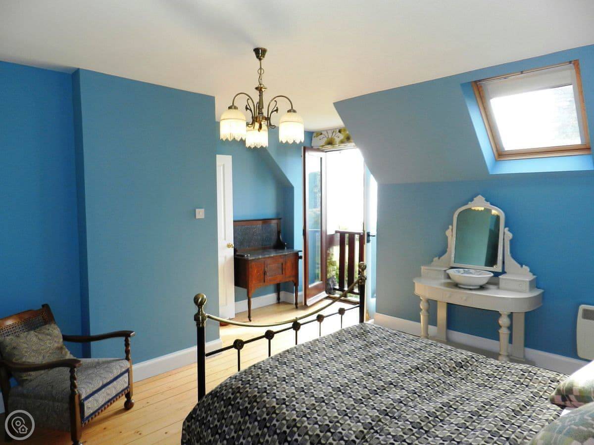 There's a bunk room on the ground floor, which is handy if you've got kids with you. Upstairs, there's a double bedroom with a little Juliet balcony that looks over the garden, the castle and the sea. The other upstairs room has twin beds. They're both bright.