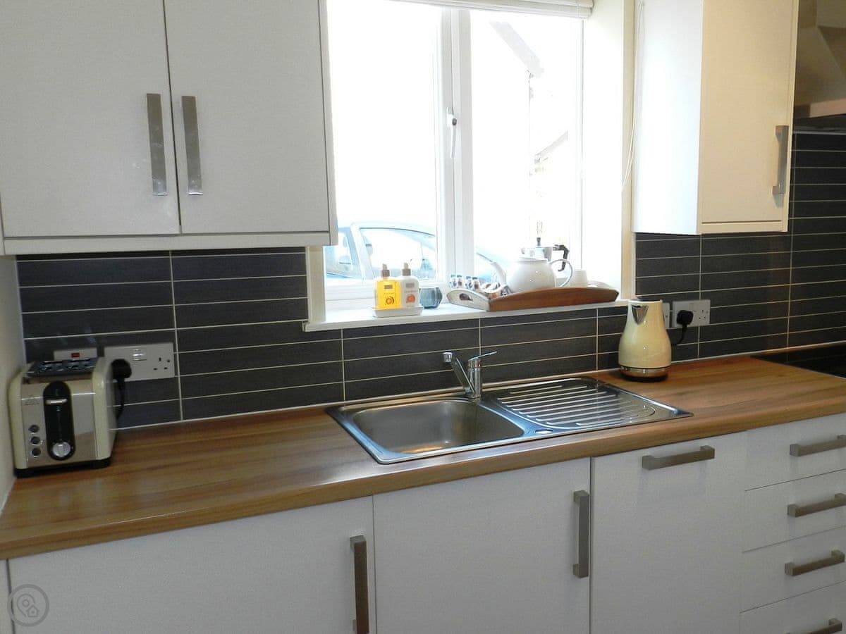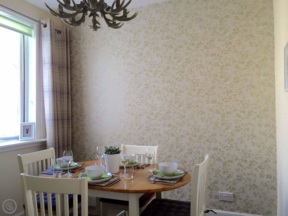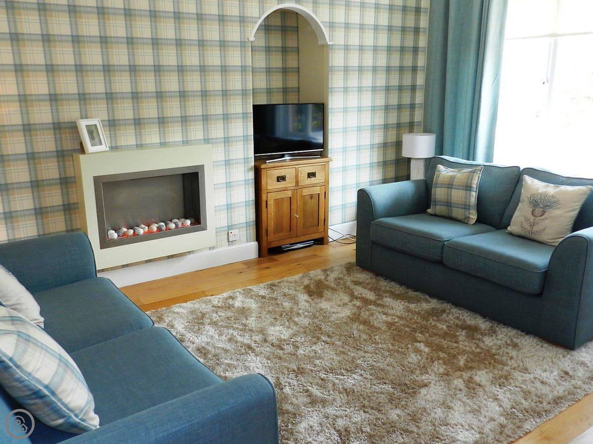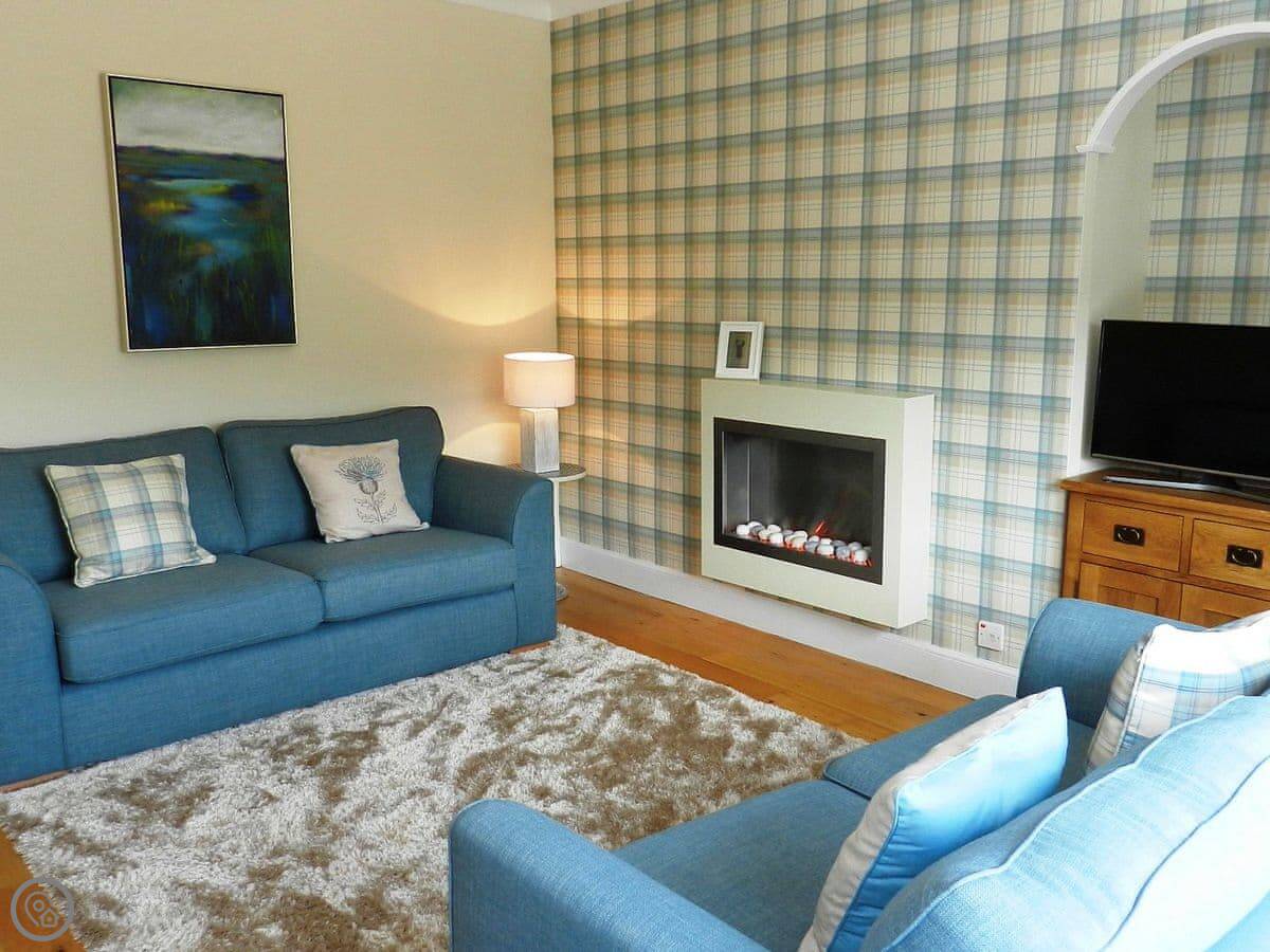 The cottage is part of a row built around 1905 for estate workers. It's been done up inside, so it's comfortable and clean. Tartan fabrics, decent sofas, that sort of thing. The kitchen has what you need. Both bedrooms are a good size. One looks out the back towards the hills, the other at the front has a view of Holy Isle.