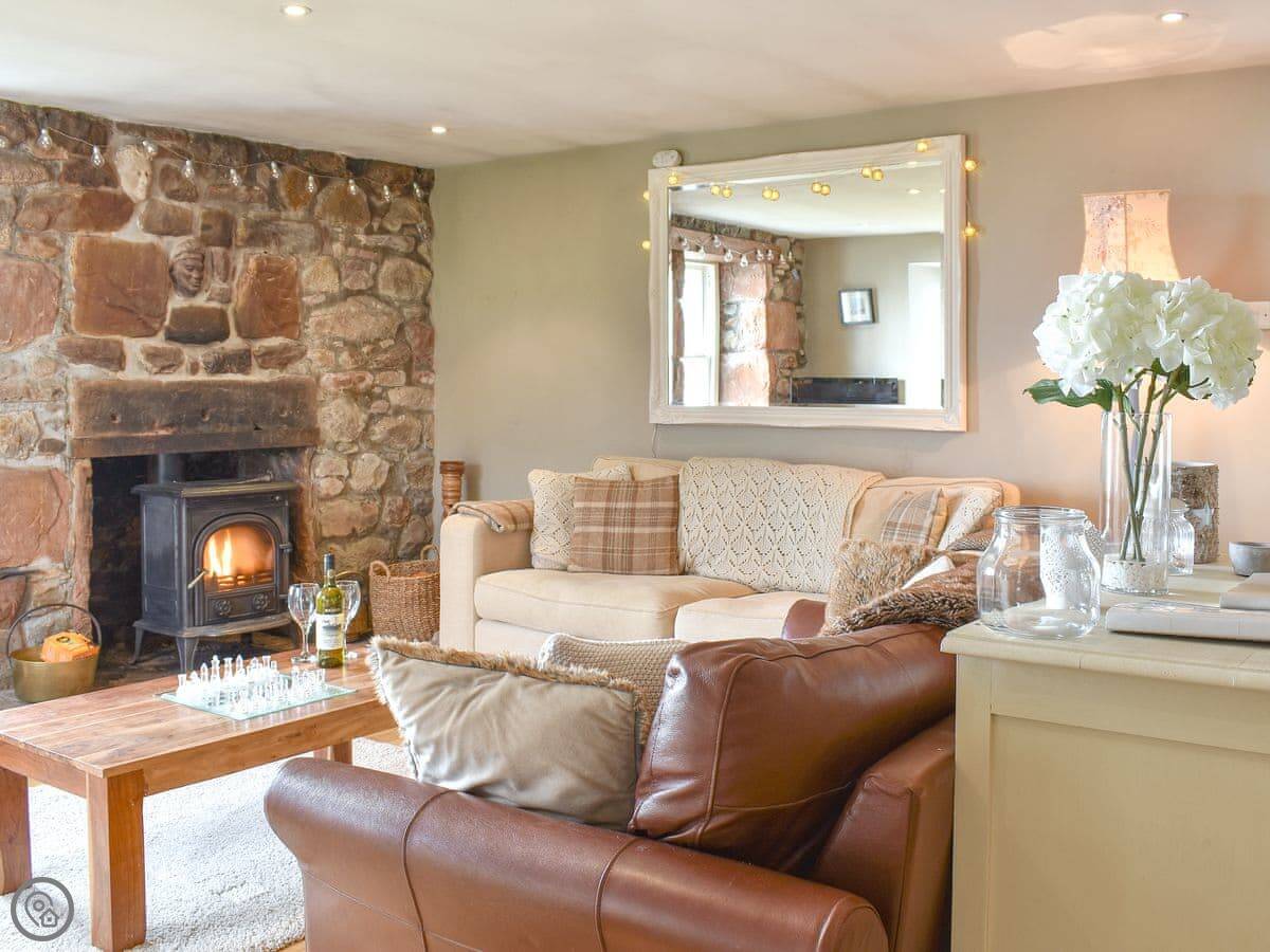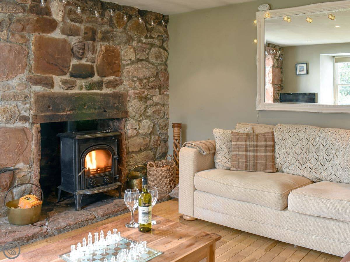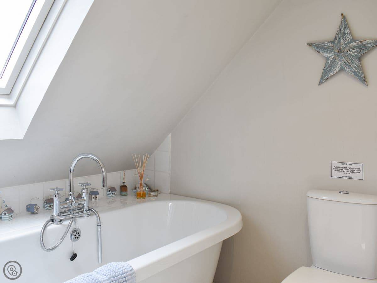 Inside, the ceilings are low in the bedrooms, which is normal for a place like this. There's a wood burner in the living room. The kitchen has what you need. The roll-top bath is upstairs.