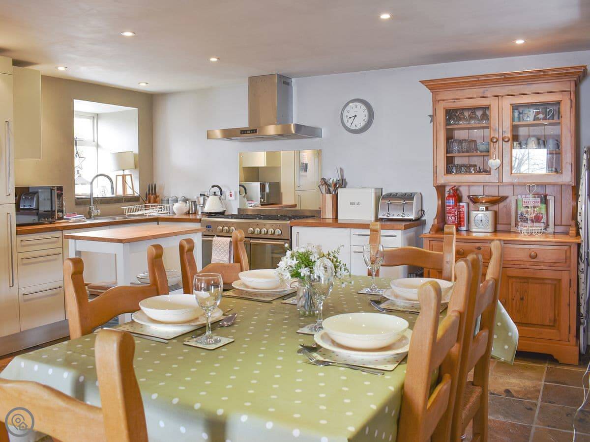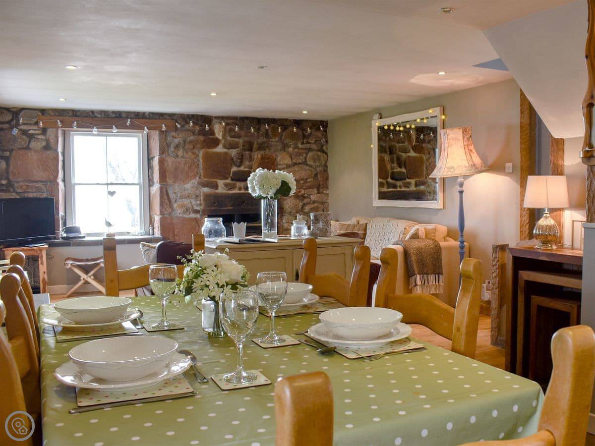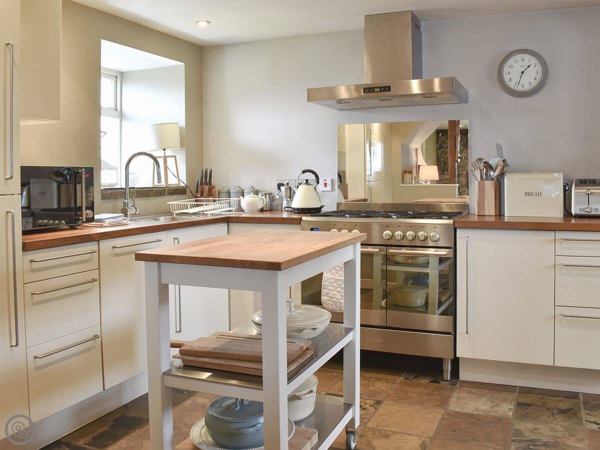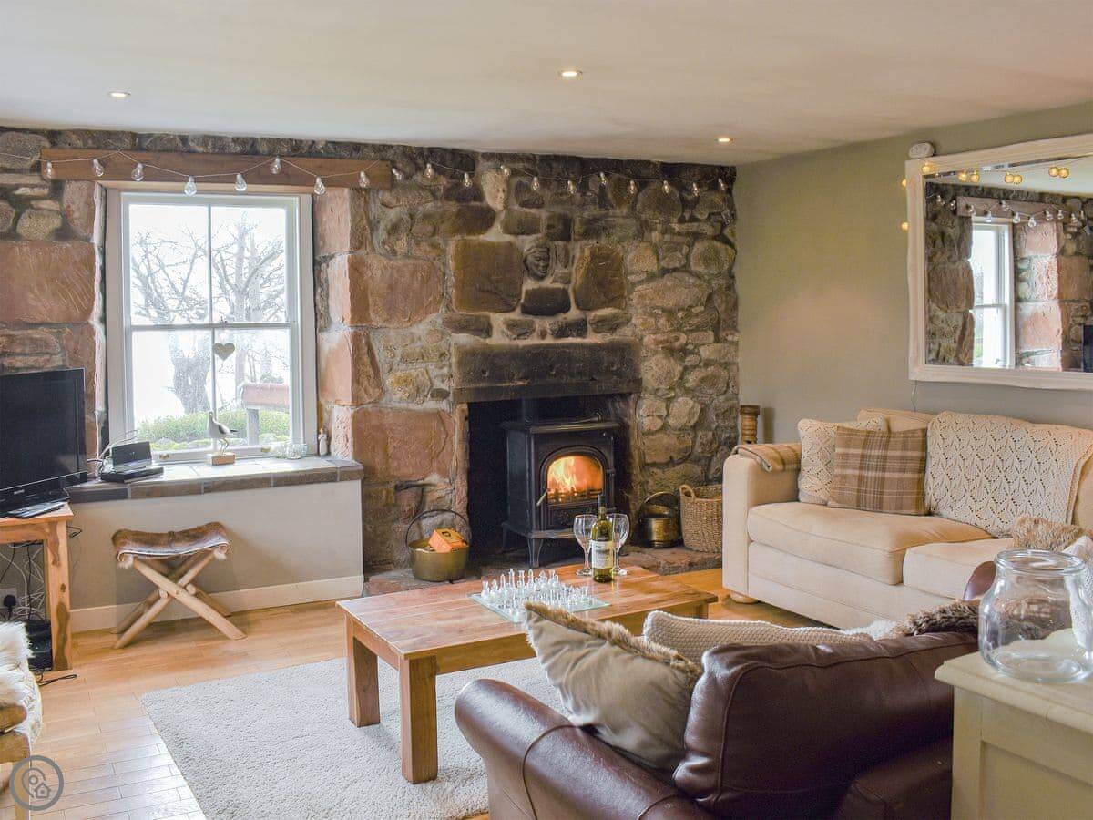 Inside, the ceilings are low in the bedrooms, which is normal for a place like this. There's a wood burner in the living room. The kitchen has what you need. The roll-top bath is upstairs.