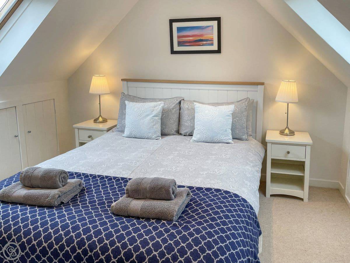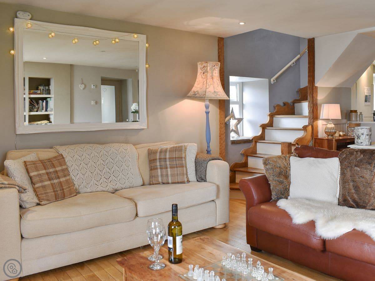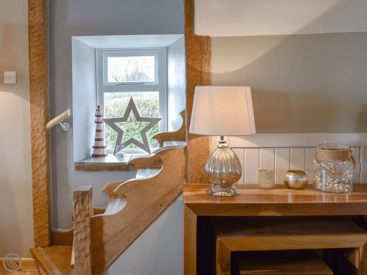 The cottage sleeps four. There are two bedrooms and two bathrooms. It's got a 5 Star rating. It's been done up recently, so everything is in good order. The stairs are unusual, carved like waves. They turn a corner and the handrail is only on one side. Just take your time on them.