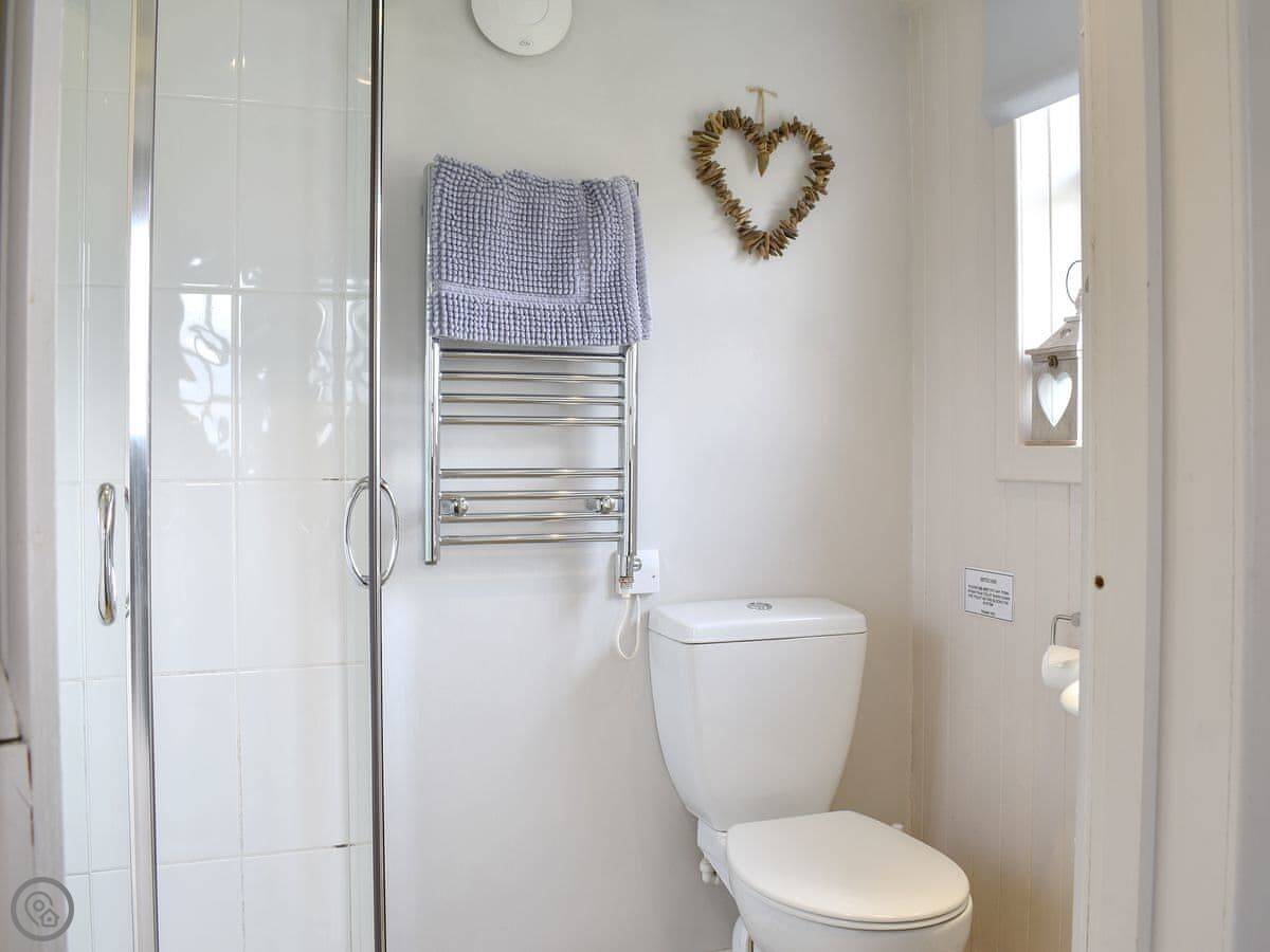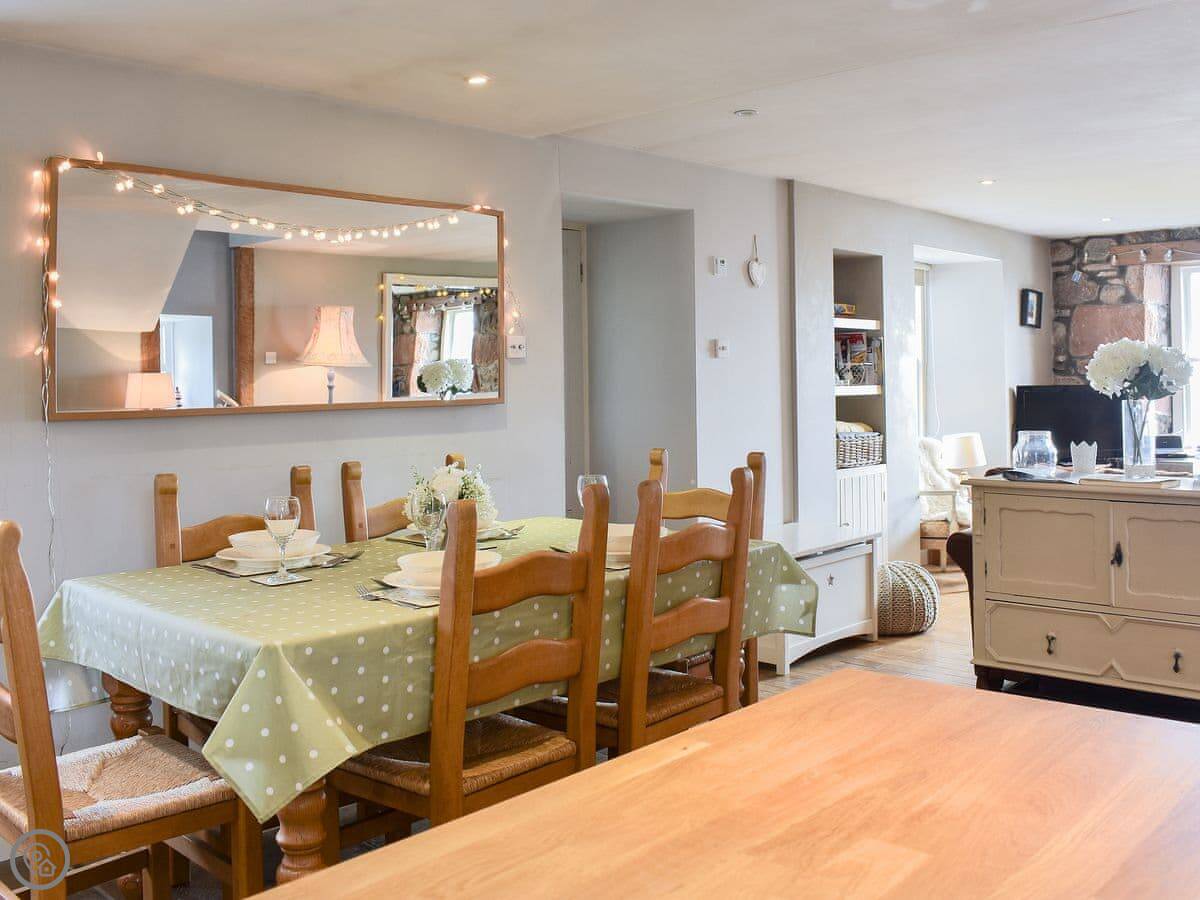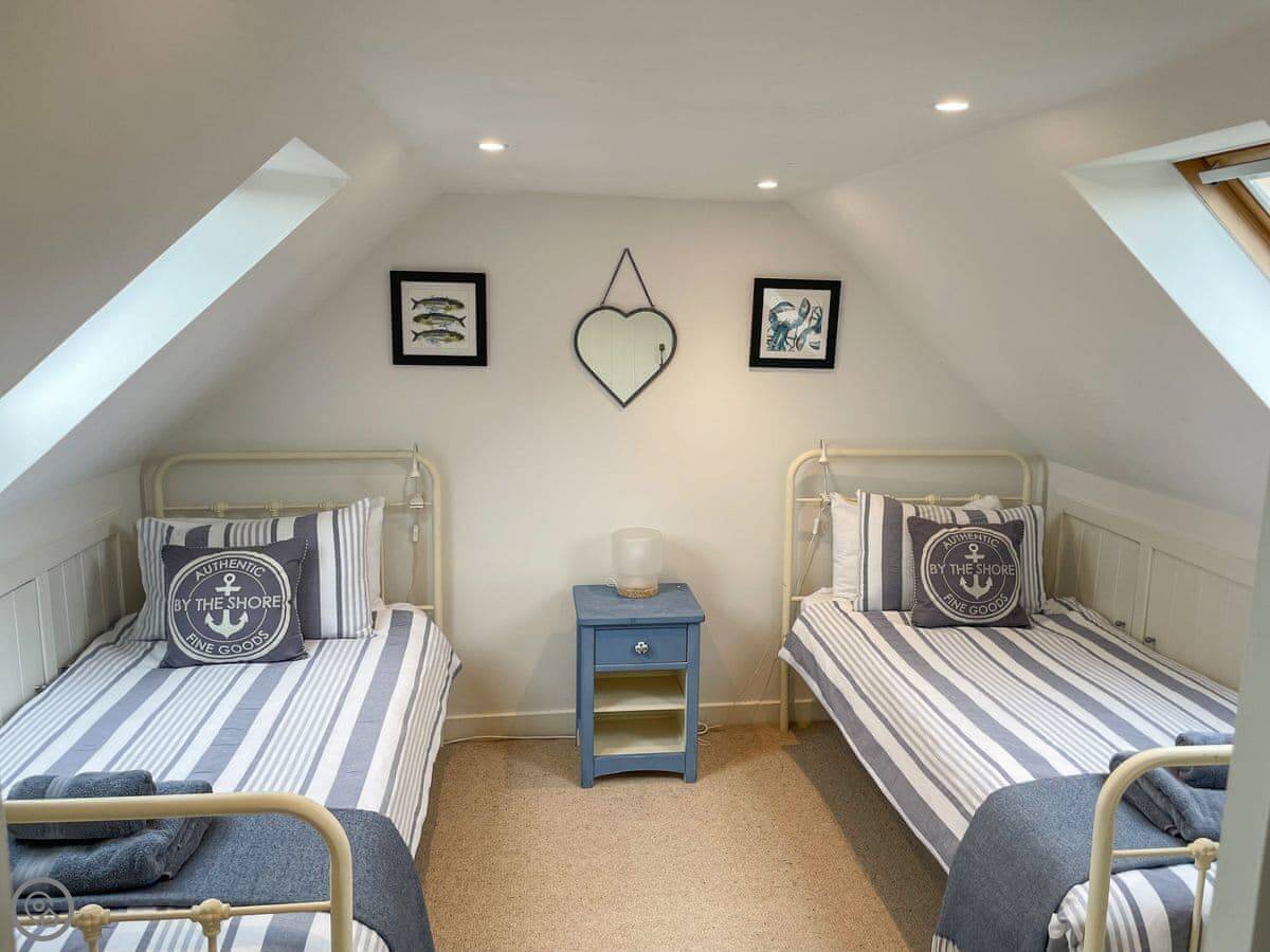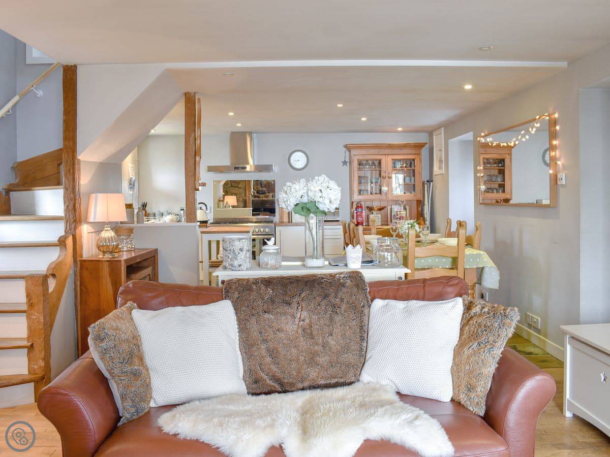 The cottage sleeps four. There are two bedrooms and two bathrooms. It's got a 5 Star rating. It's been done up recently, so everything is in good order. The stairs are unusual, carved like waves. They turn a corner and the handrail is only on one side. Just take your time on them.