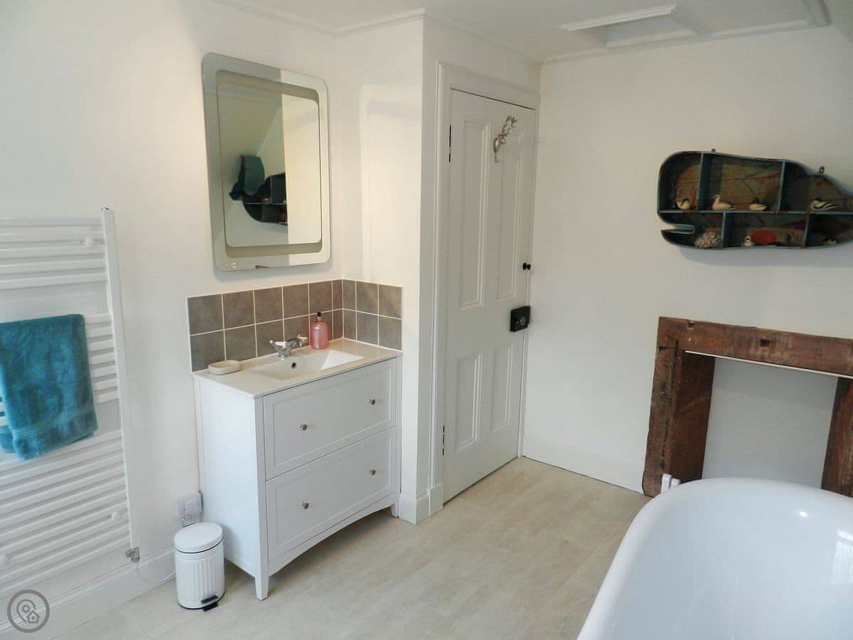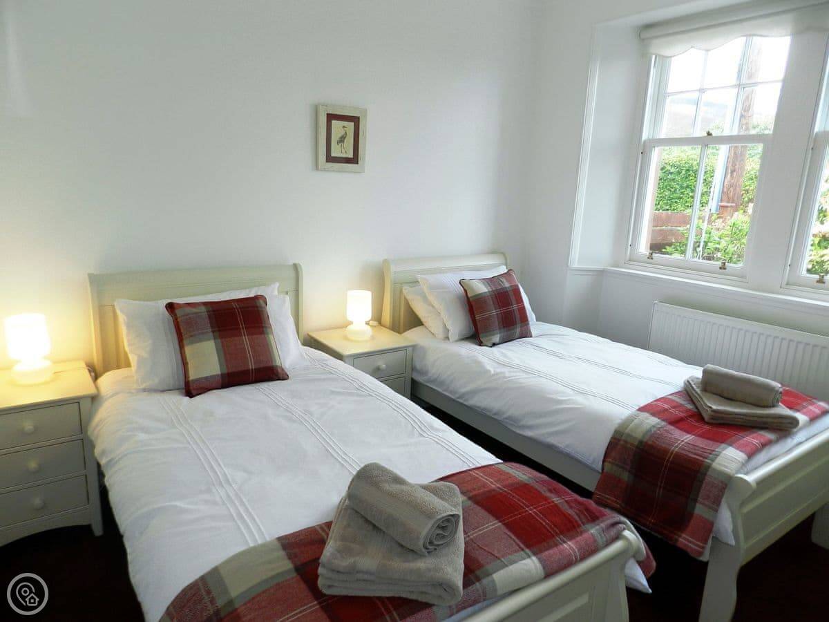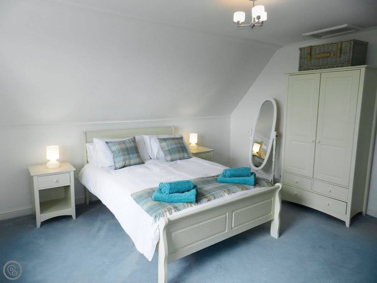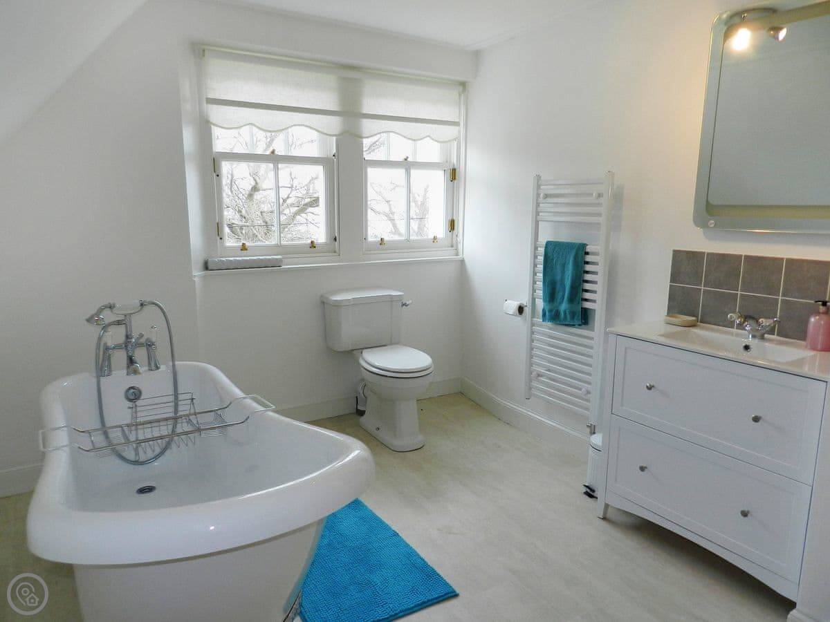 It sleeps six. Three bedrooms, two bathrooms. There's a bedroom and a shower on the ground floor, so it could suit someone who struggles with stairs. The main bathroom upstairs has a roll-top bath. The stairs are normal, not too steep. It's got a 4 Star rating. It's comfortable and clean.