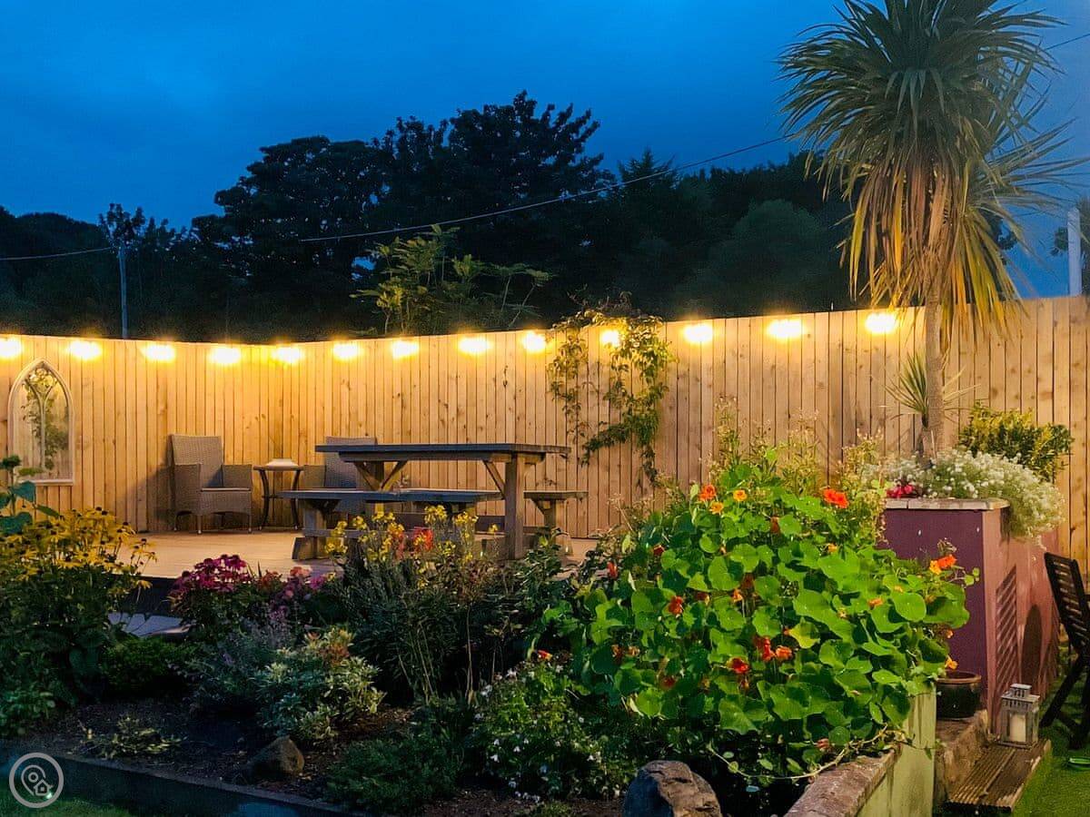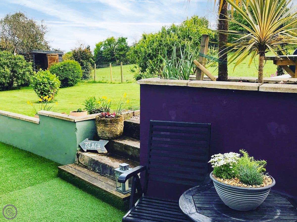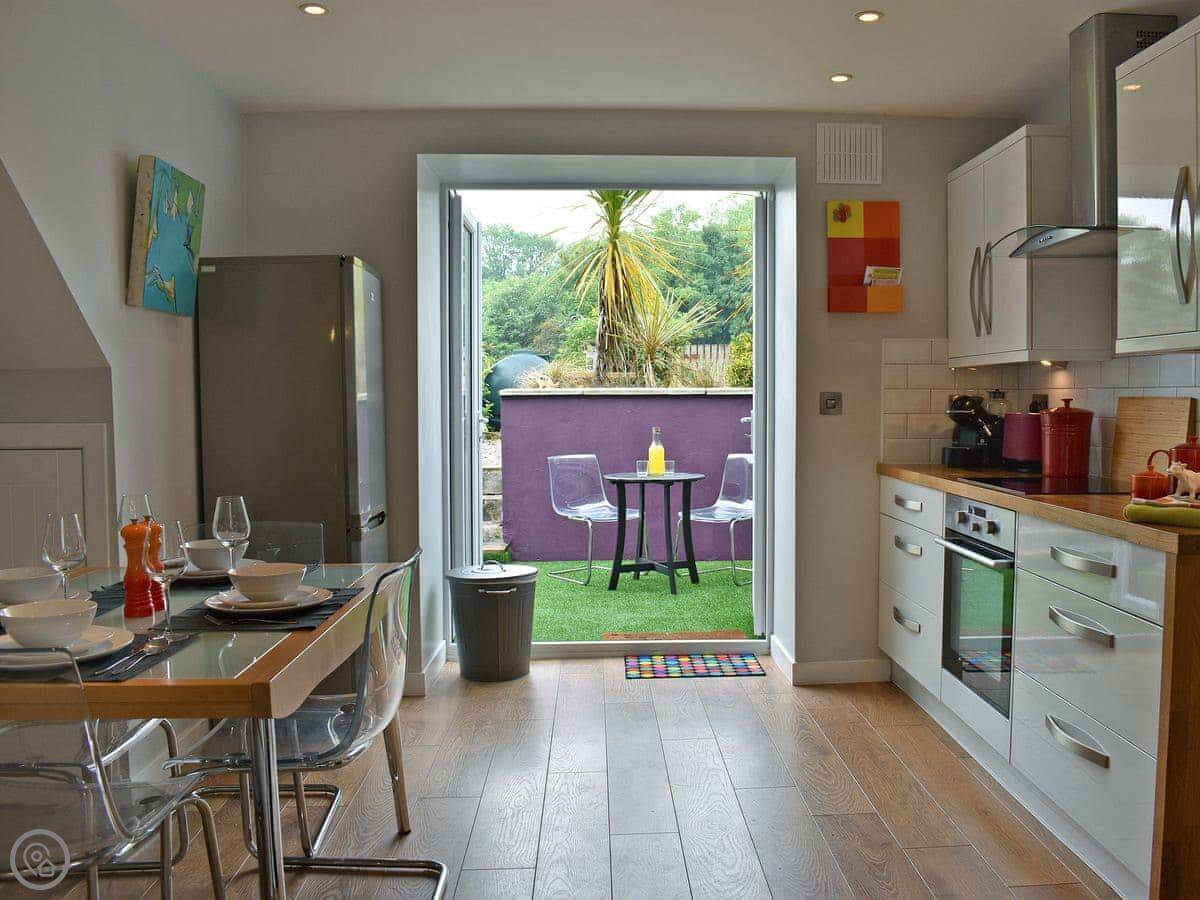 The kitchen has patio doors that open straight into the garden. The garden's enclosed, which is handy. It's got a table and chairs. You look out onto a field. There's a private path from the bottom of the garden that takes you across the road to Sandbraes Park. That's a big open space with a play area, and it leads right down to the beach. The beach is about five minutes' walk.