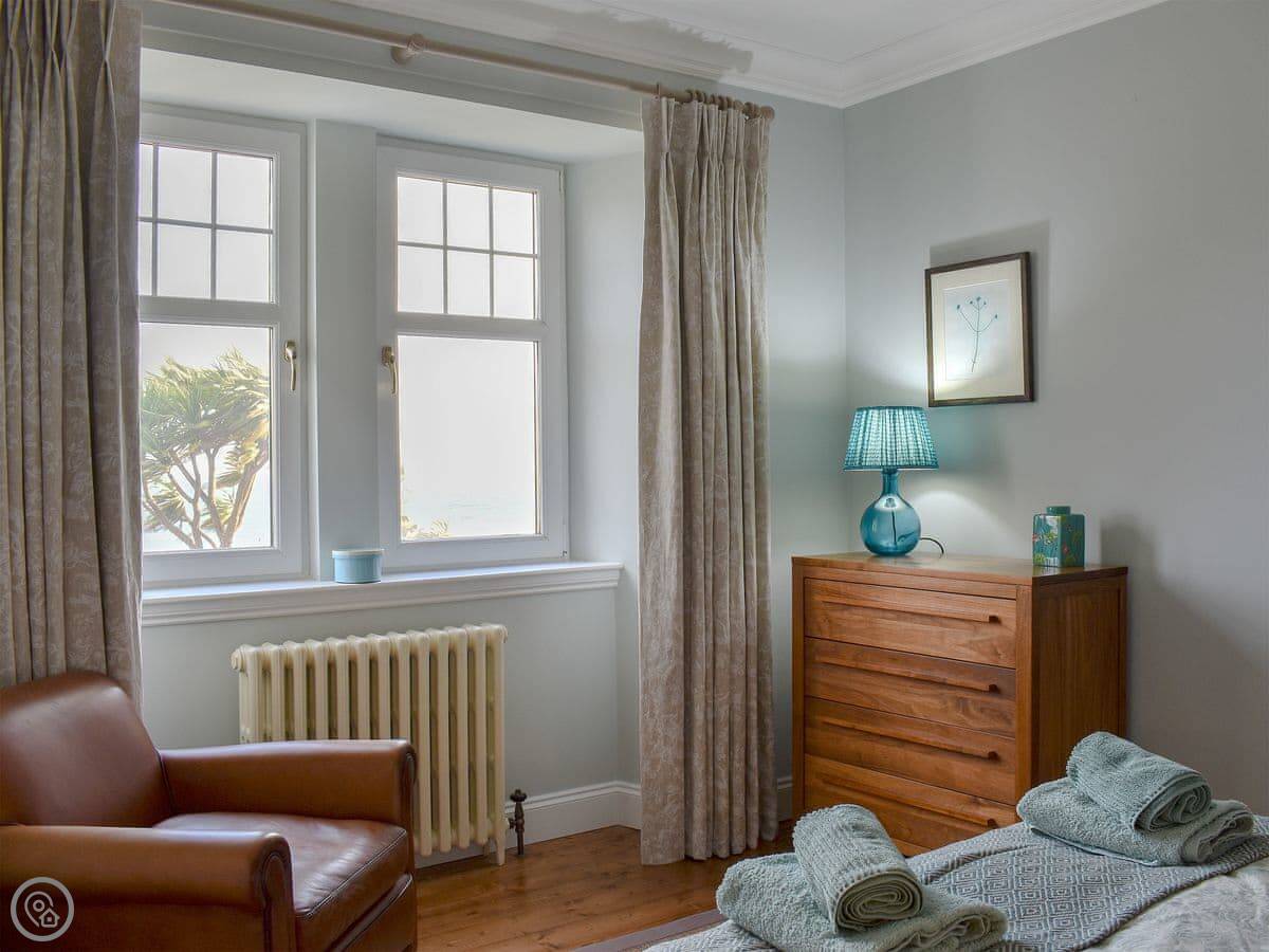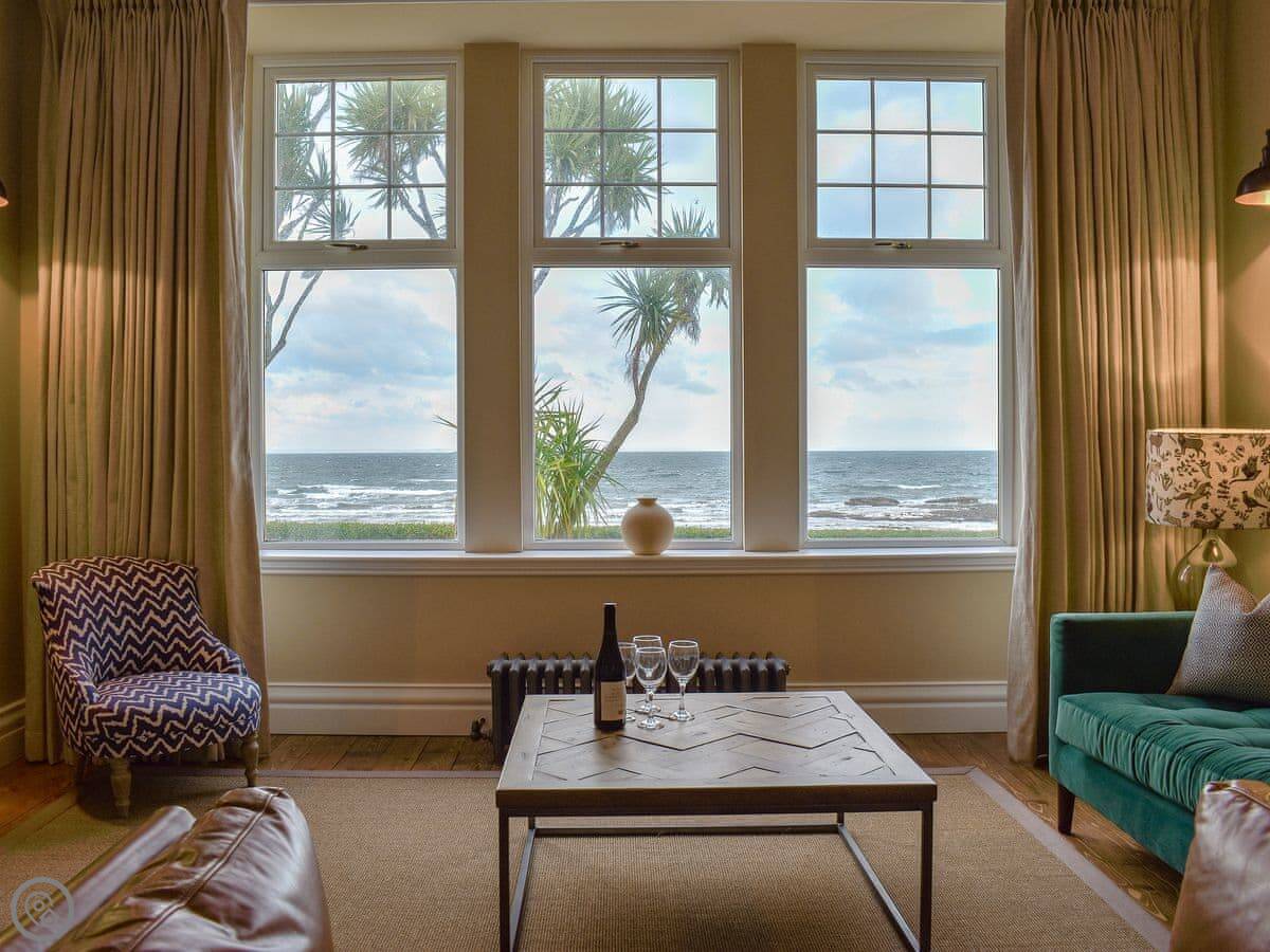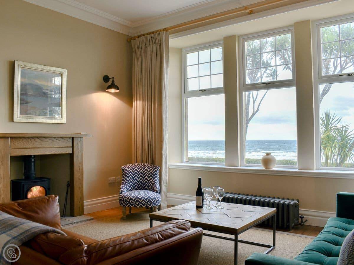 Inside, there's plenty of space to spread out. Two main living rooms at the front for the view, a family room off the kitchen, and a separate TV room with a wood burner. The dining room and kitchen also look out to sea. There's a downstairs bedroom which might suit someone who doesn't want to tackle the stairs. The staircase in the hall is the original one, it's quite grand.
