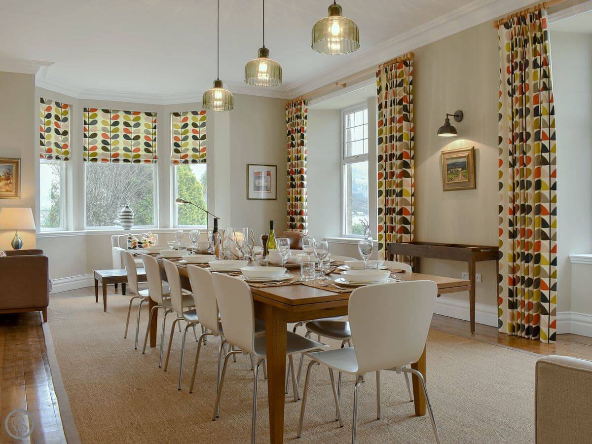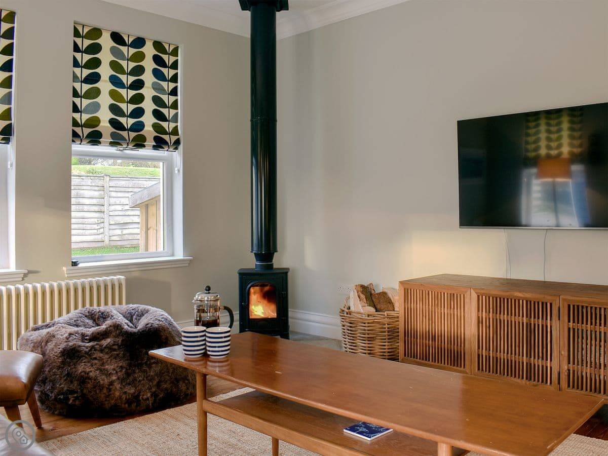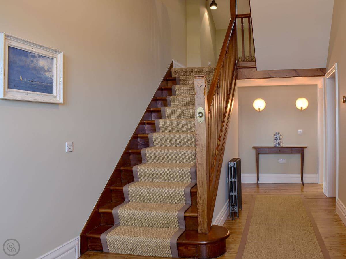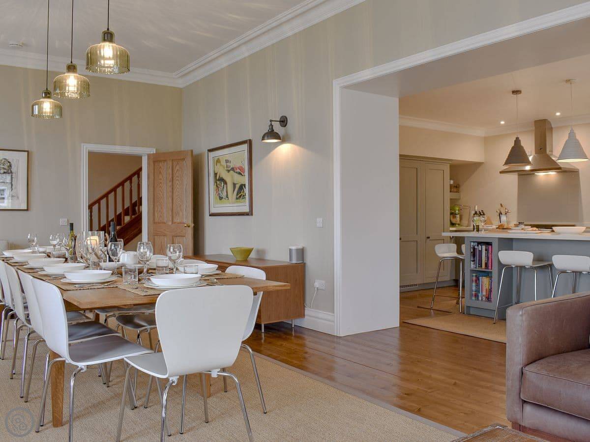 Inside, there's plenty of space to spread out. Two main living rooms at the front for the view, a family room off the kitchen, and a separate TV room with a wood burner. The dining room and kitchen also look out to sea. There's a downstairs bedroom which might suit someone who doesn't want to tackle the stairs. The staircase in the hall is the original one, it's quite grand.