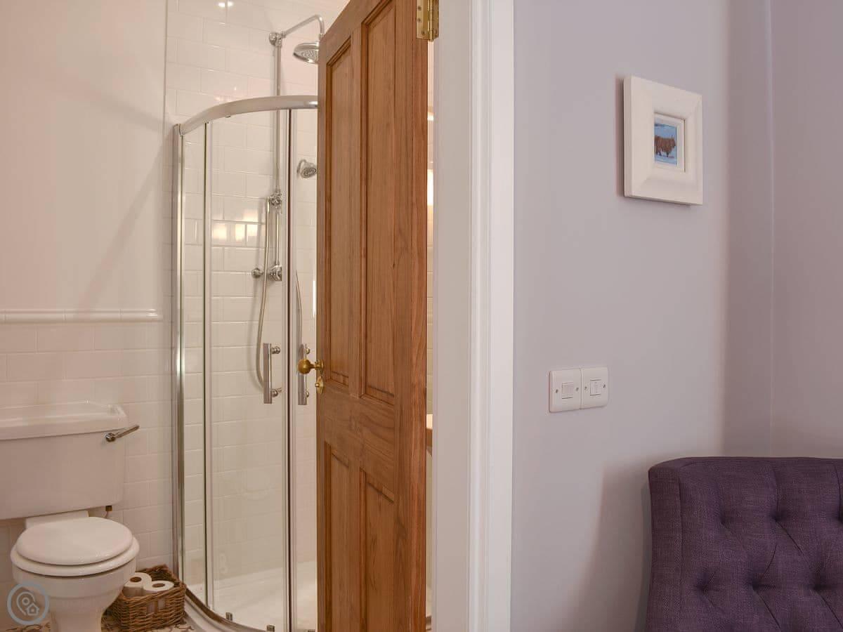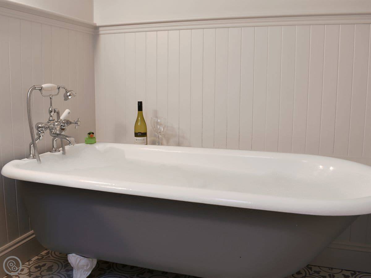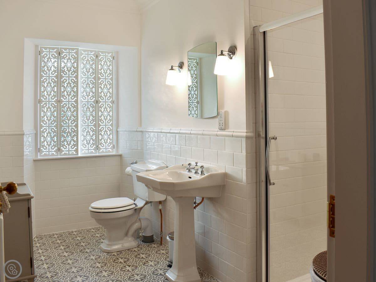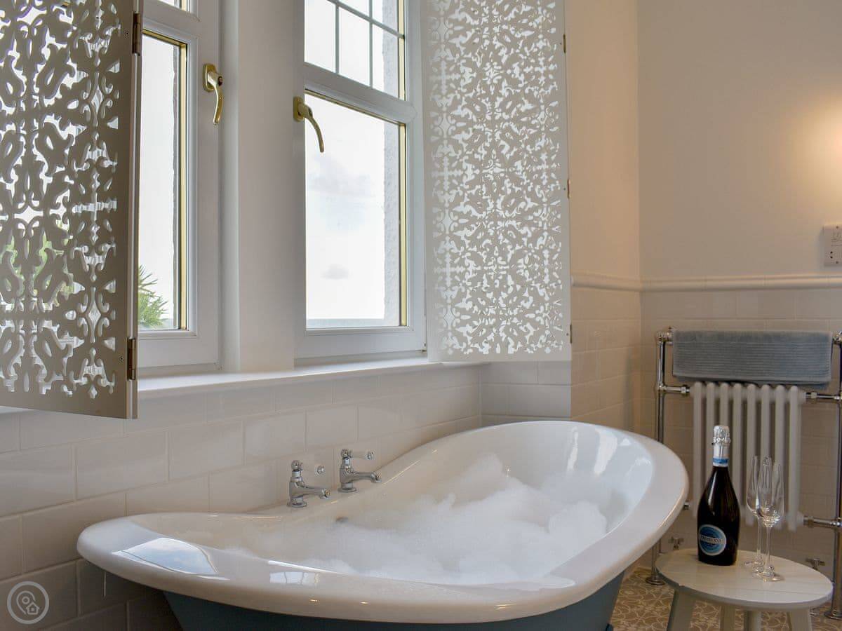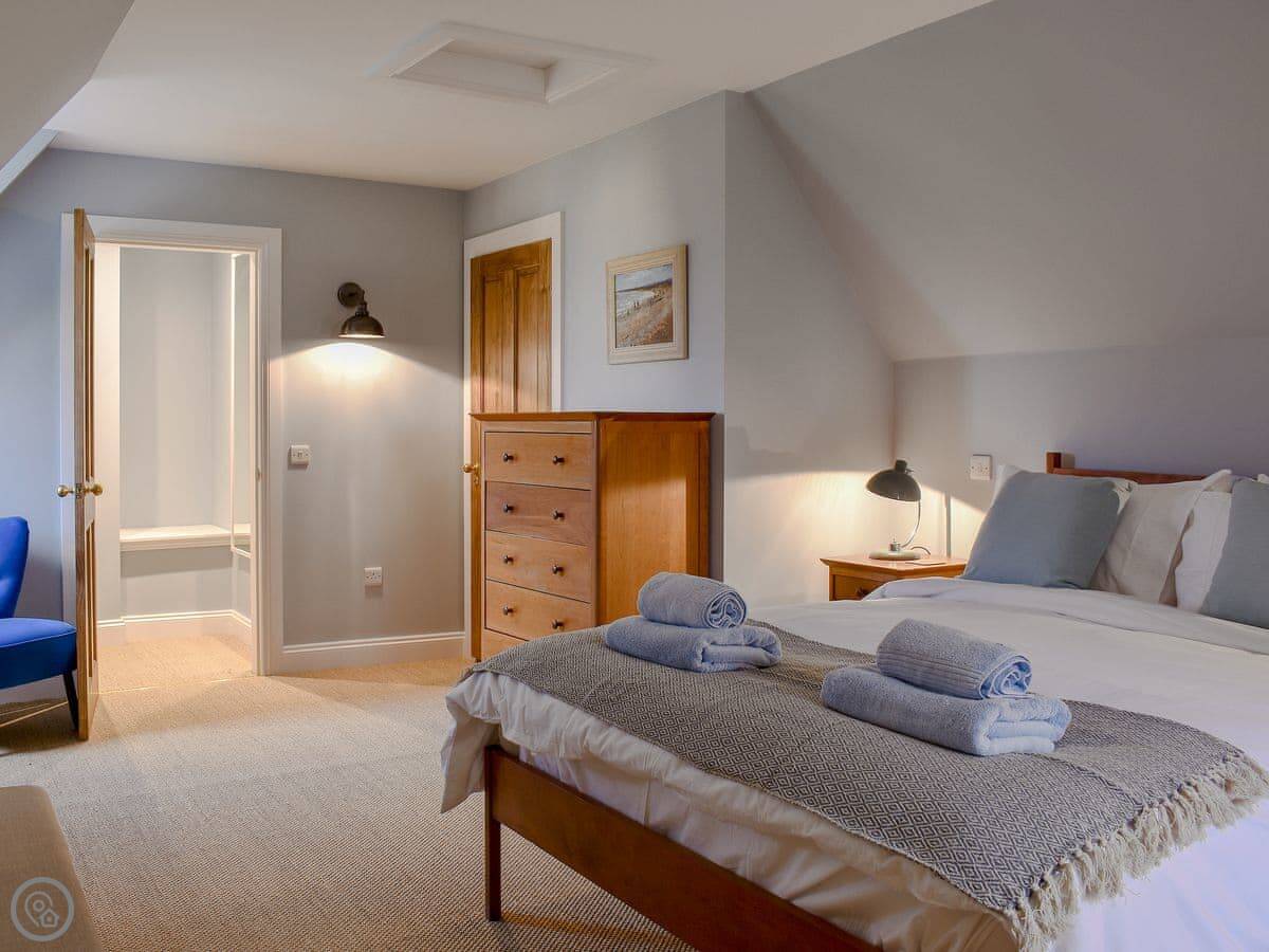 It sleeps twelve people. Six bedrooms, eight bathrooms. It's a 5 Star place, which means it's been done up to a high standard. Everything feels finished and considered. All the bedrooms have their own en-suite shower room, and one has a freestanding bath too. There's also a separate family bathroom with a roll-top bath.