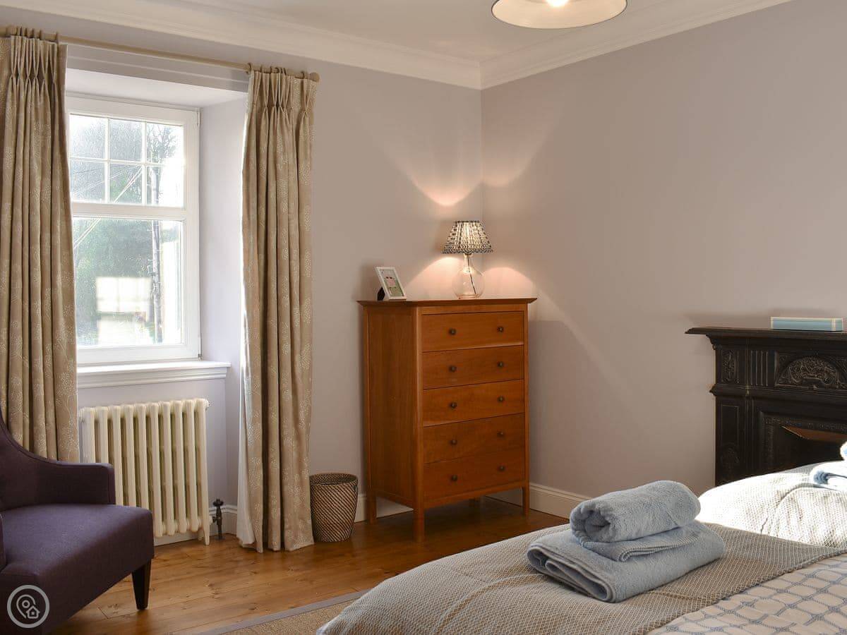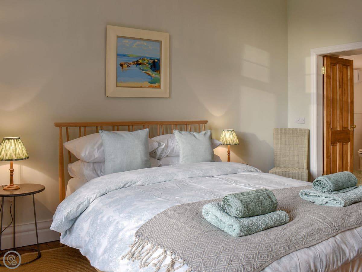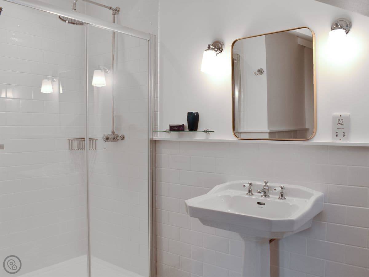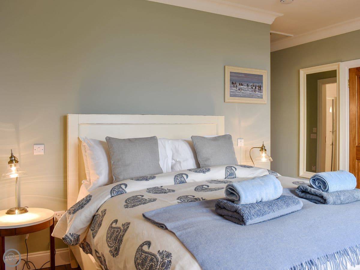 It sleeps twelve people. Six bedrooms, eight bathrooms. It's a 5 Star place, which means it's been done up to a high standard. Everything feels finished and considered. All the bedrooms have their own en-suite shower room, and one has a freestanding bath too. There's also a separate family bathroom with a roll-top bath.