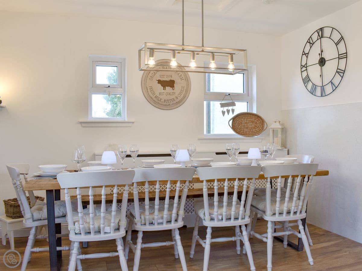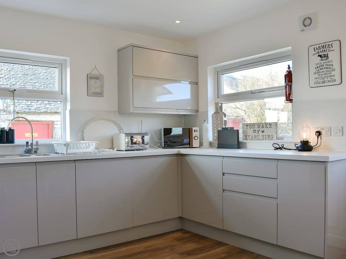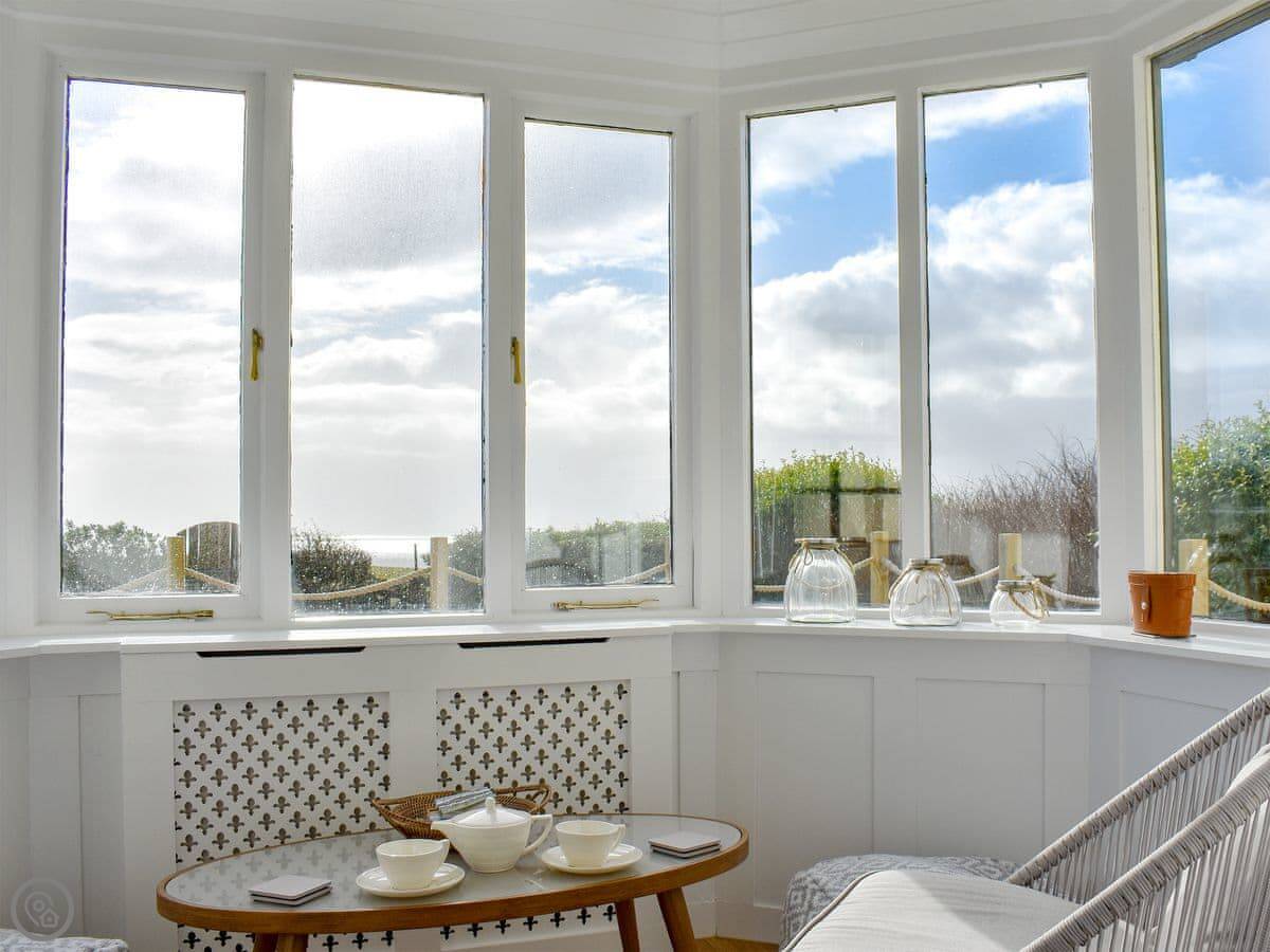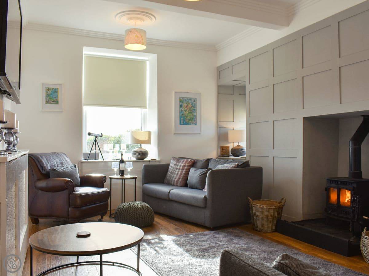 The main living room has a wood burner. The kitchen is big enough for everyone to eat together. There's a sun room out the back that opens onto a decked area. You can sit out there if the weather's good.