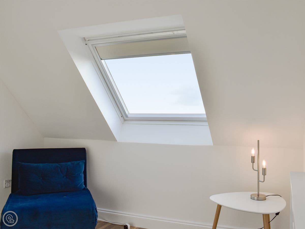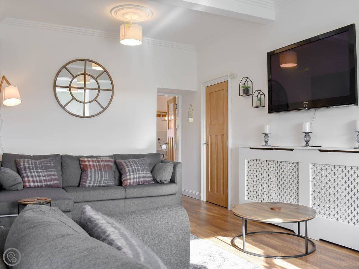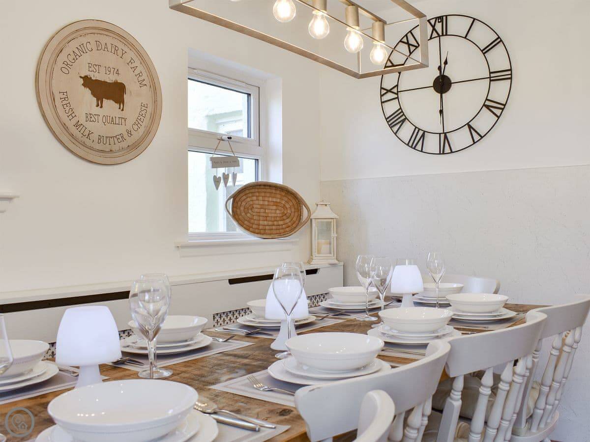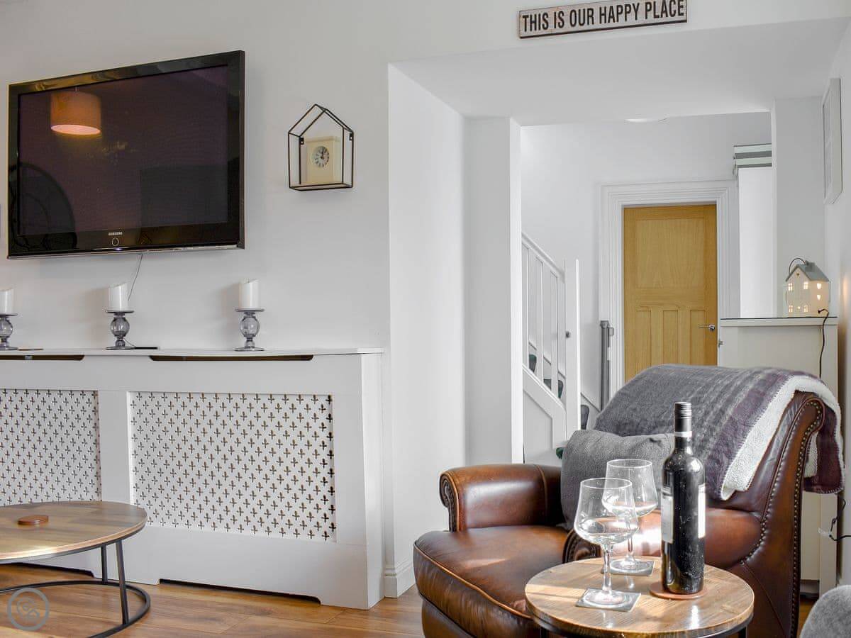 The main living room has a wood burner. The kitchen is big enough for everyone to eat together. There's a sun room out the back that opens onto a decked area. You can sit out there if the weather's good.