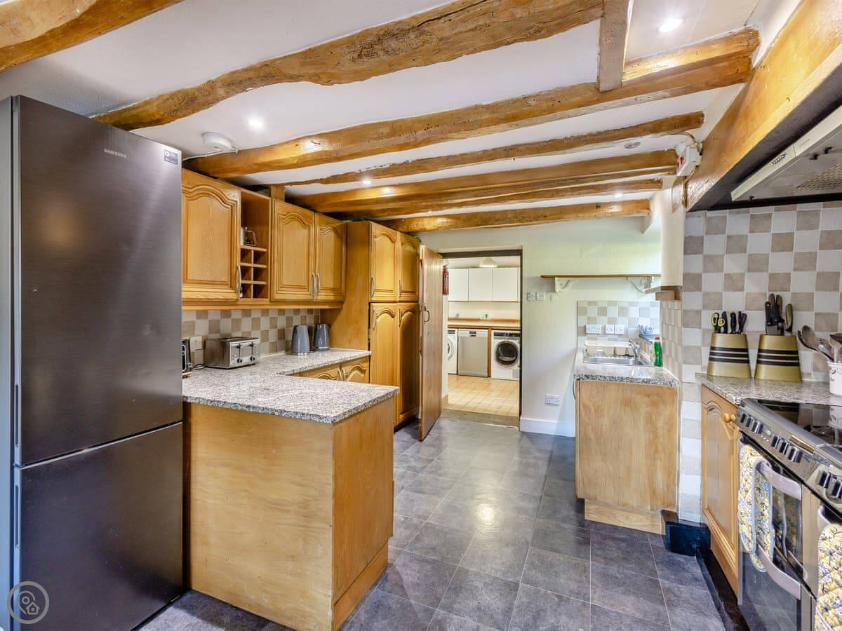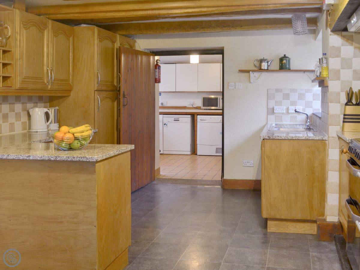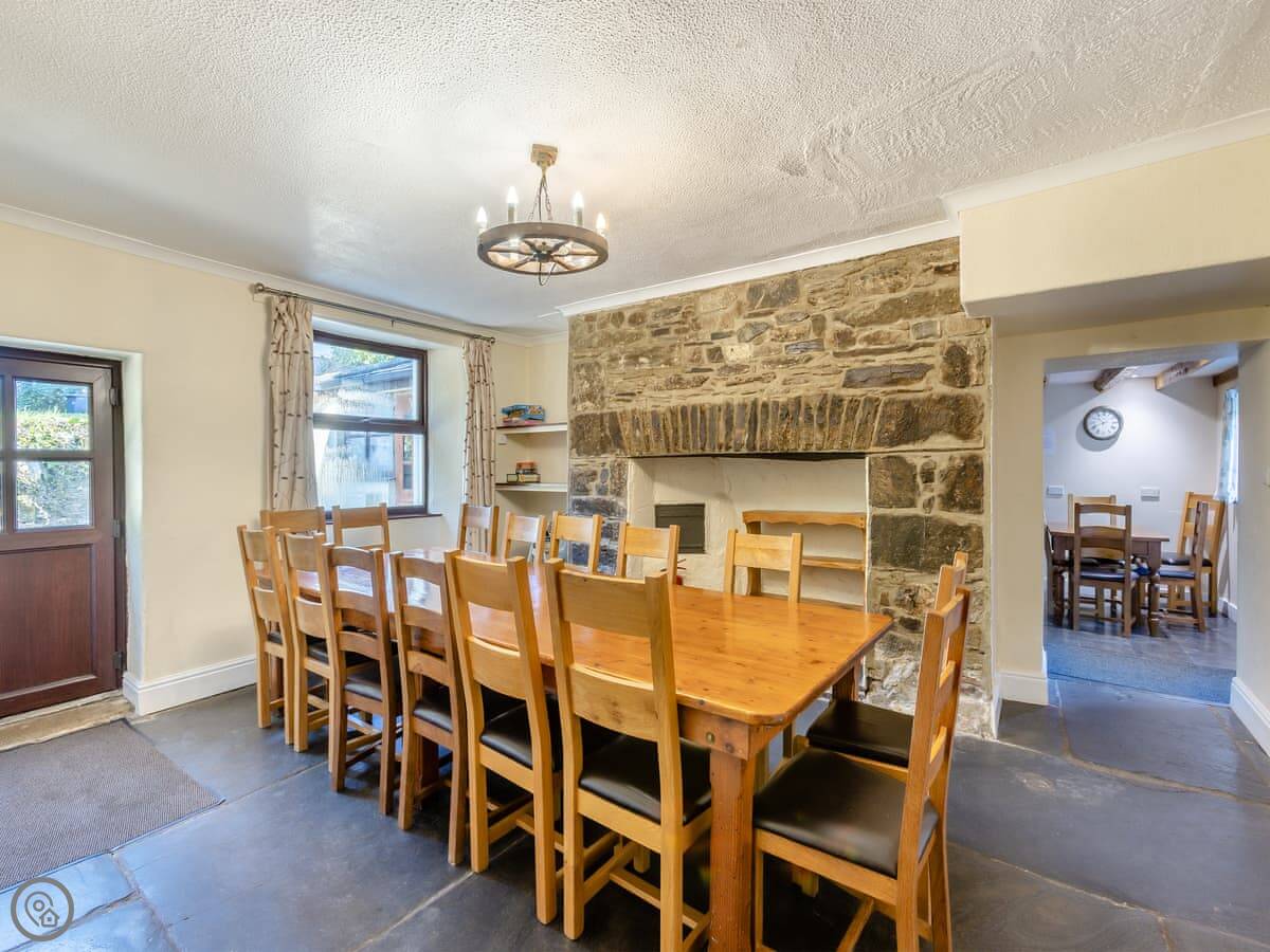 For facilities, it's got what you'd need for a big group. Washing machine, dishwasher, woodburning stove, WiFi, TV. Bedding is included. There's on-site parking. You can bring up to two dogs.