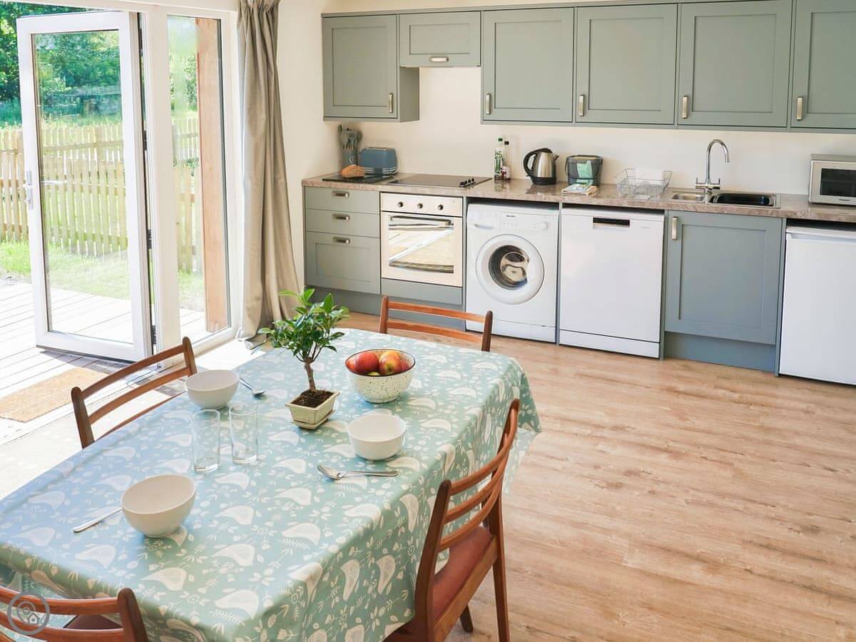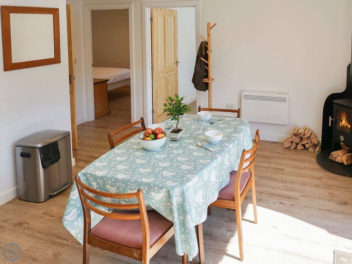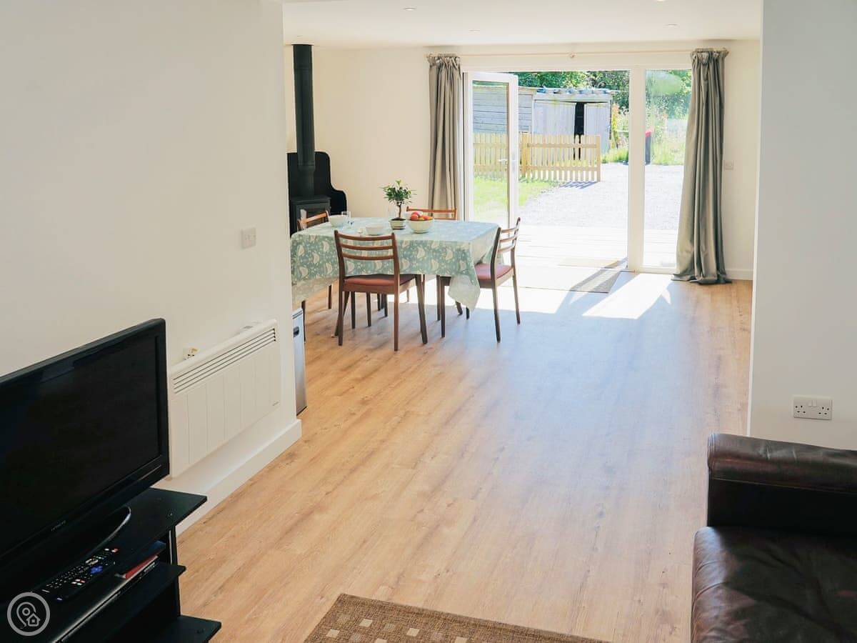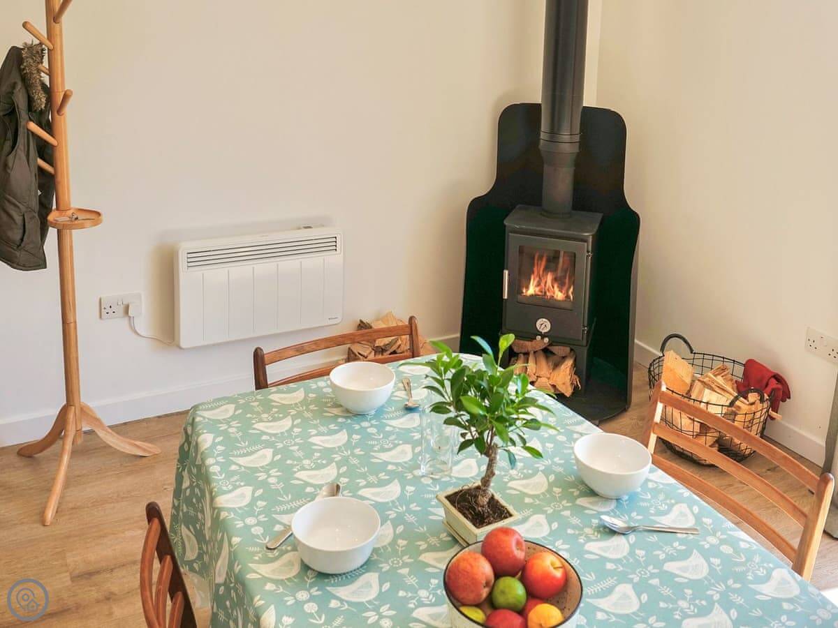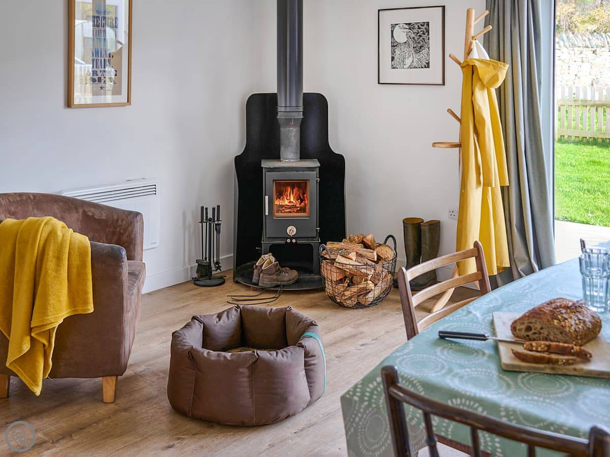 Inside, it's open plan. There's a woodburning stove, a TV, a washing machine, and a dishwasher. Bedding and towels are included. We can provide a cot and highchair.