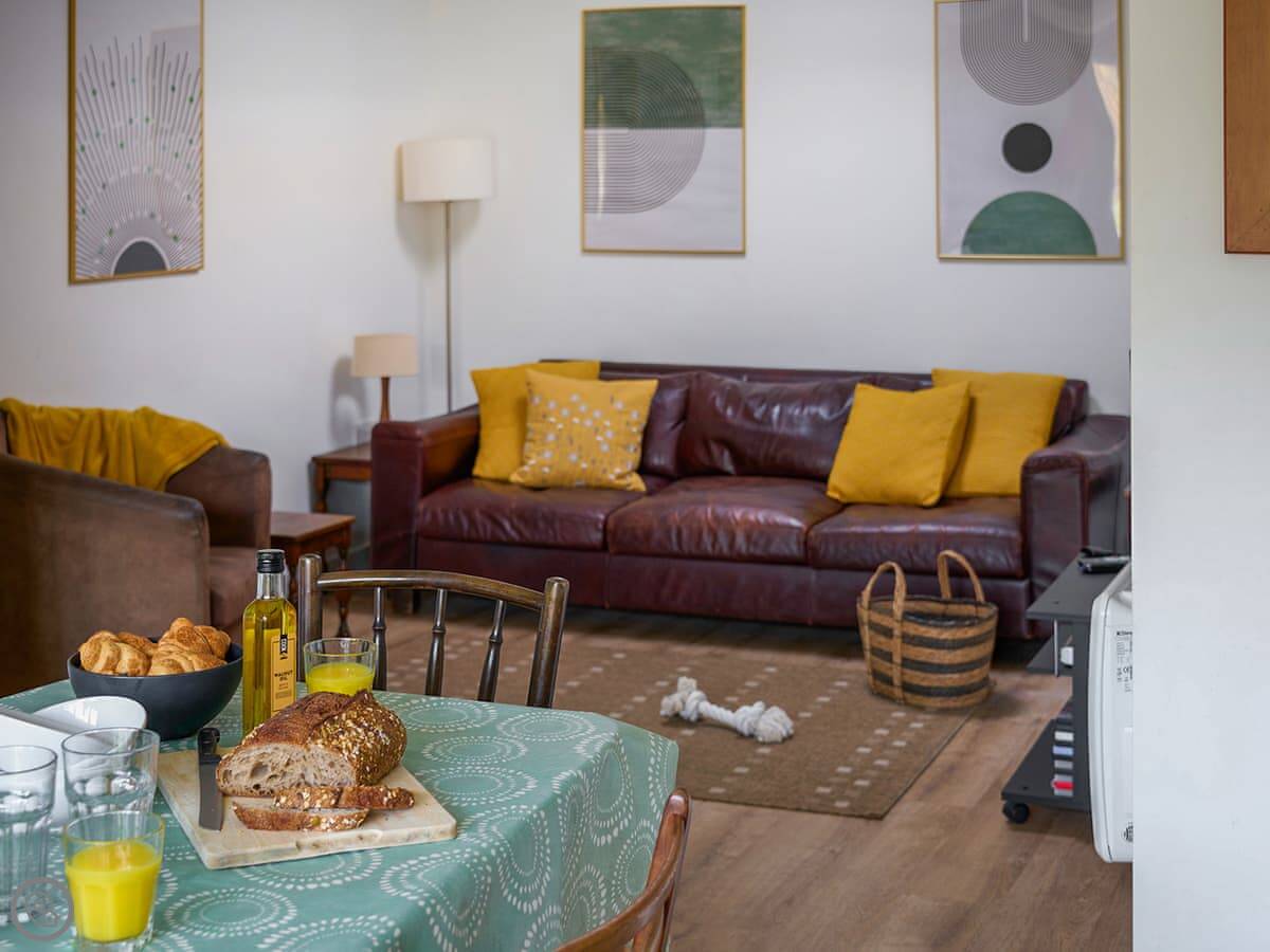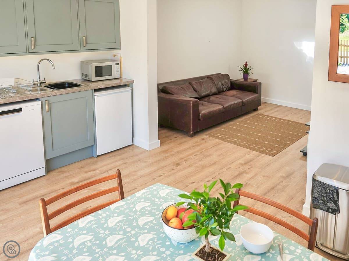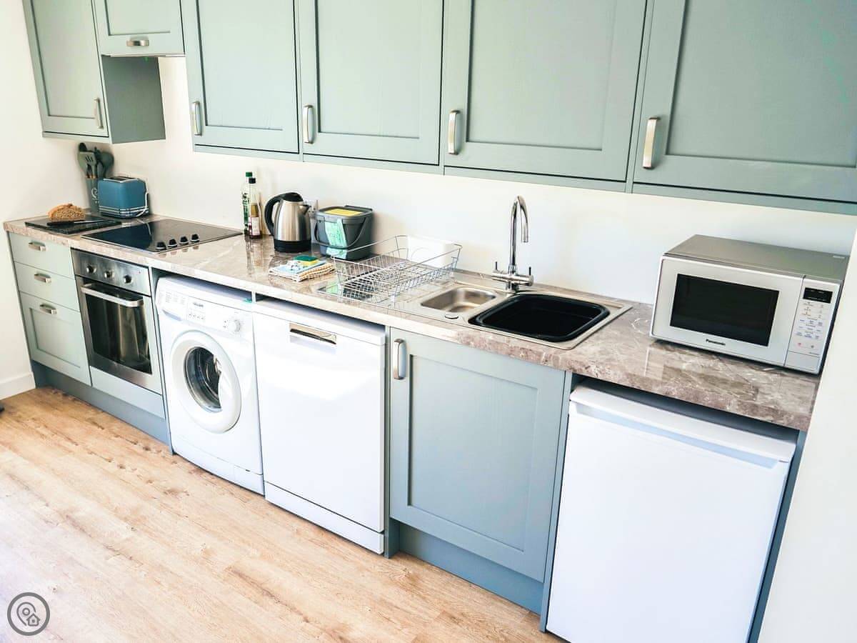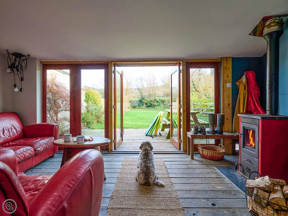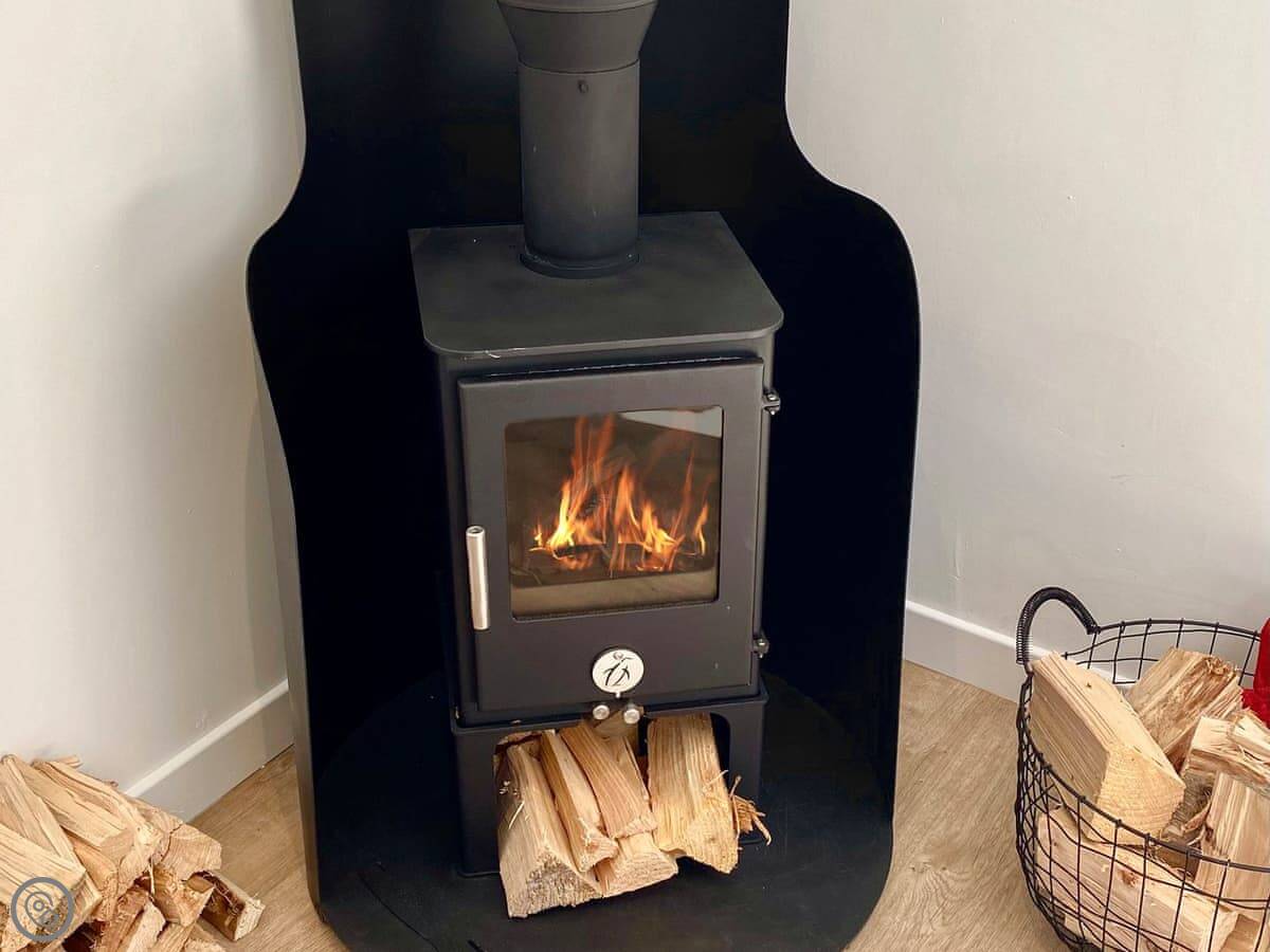 Inside, it's open plan. There's a woodburning stove, a TV, a washing machine, and a dishwasher. Bedding and towels are included. We can provide a cot and highchair.