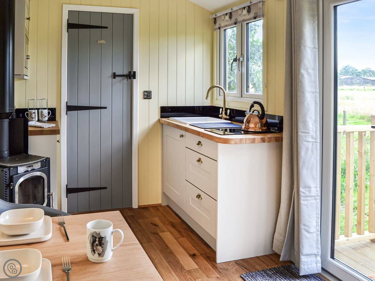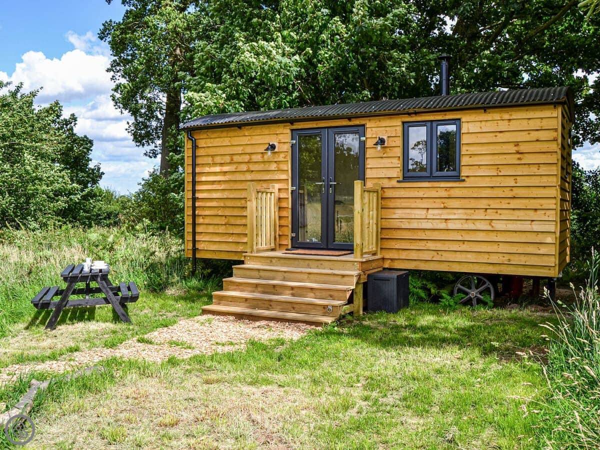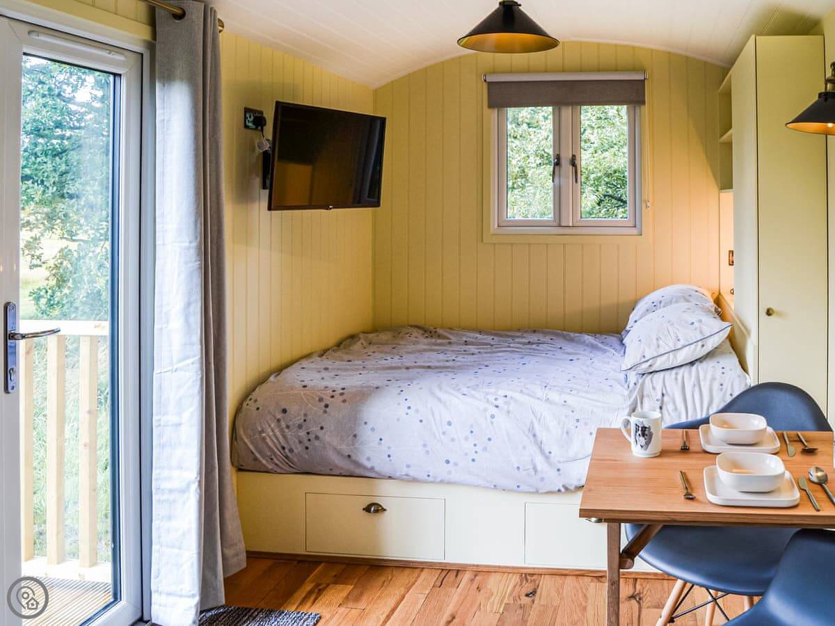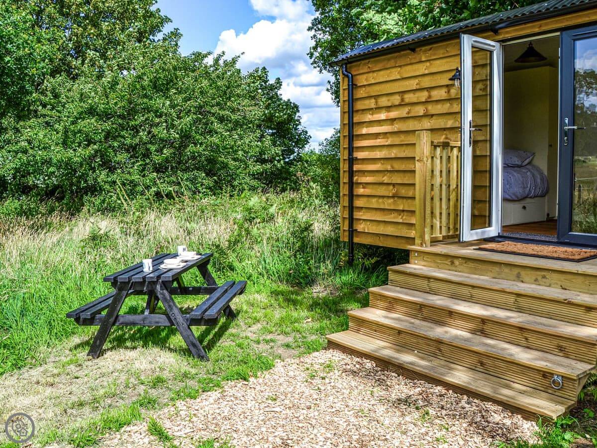 It feels quite new inside. It's got a woodburning stove, which is good for cooler evenings. There's a patio area with a garden table. You can park right next to it.