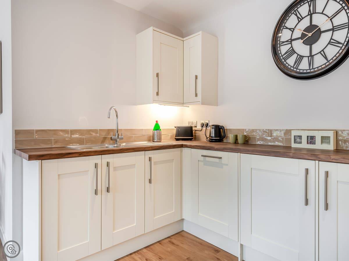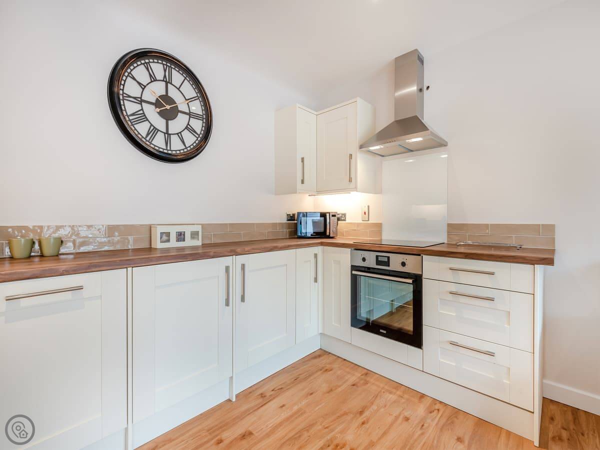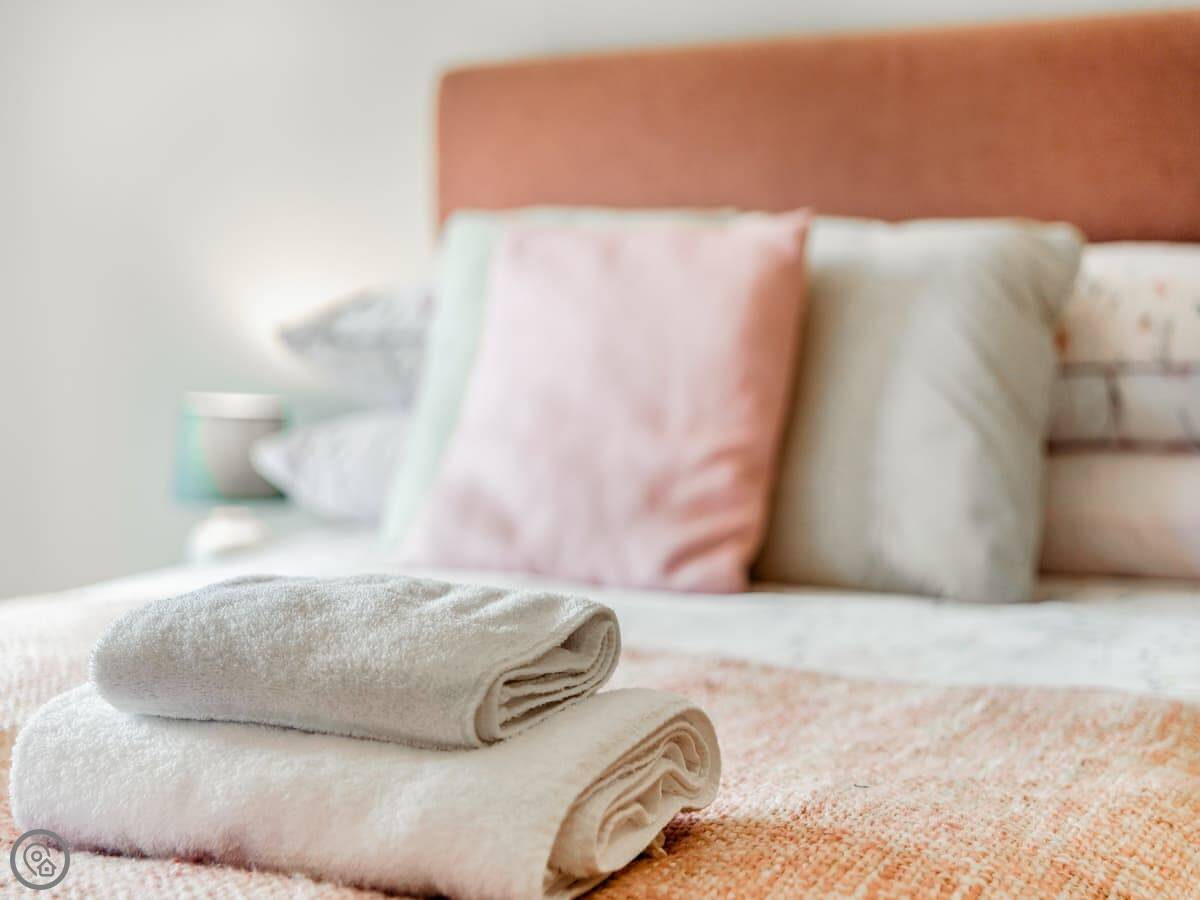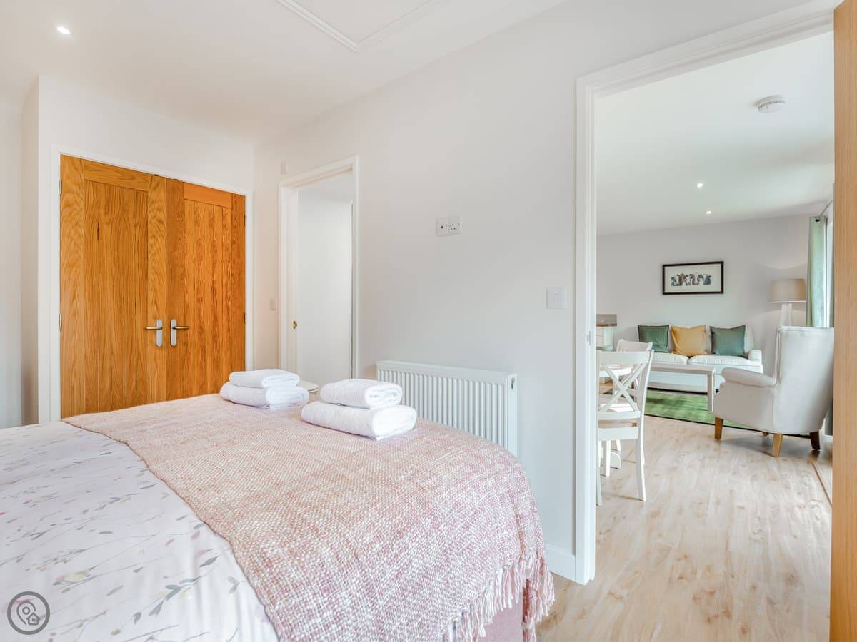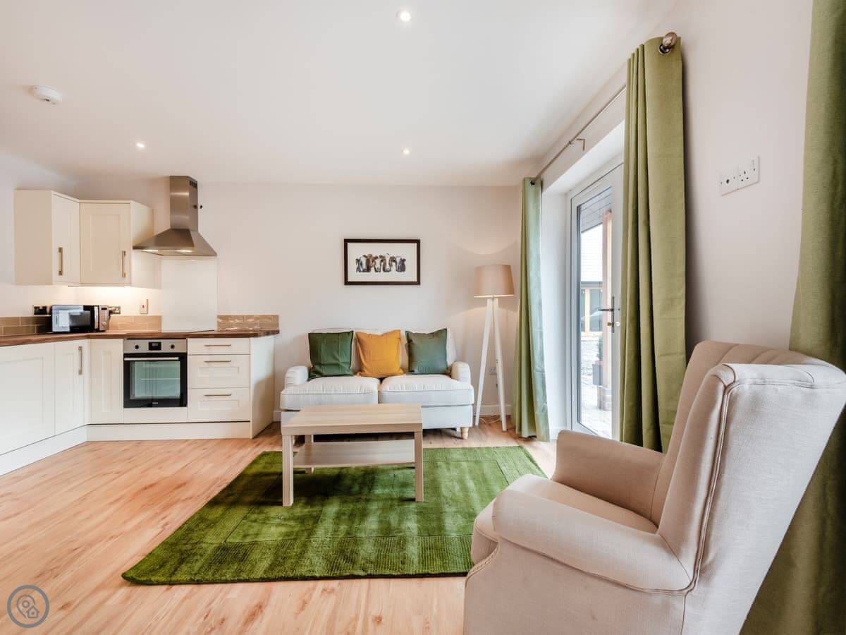 The layout is open plan. There's a kitchen area with a dishwasher and washing machine. The sofa and TV are in the same room. The bedroom has an en-suite shower room with a walk-in shower. All bedding and towels are included.