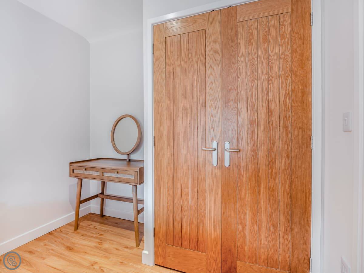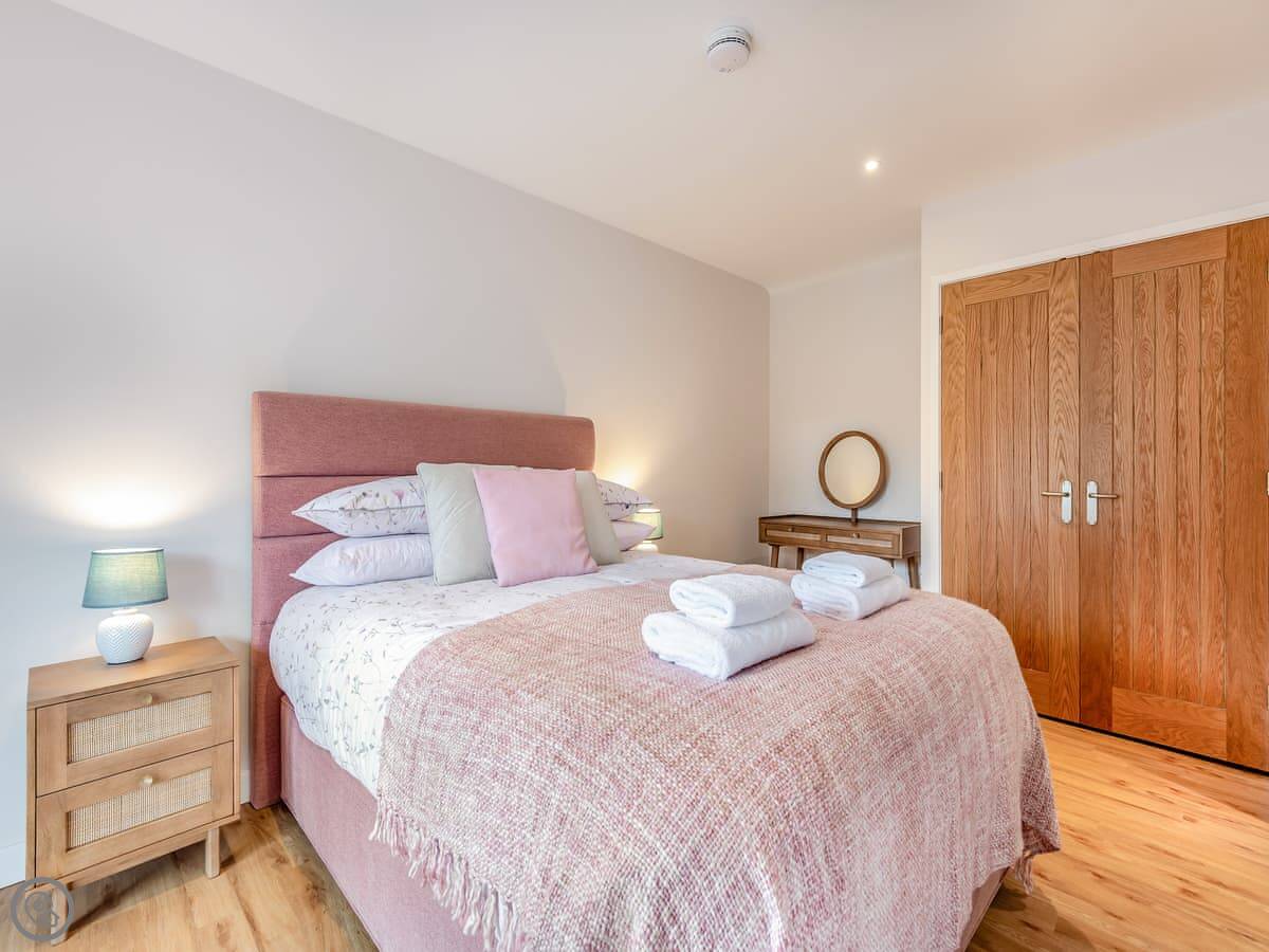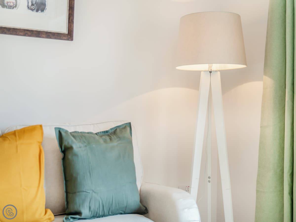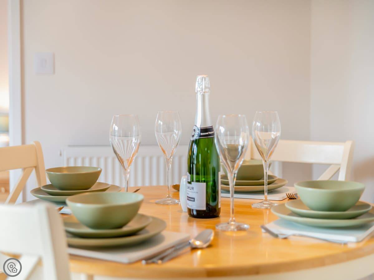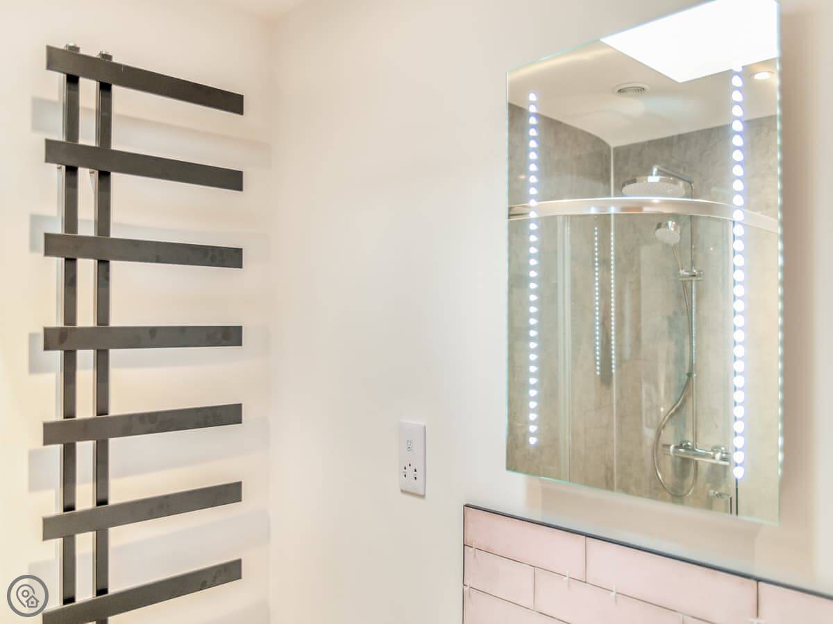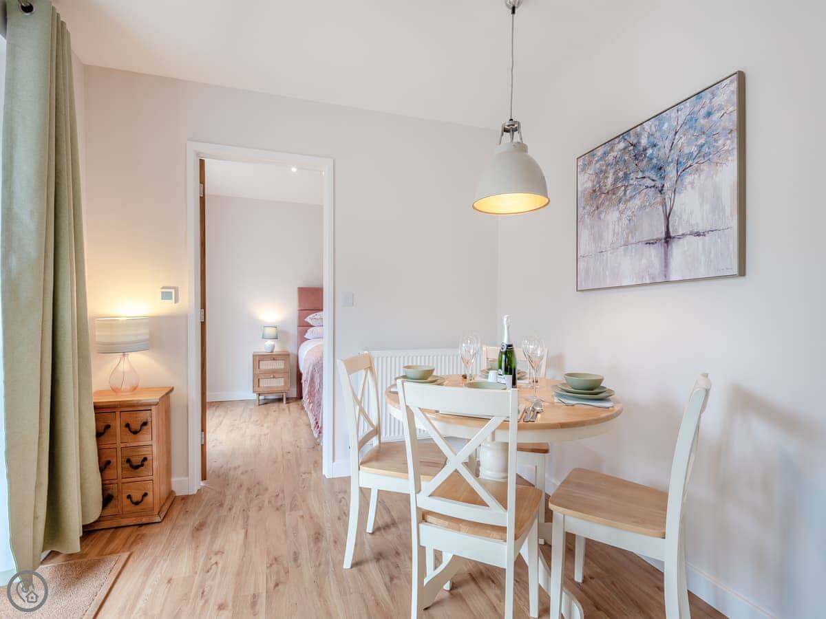 The layout is open plan. There's a kitchen area with a dishwasher and washing machine. The sofa and TV are in the same room. The bedroom has an en-suite shower room with a walk-in shower. All bedding and towels are included.