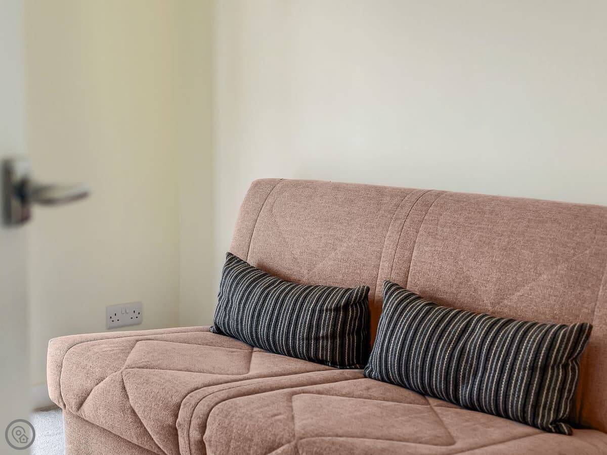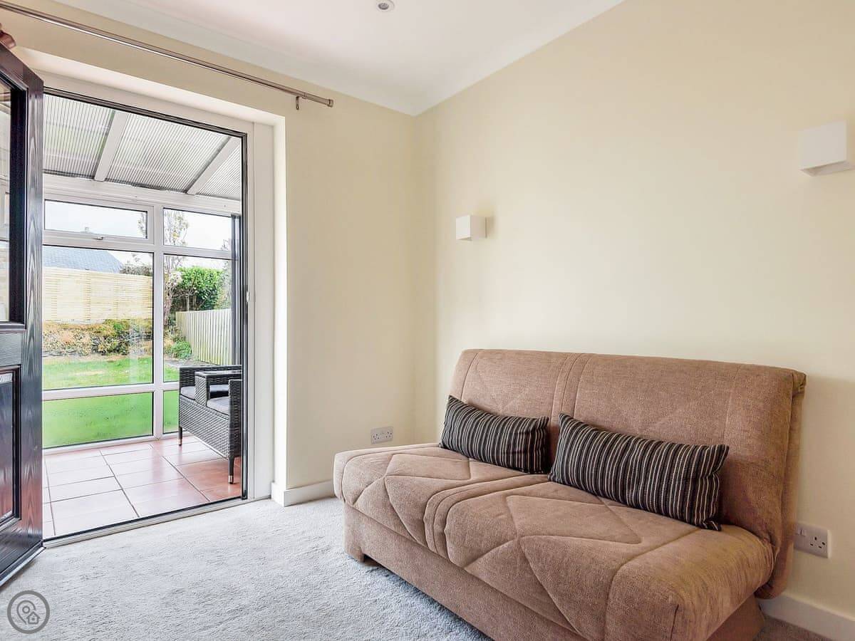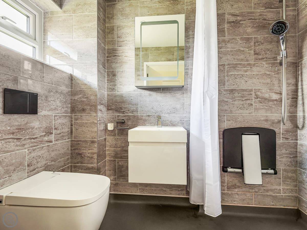 Set to the rear of the property looking over the garden, is a large bedroom with an electric split rising king-size bed and there is also a wall mounted Smart TV. Next to the bedroom is a further room which has a sofa bed, perhaps for an extra guest to use if required. This room can be used as a study and provides access to the conservatory, which has some seating. There is a wide doorway out to the decking and garden. Across the hall is a spacious walk-in wet room with rain shower, ideal wheelchair access or for guests with restricted mobility.