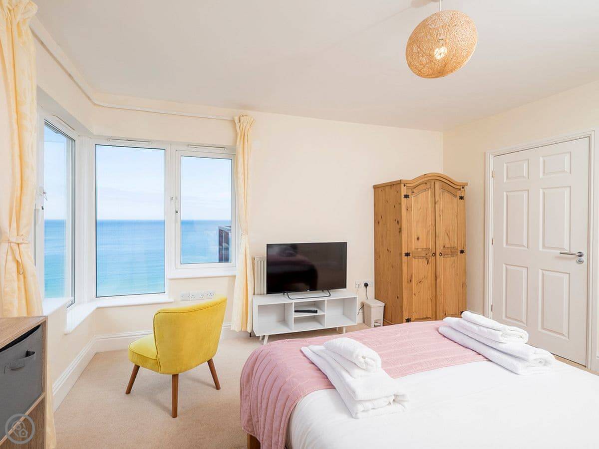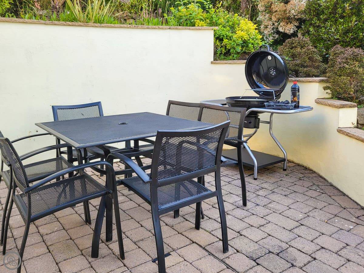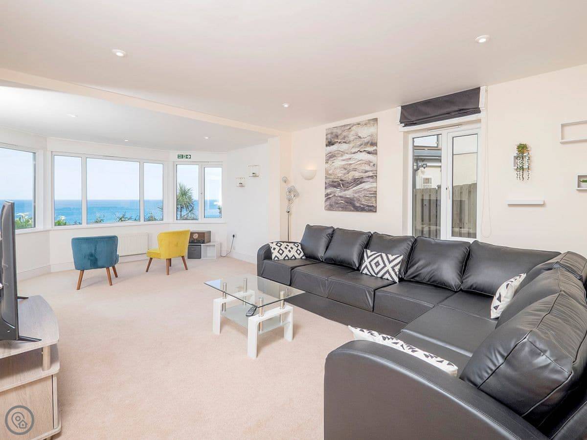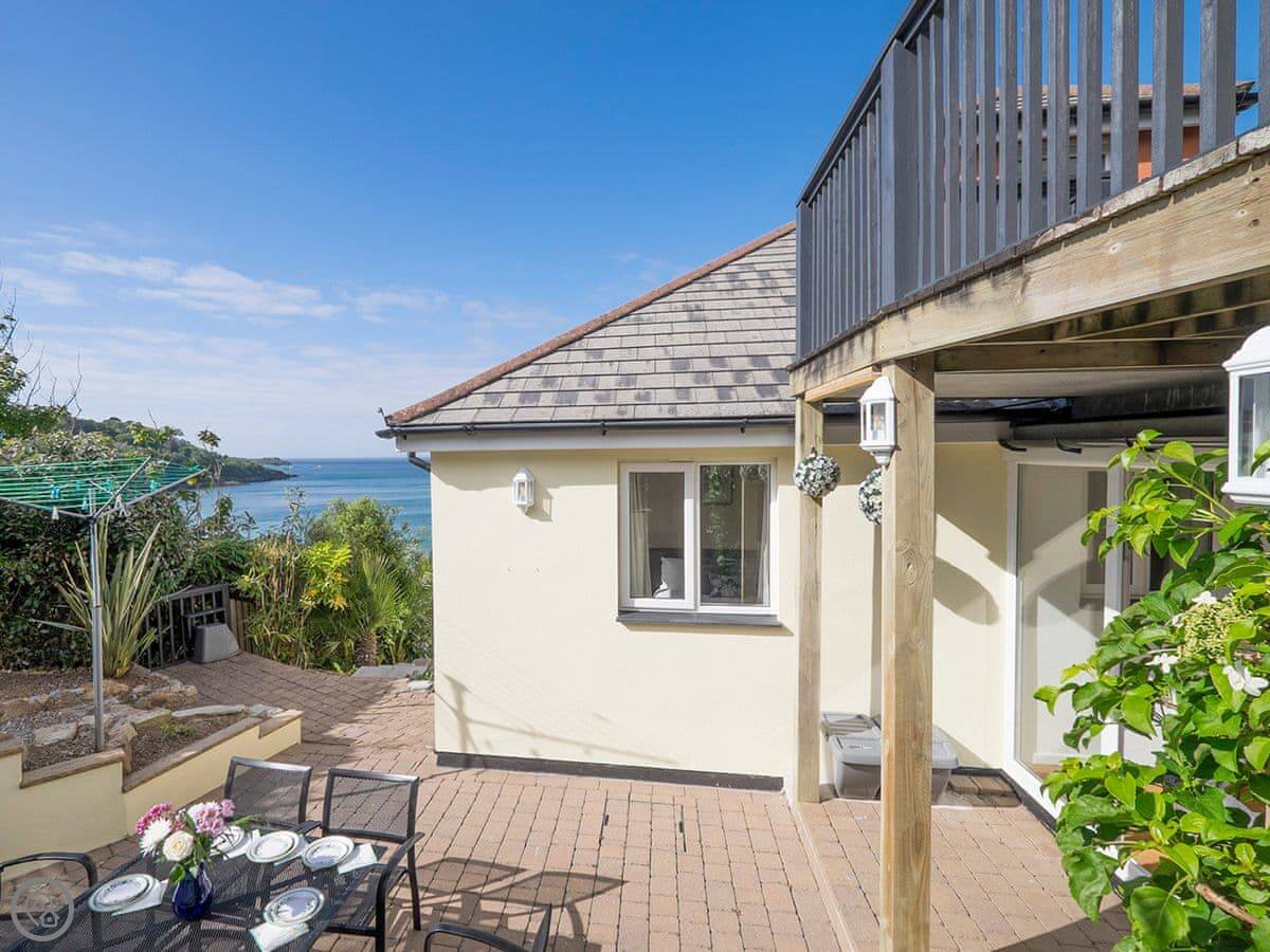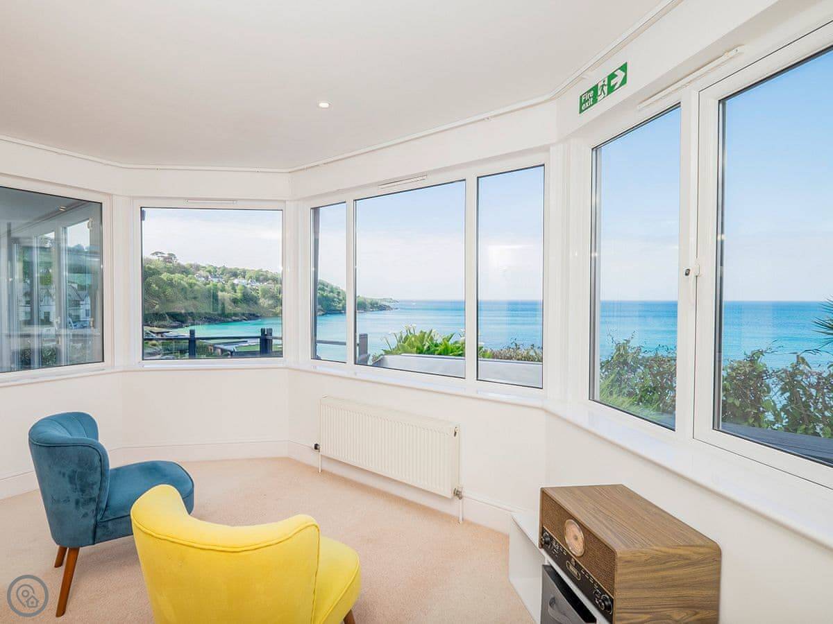 The sun room at the front is enclosed, you can sit in there any time. It has the hot tub. The view from there is straight out to sea. The garden has seating too.
