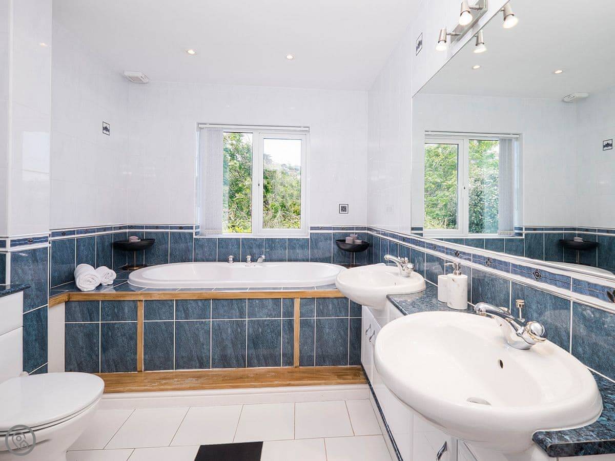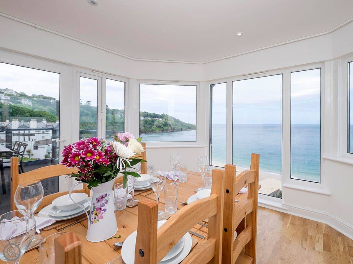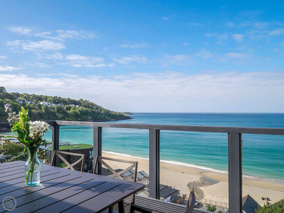 Glas Mordros is in Carbis Bay. It's detached and set back on the hill so you get the view over the bay. It sleeps twelve. Six bedrooms, four bathrooms.