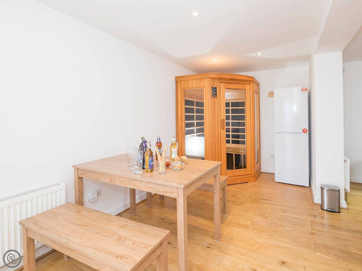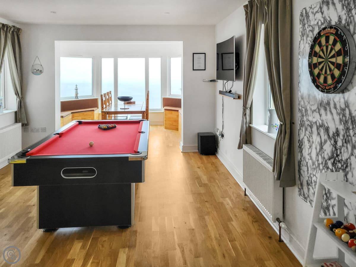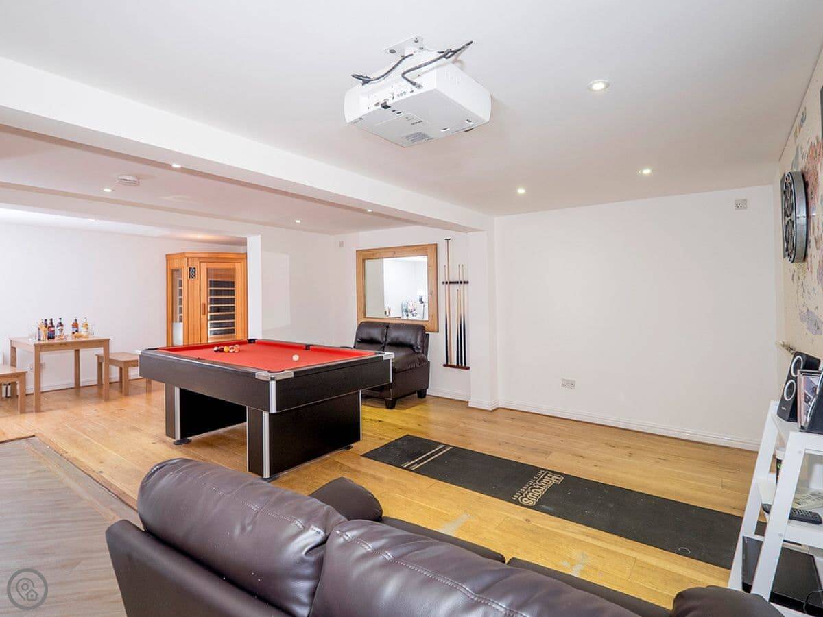 Inside, it's got what you'd expect: a dishwasher, washing machine, proper TV and wifi. The games room is in the garage conversion. Parking for three cars on the drive.