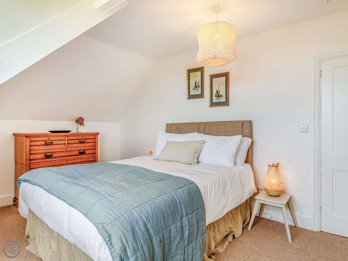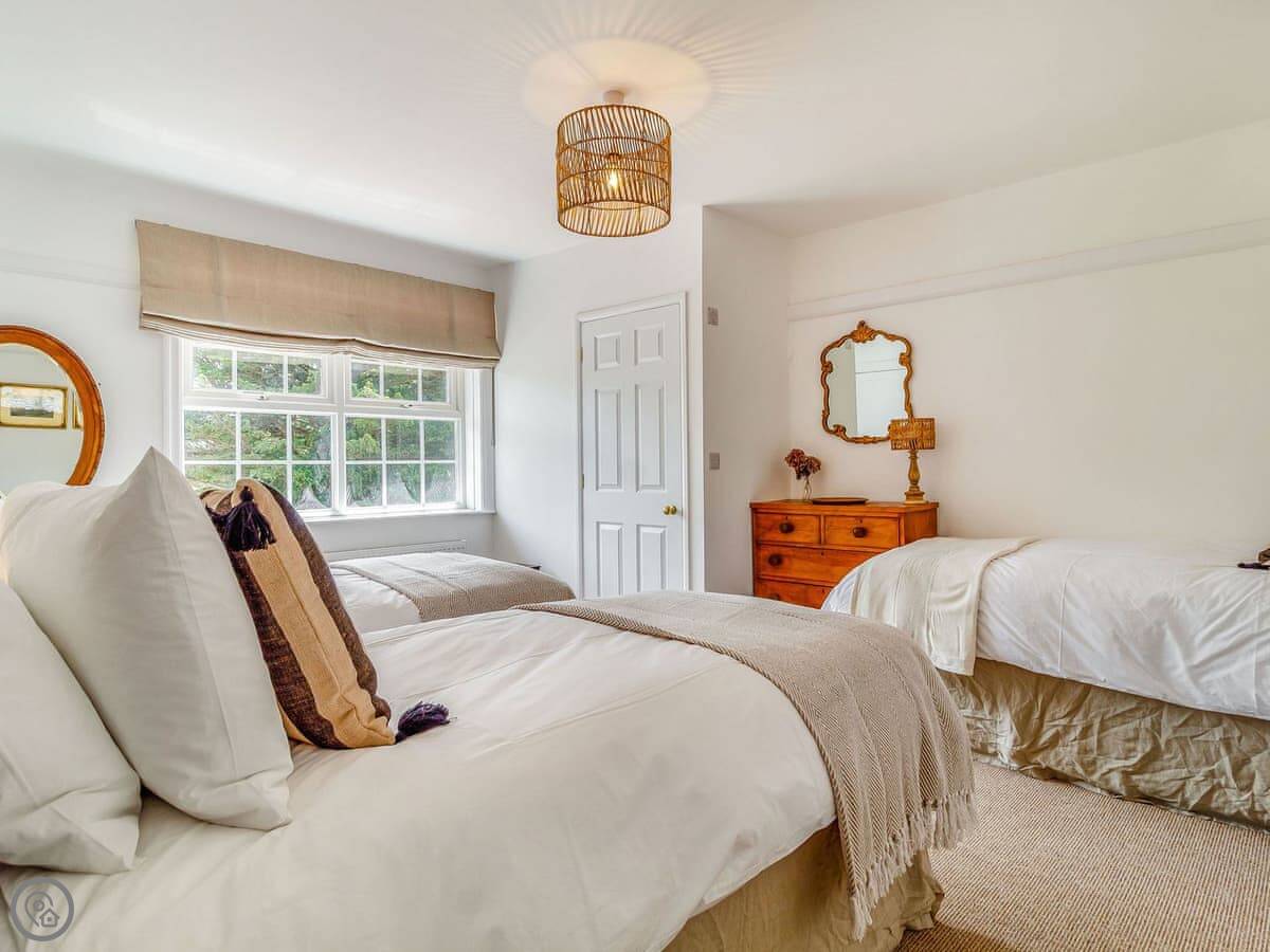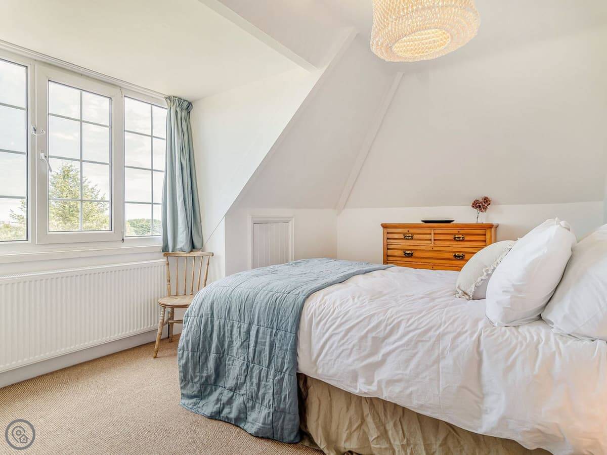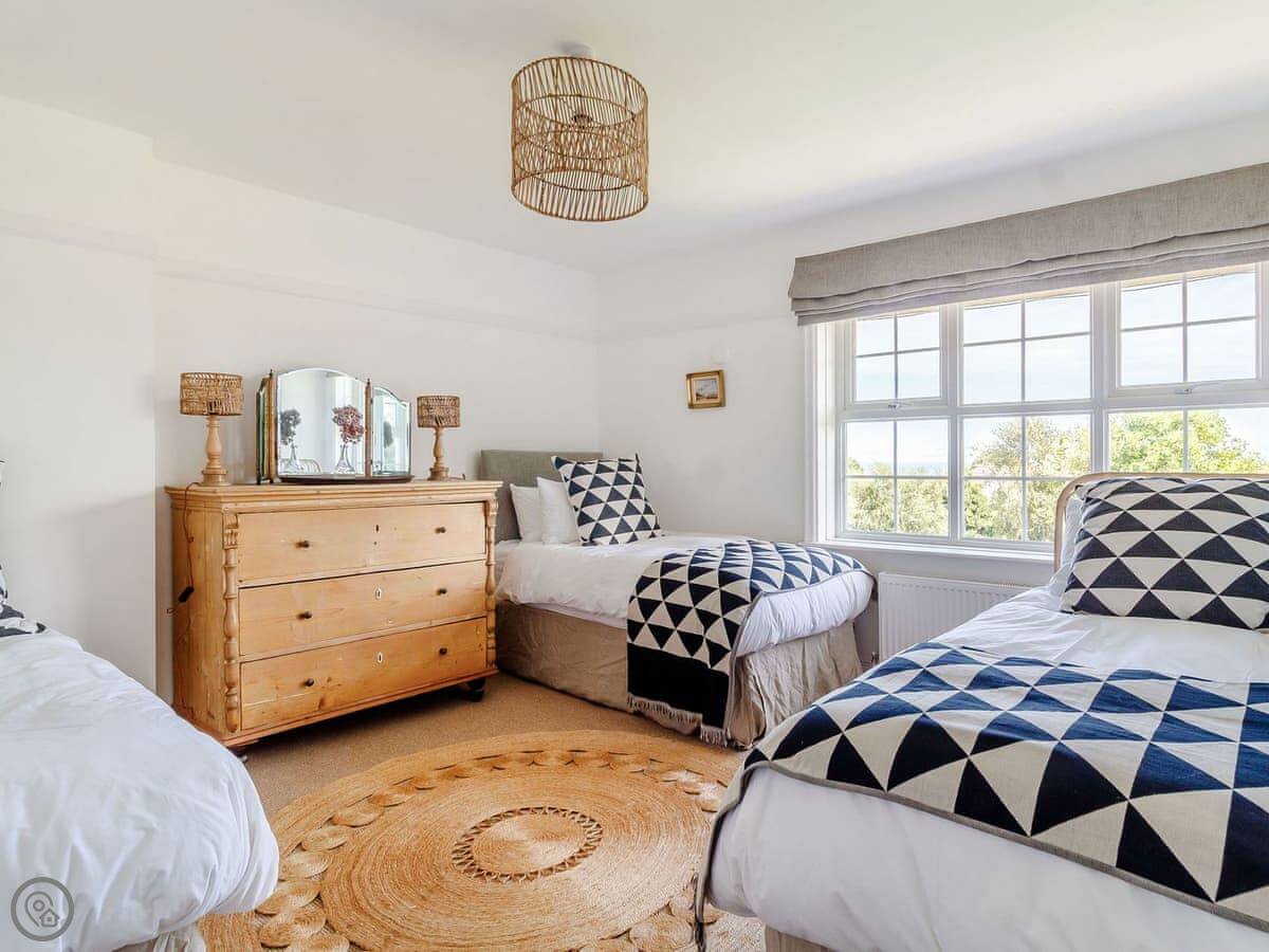 The stairs are fine, normal house stairs. Three bedrooms are on the first floor, one double and two with three singles each. Then three more bedrooms up on the second floor, two doubles and a twin. Every bedroom at the back has that distant sea view.