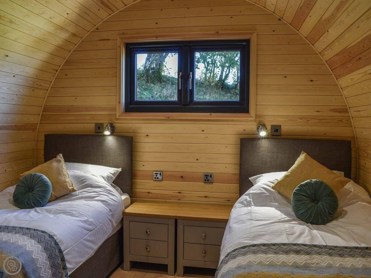 This is the perfect place to base yourselves for exploring all that the Welsh countryside has to offer. This two bedroomed pod offers an open living area as you enter with small dining table, kitchenette, and sofa for watching TV at the end of a long day. The T shape design provides a bedroom to each side offering privacy, ideal for two couples, or families with children. One is configured as a kingsize and the other as a twin which can by changed to a super kingsize upon request. The shower room has a walk-in shower, heated towel rail, toilet and basin.