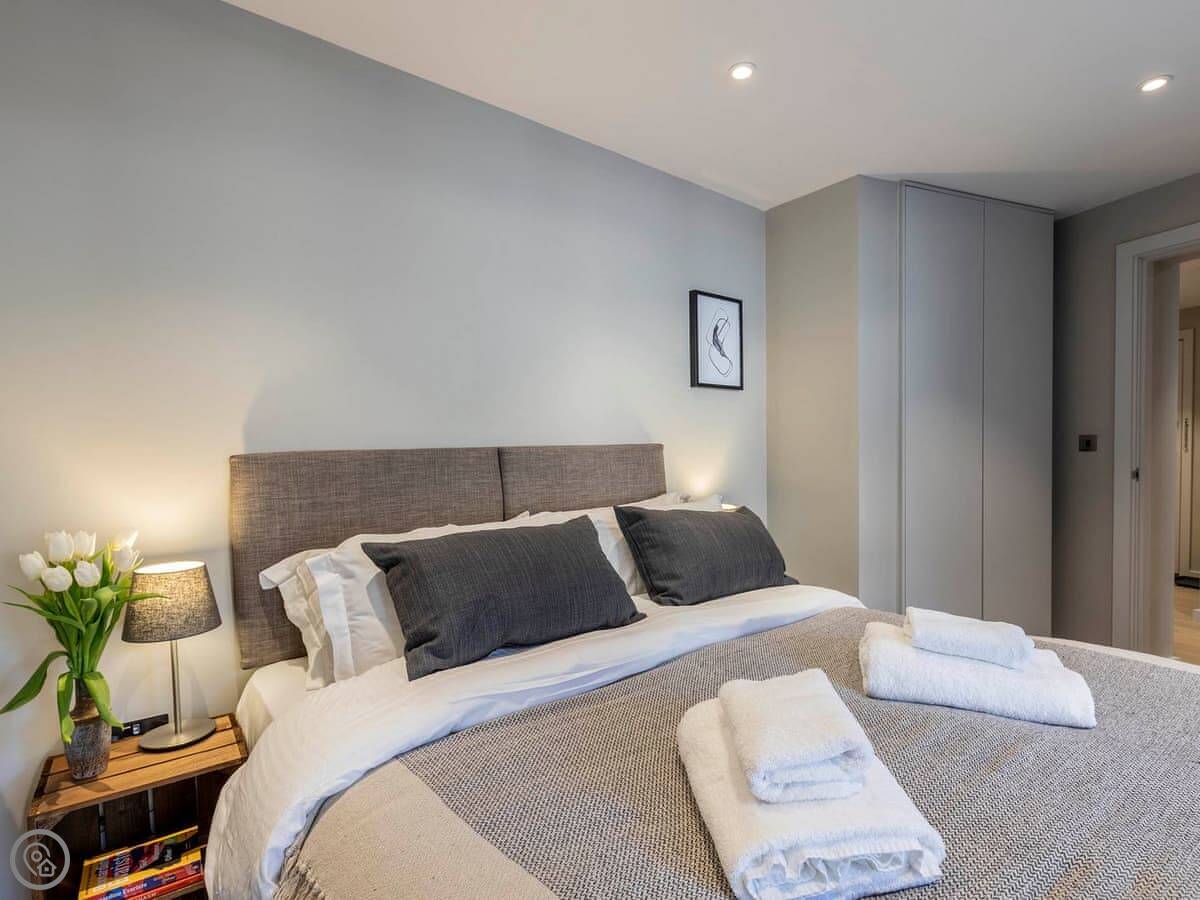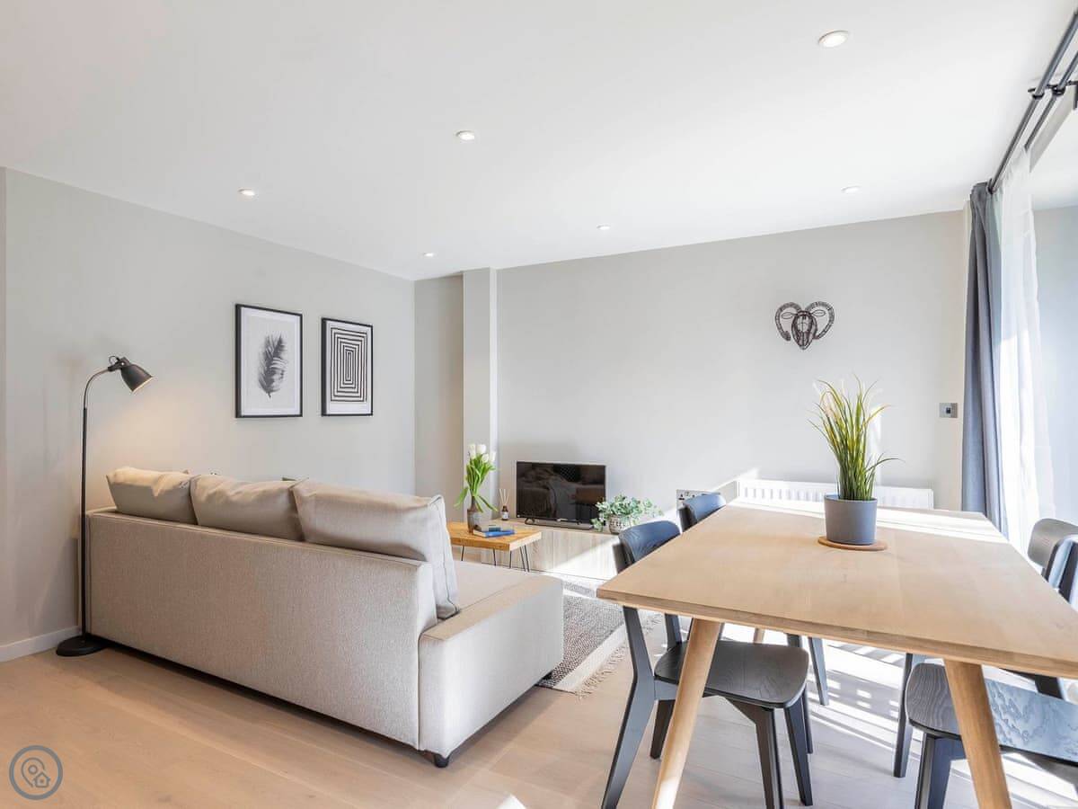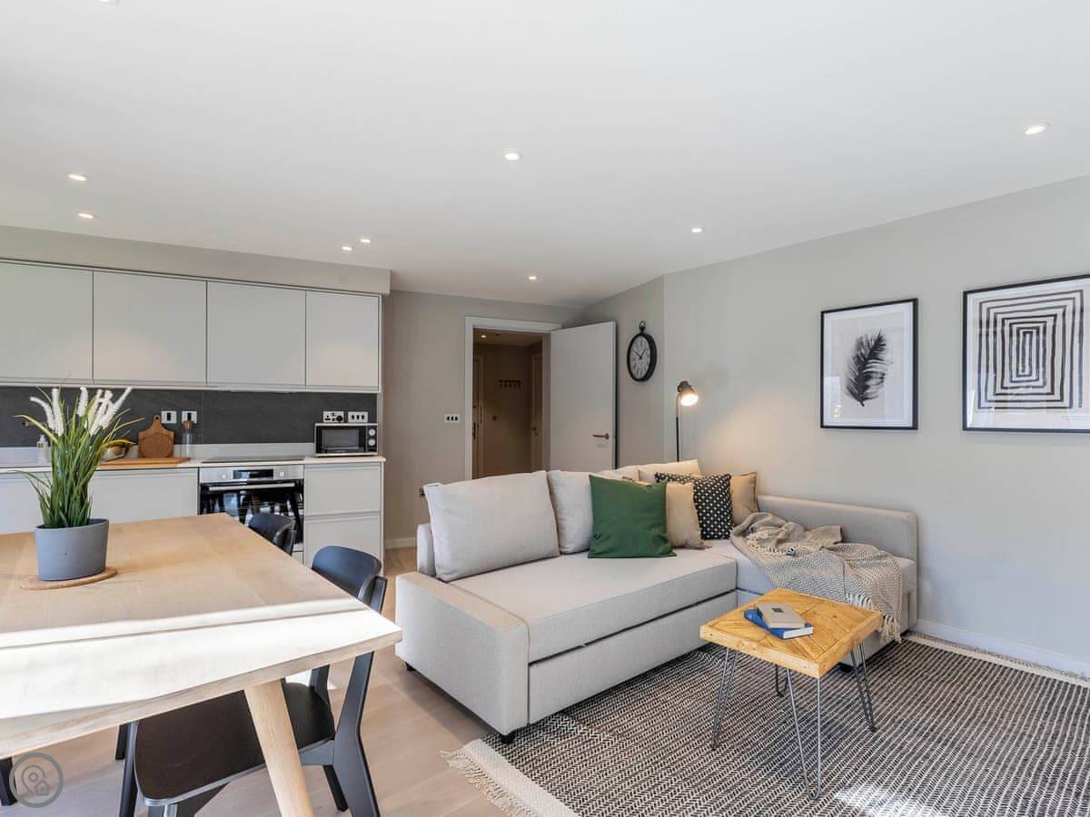 The moment you step into the apartment you are met with a light, clean, modern feel which instantly welcomes you. The living area is open-plan, making for an ideal social space for family or friends to talk, laugh, eat and drink whilst recanting the days’ adventures. There is also a balcony so you can enjoy some fresh air on warm summer evenings. The kitchen is well appointed with all the facilities you would expect from a modern apartment, and whether you are preparing a picnic or a 3-course meal, you have all the space and utensils you need. There is a comfortable seating area if you simply want to relax and enjoy your favourite TV programmes.