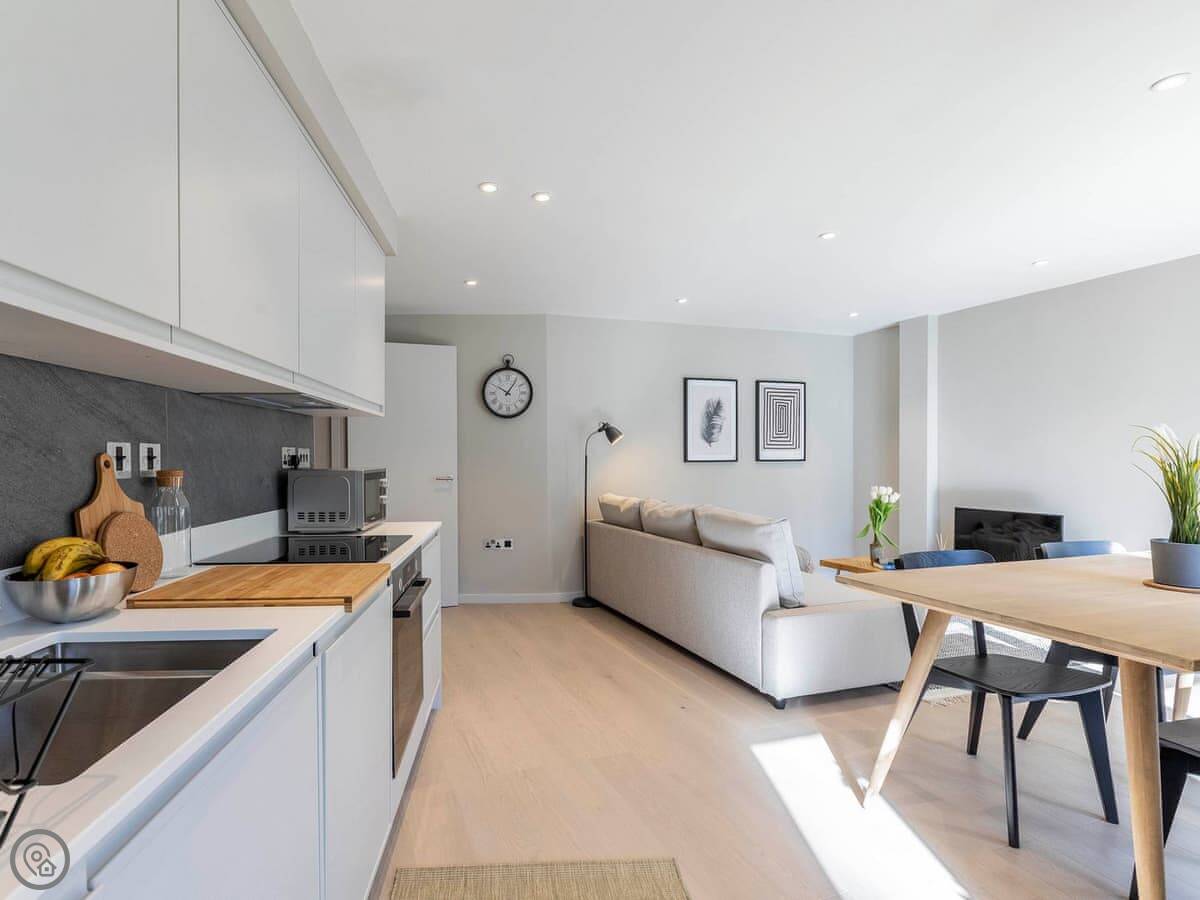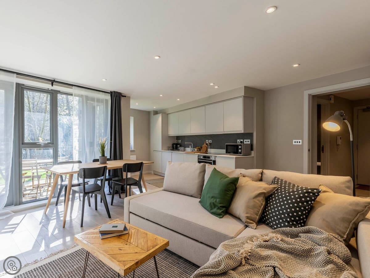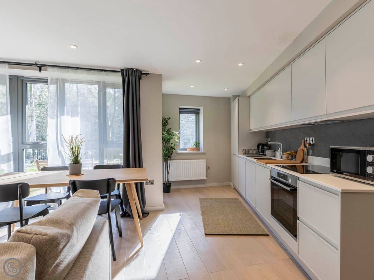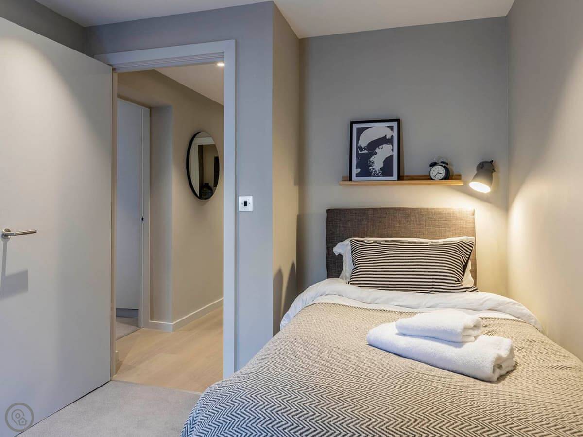 The moment you step into the apartment you are met with a light, clean, modern feel which instantly welcomes you. The living area is open-plan, making for an ideal social space for family or friends to talk, laugh, eat and drink whilst recanting the days’ adventures. There is also a balcony so you can enjoy some fresh air on warm summer evenings. The kitchen is well appointed with all the facilities you would expect from a modern apartment, and whether you are preparing a picnic or a 3-course meal, you have all the space and utensils you need. There is a comfortable seating area if you simply want to relax and enjoy your favourite TV programmes.