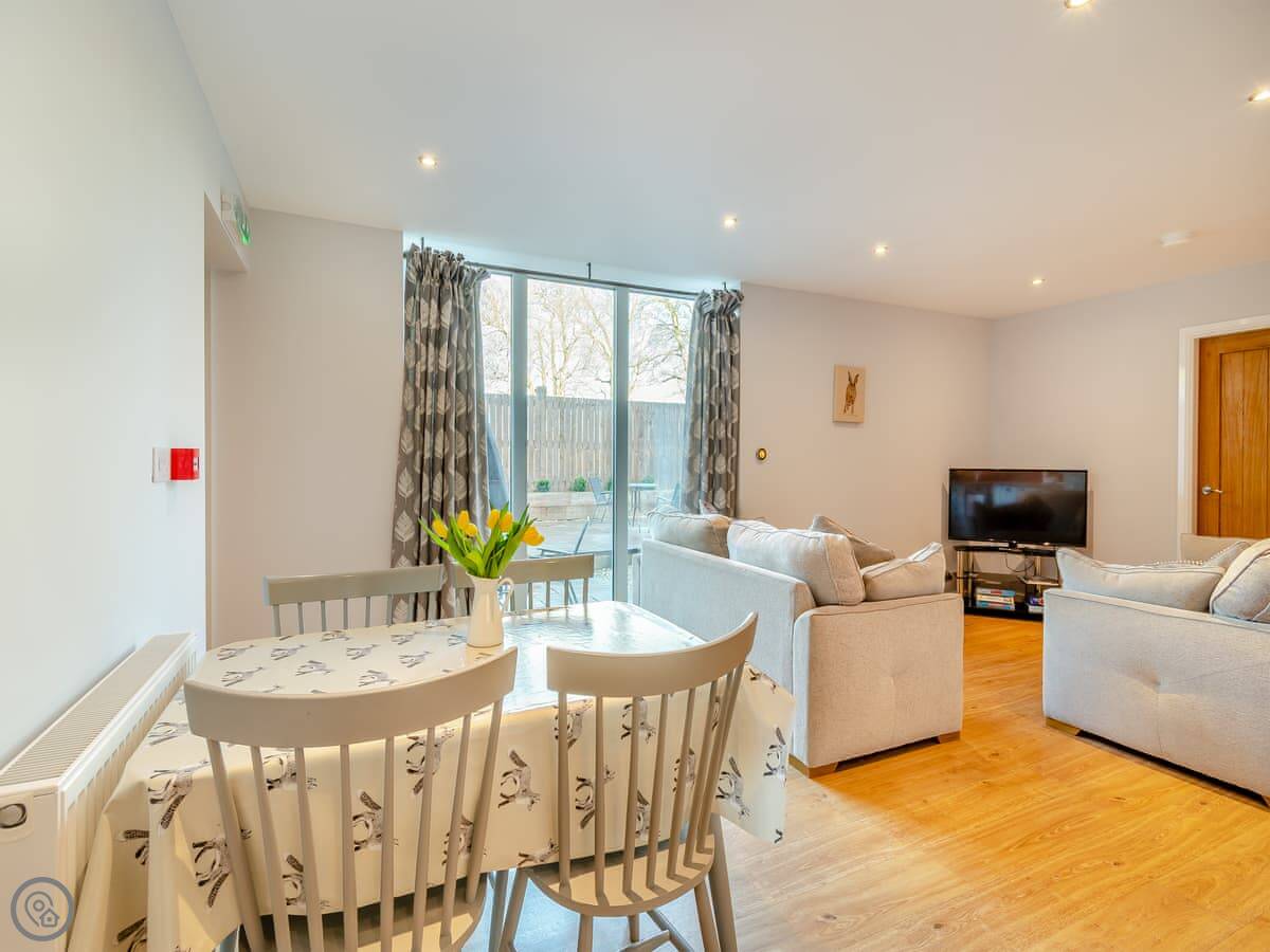 The Barn is one of seven holiday barns on a farm in High Hunsley. It's on the ground floor, which is handy. There's a field out the front and you get your own bit of enclosed patio space with a table.