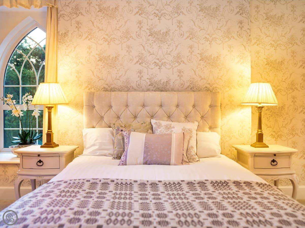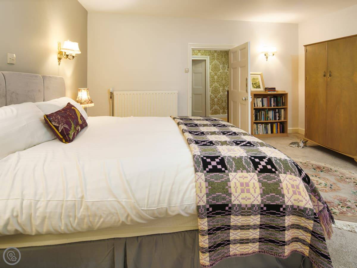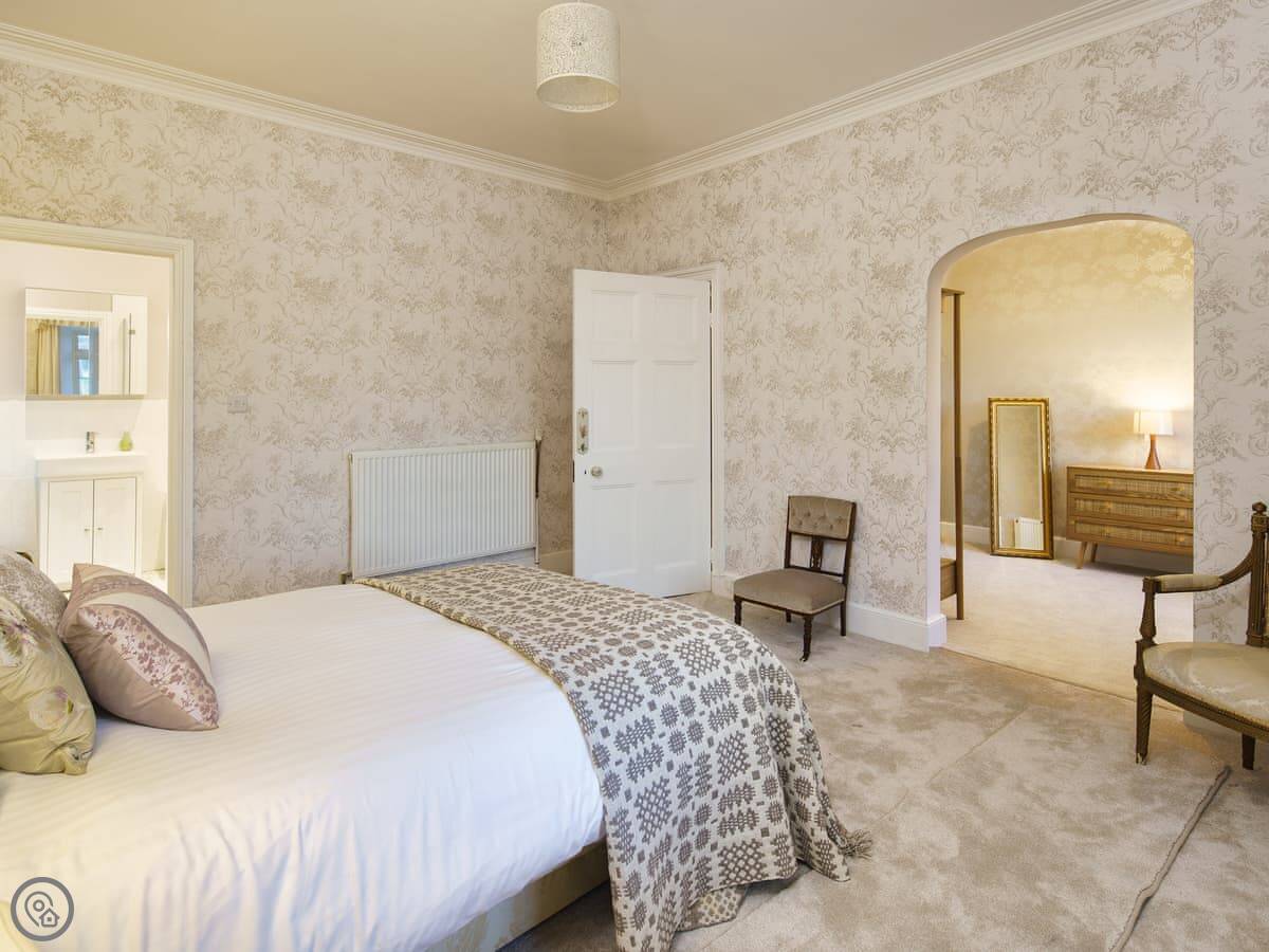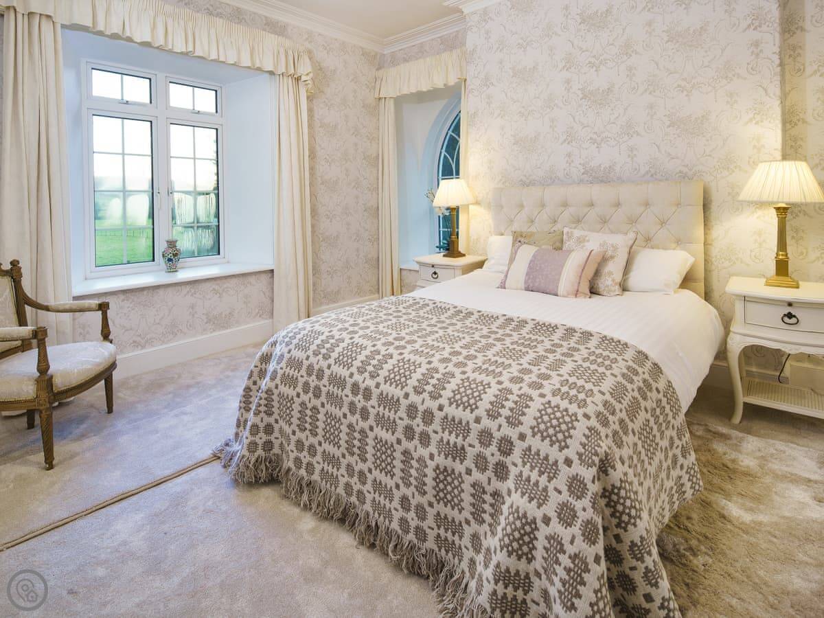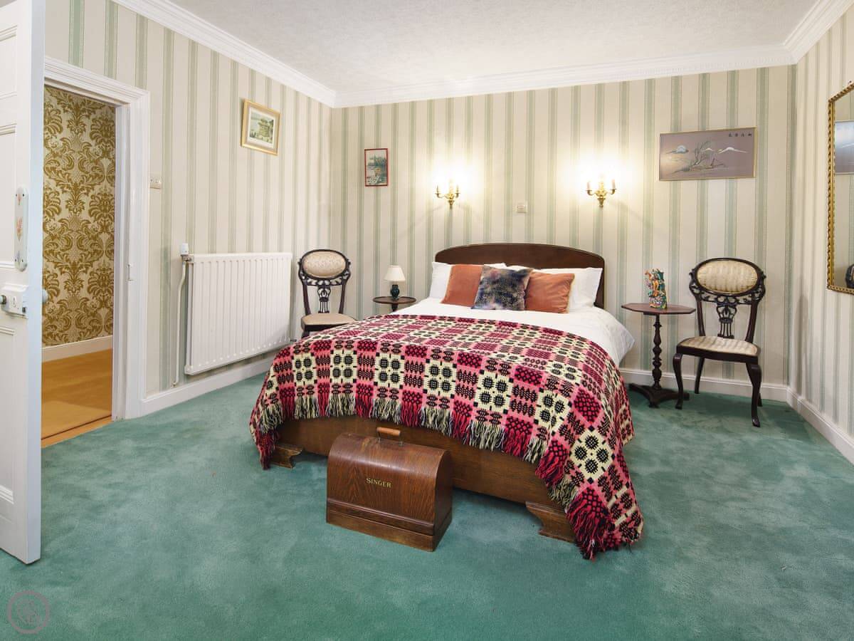 It's a big place, sleeps ten. Five bedrooms, three bathrooms. It's got a 5 Star rating, which means it's well equipped and comfortable. There are two staircases, which is handy with a big group. Some of the bedrooms are quite traditional, with patterned wallpaper. It's not a blank white box.