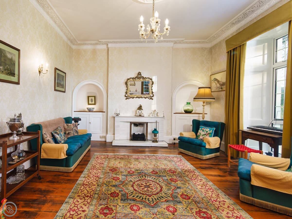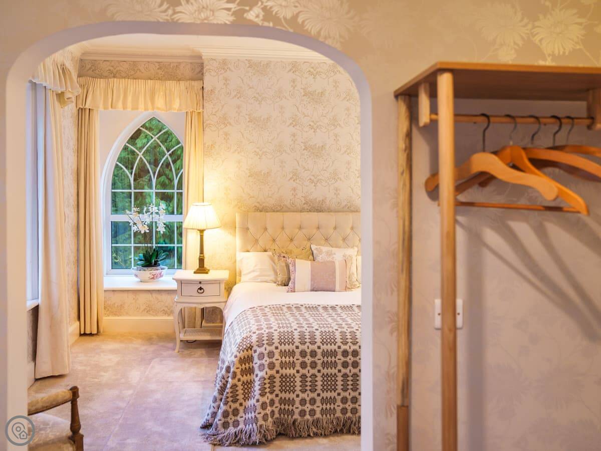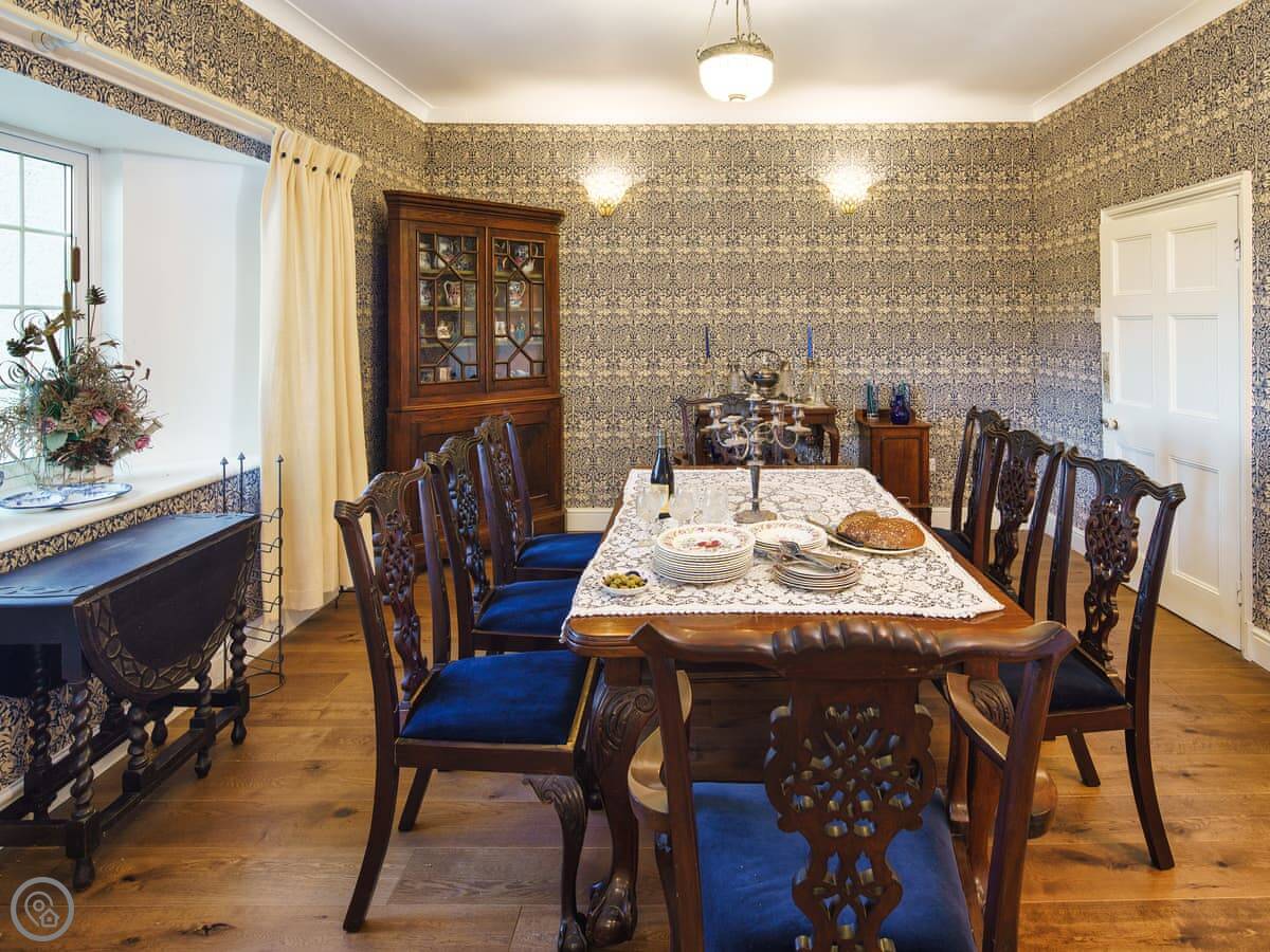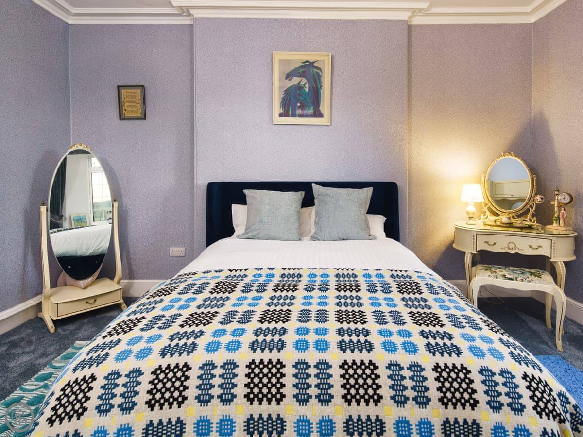 It's a big place, sleeps ten. Five bedrooms, three bathrooms. It's got a 5 Star rating, which means it's well equipped and comfortable. There are two staircases, which is handy with a big group. Some of the bedrooms are quite traditional, with patterned wallpaper. It's not a blank white box.