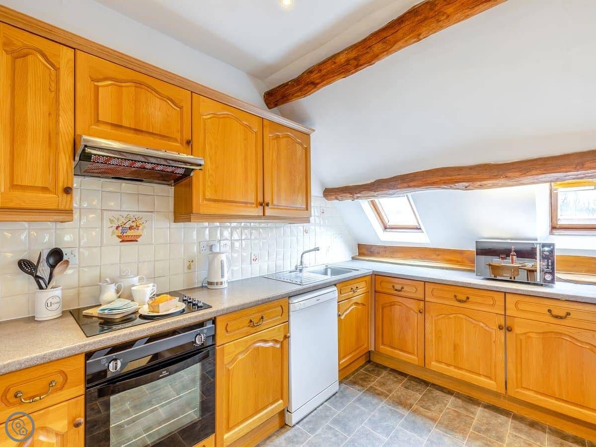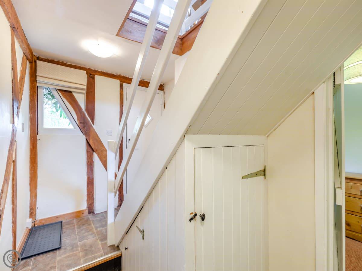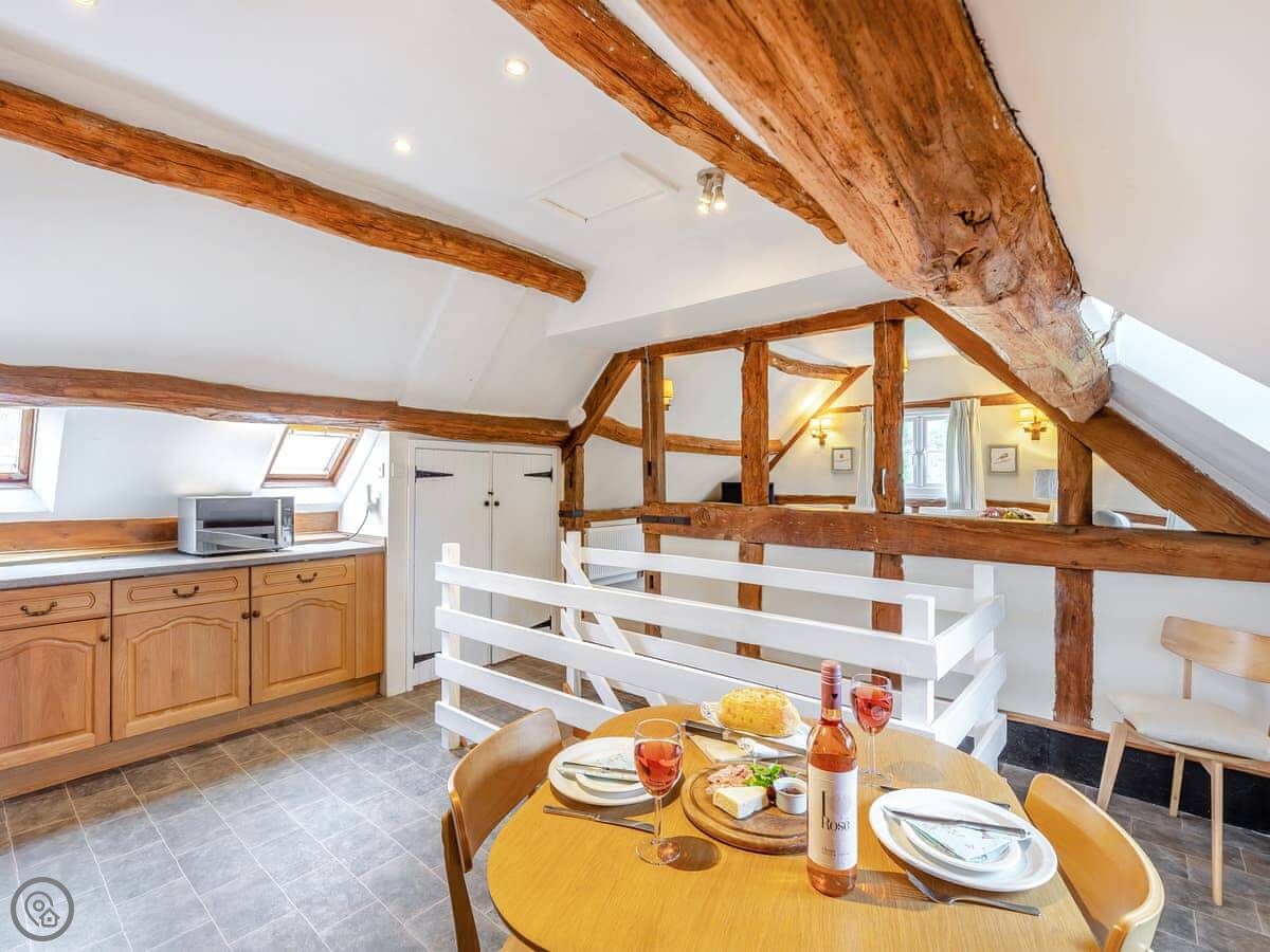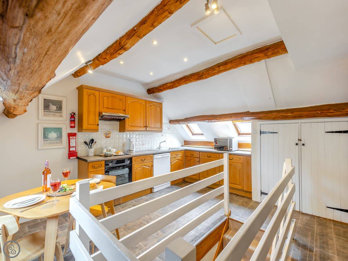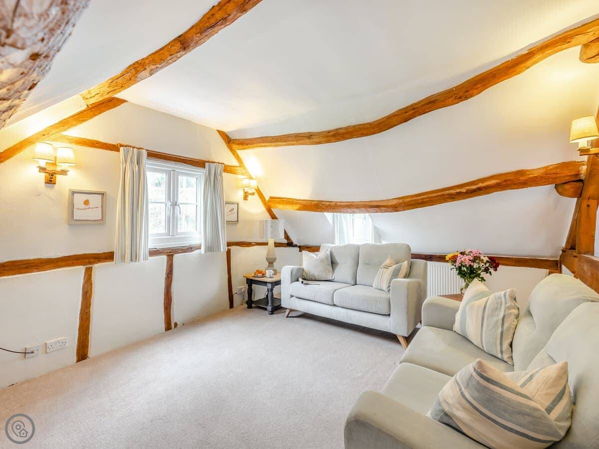 The stairs are fairly steep, as you'd expect. Upstairs is the kitchen and living room. The ceilings are beamed and the view from the living room over the fields is really good. You can see the Malvern Hills from here.