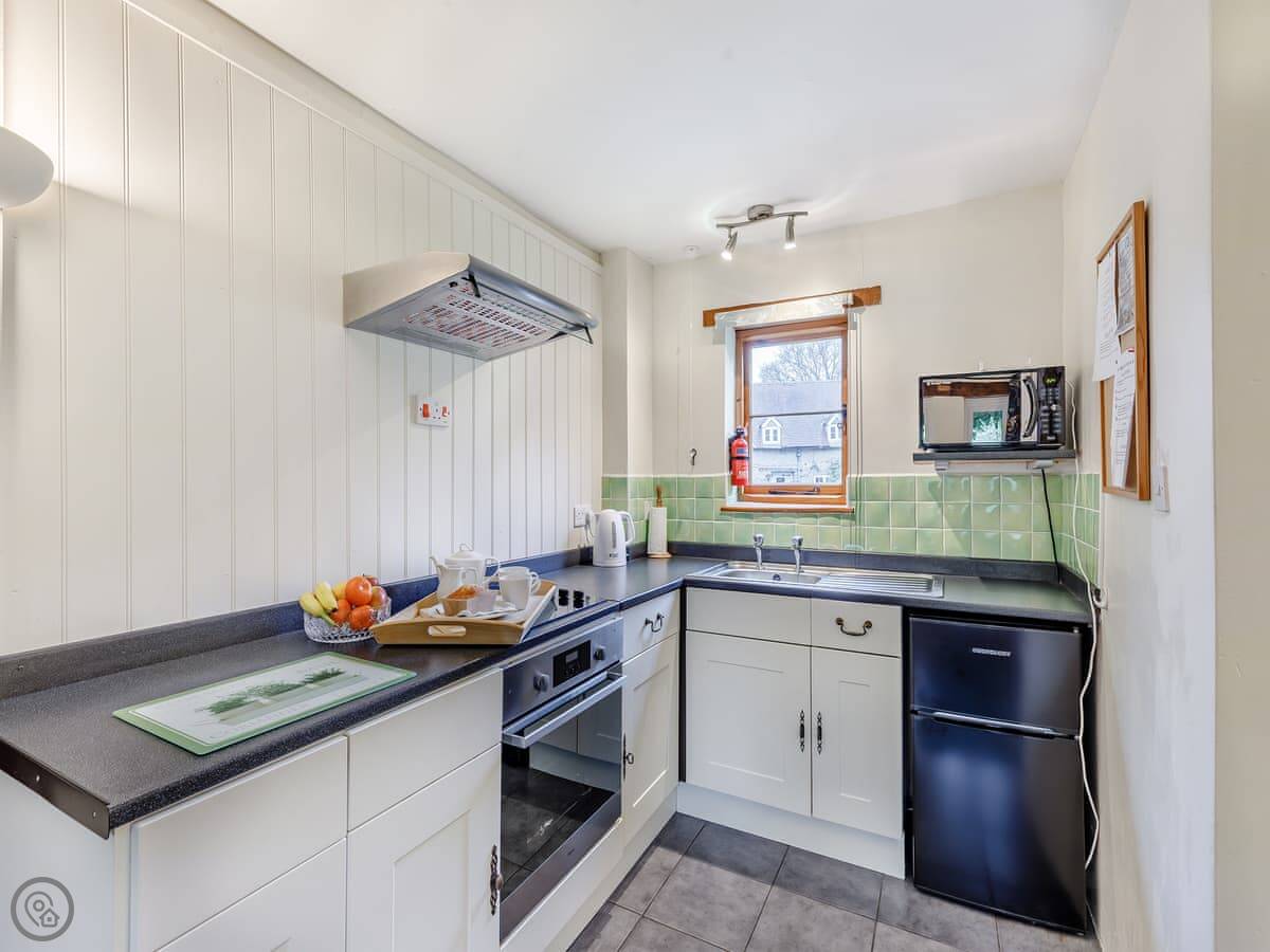 It's a one-bedroom place. The bedroom and bathroom are upstairs. The stairs are a half-landing type, sort of compact. You come in through what was the big main doorway of the barn, which is quite a feature. The living area is cosy, and the kitchen is small but fitted with what you need.