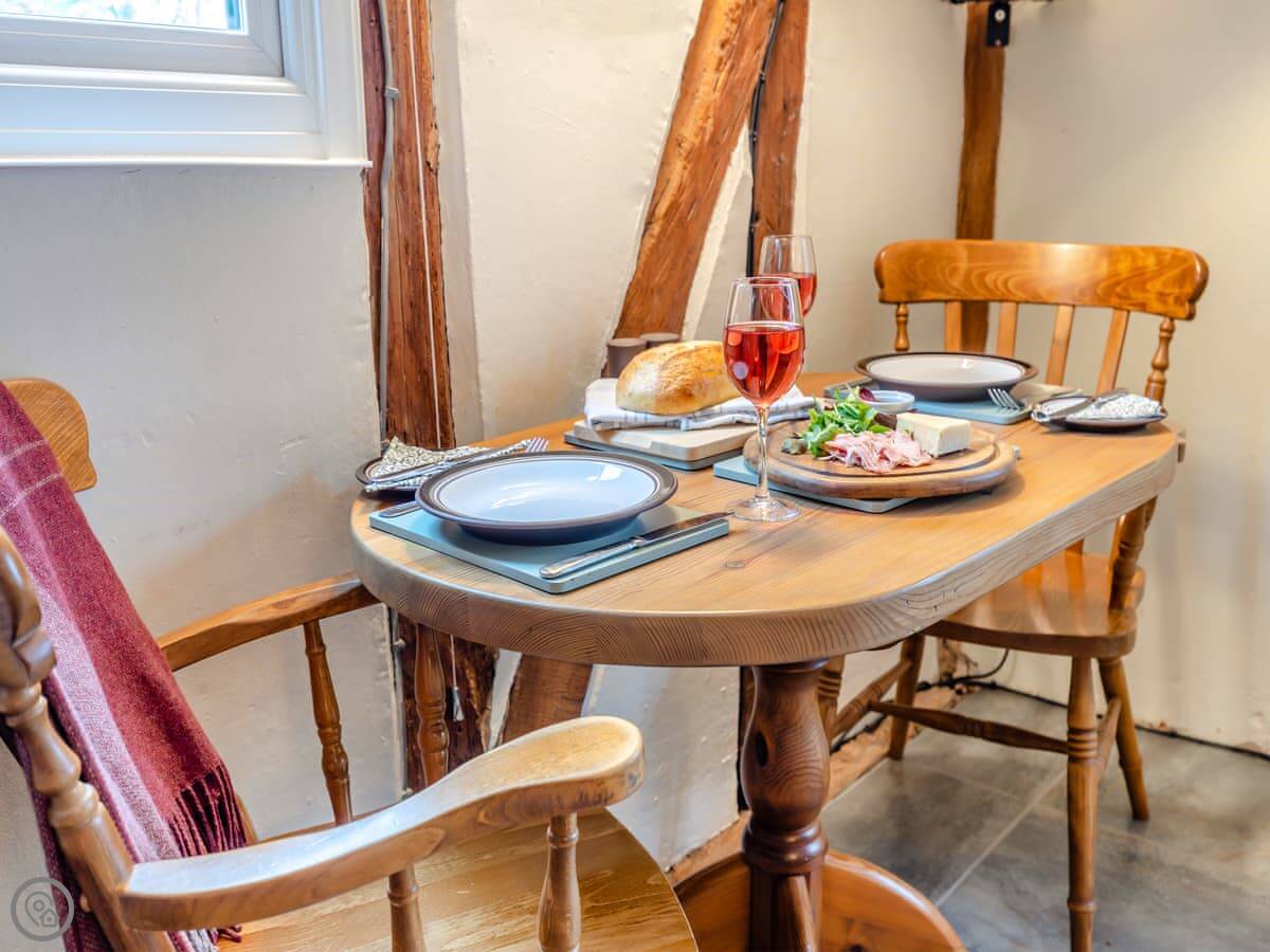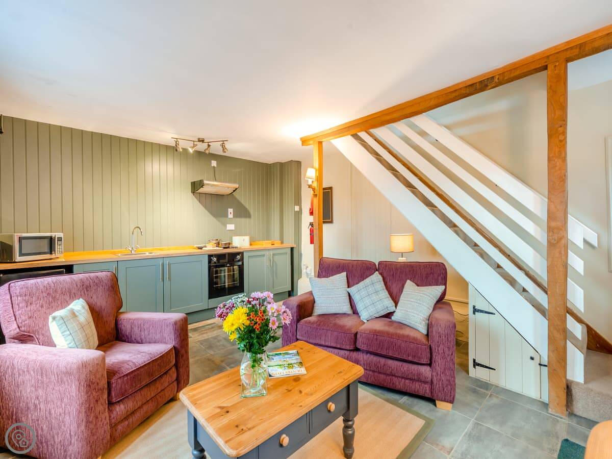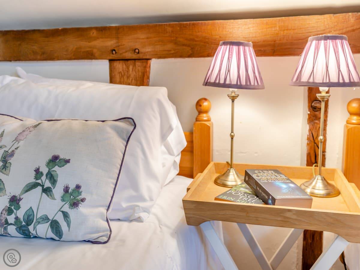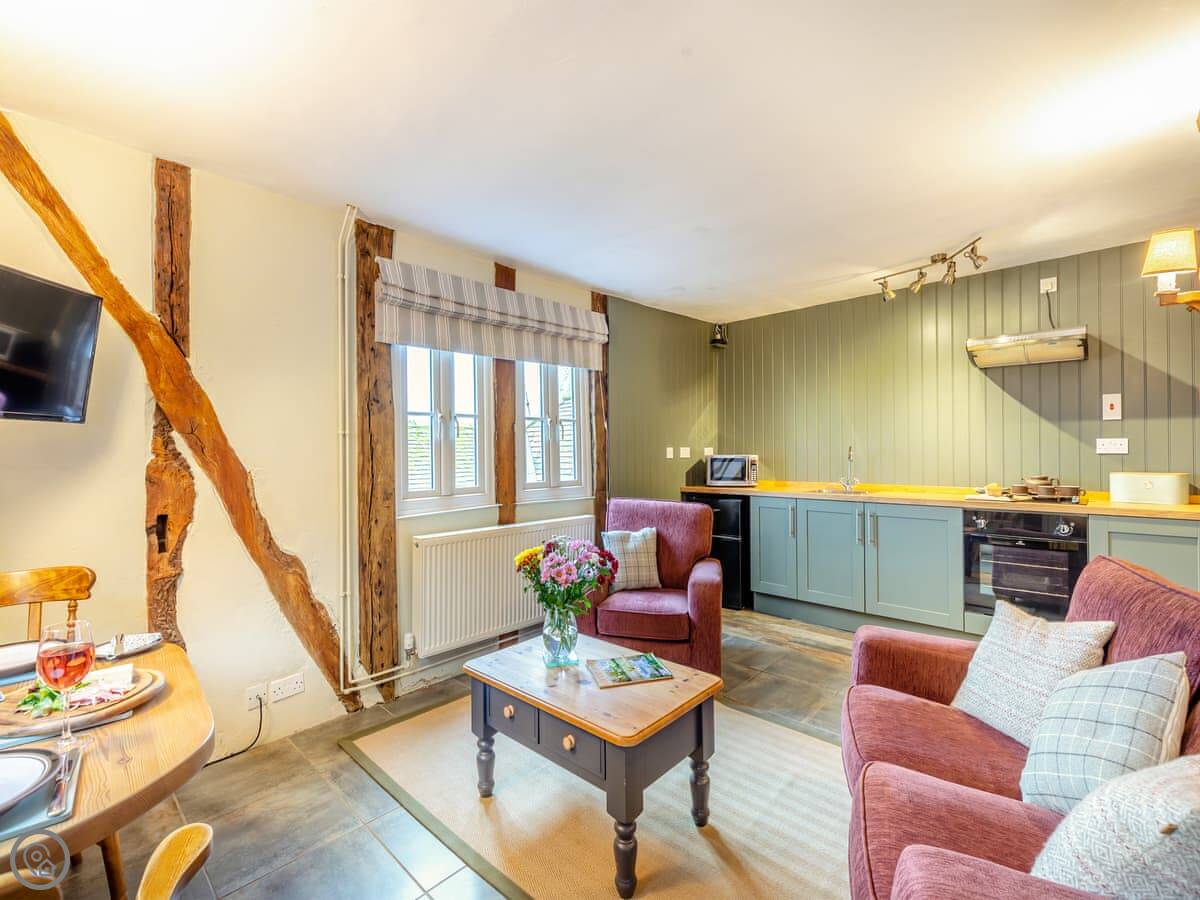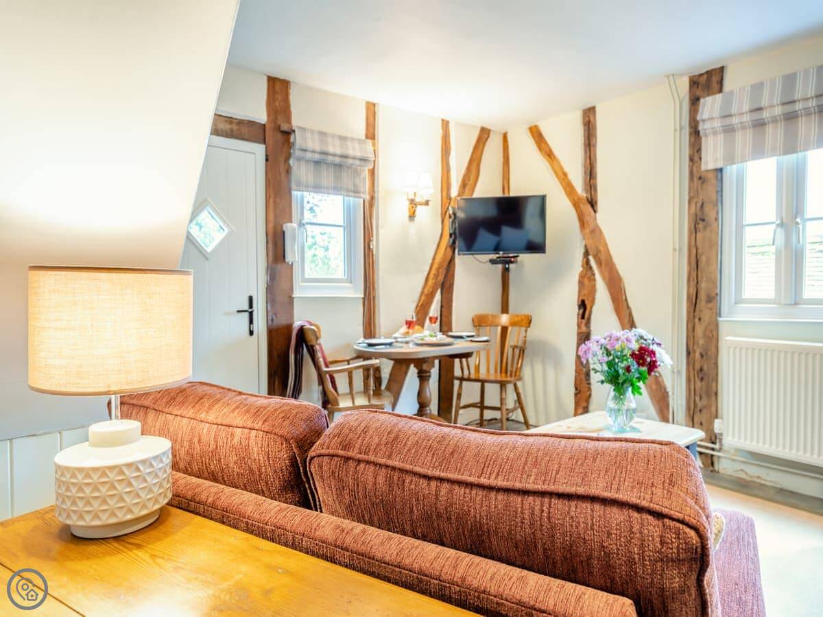 It's a converted barn from the 1970s, so you've got all the beams and that vaulted ceiling. It's got a 4 Star rating. There's a small garden with a BBQ and a patio. You can park right outside.