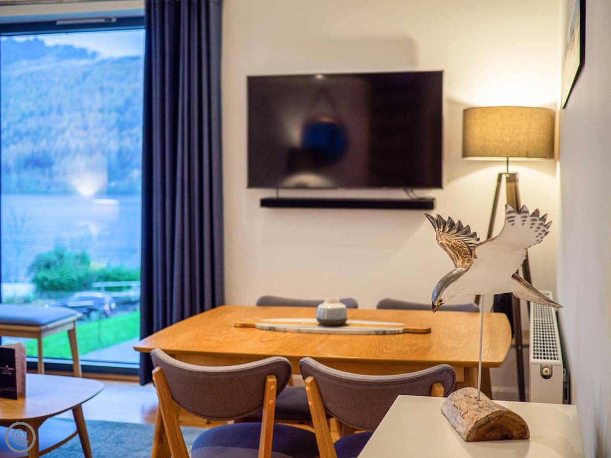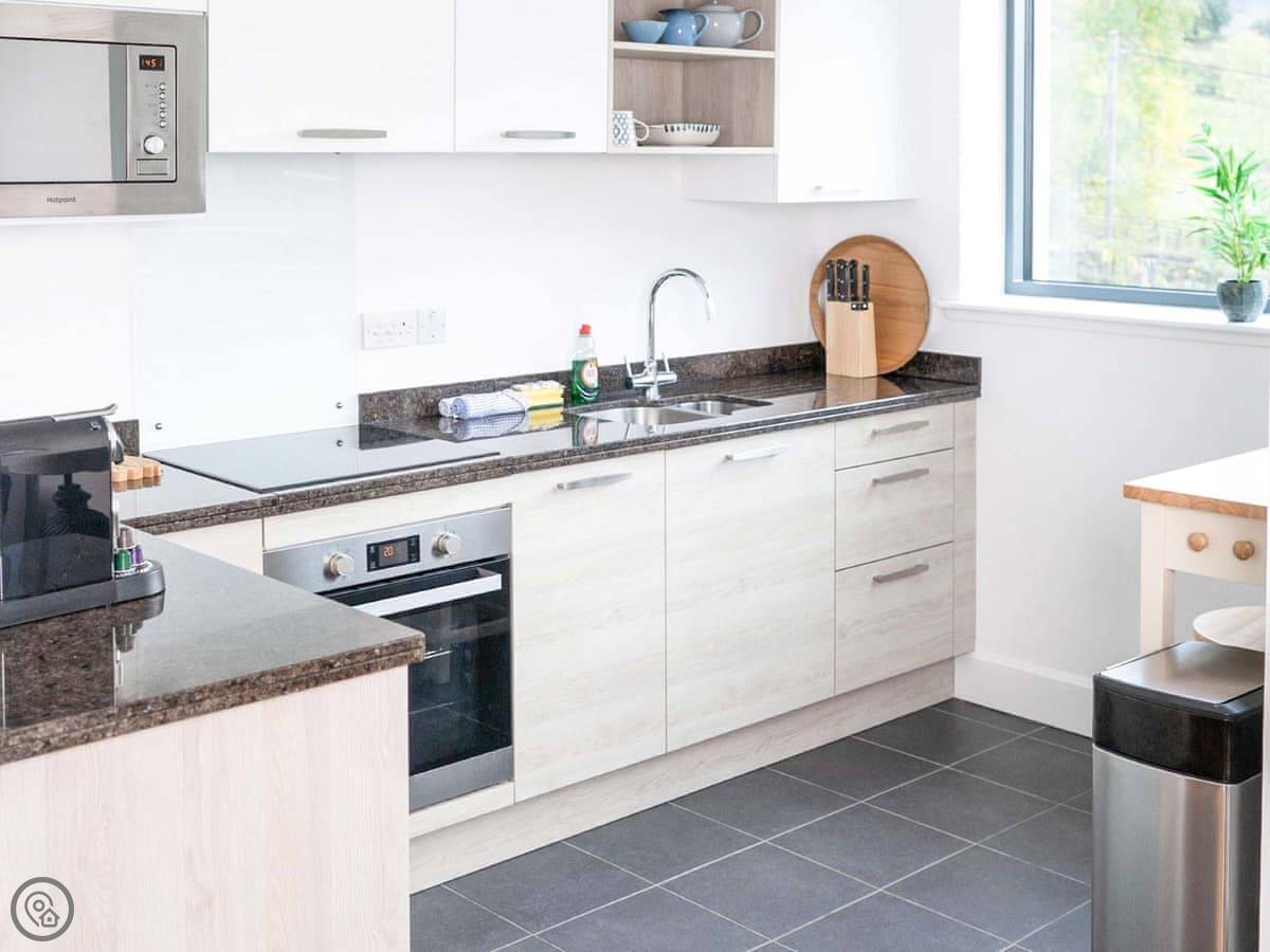 Loch View No. 14 is a one bedroom, penthouse apartment found on the newest development of Taymouth Marina. From its large balcony, you’ll enjoy unparalleled views over Loch Tay and the hills beyond. If you are lucky, you might even be able to catch the Northern Lights over Drummond Hills. The large picture windows that run ceiling to floor, the views of the Loch and Kenmore are just as impressive. From the leather sofas in the open plan living space, you can take in the views of the spacious open living area.