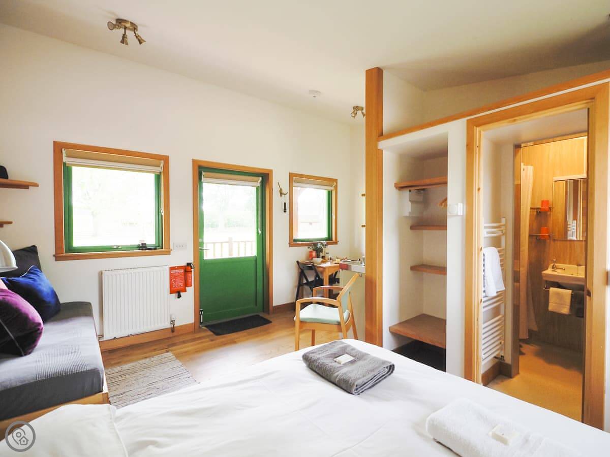 It sleeps three, with one main space. There's a kingsize bed that can be split into two singles if you ask beforehand. The bathroom is a walk-in wet room. Everything is on the ground floor, so there are no stairs at all.