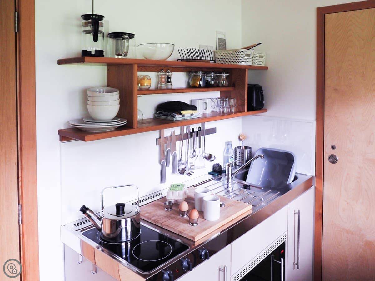 The studio sleeps three. It's one bedroom, one bathroom. The bed's a king size but you can split it into two singles if you ask ahead. The kitchenette is small but it has what you need. There's a small sitting area by a big picture window. The view is over an open paddock with some trees and ponds.