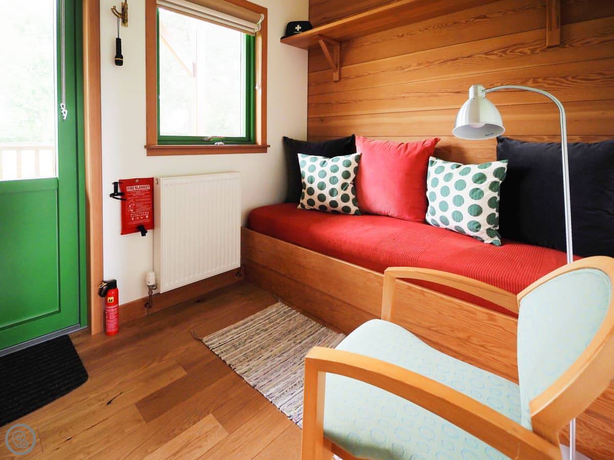 It sleeps three, but it's really set up for a couple. There's one open plan space with a kingsize bed that can be split into twins. There's a small kitchenette area and a shower room. It's a 3 Star rating, so it's comfortable and clean. It's built from local wood, so it's warm and it smells nice.