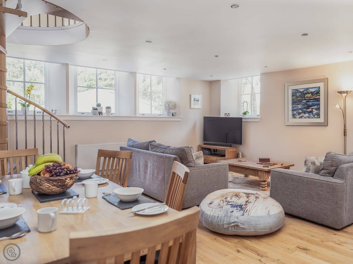 Mrs Clark’s Classroom has its own private entrance and hallway leading to a large open plan lounge/kitchen/dining area, from which you can access a shower room. The kitchen is fully equipped with all the crockery and utensils you will need for the chef of the group to cook a hearty meal. The lounge has a wide-screen TV with a dolby speaker. The feature spiral staircase takes you to a bright and airy upper landing giving access to one double and one zip and link twin bedroom and another bathroom. The decor throughout is bright and airy and all bed linen used is Egyptian cotton with light fluffy towels provided.
