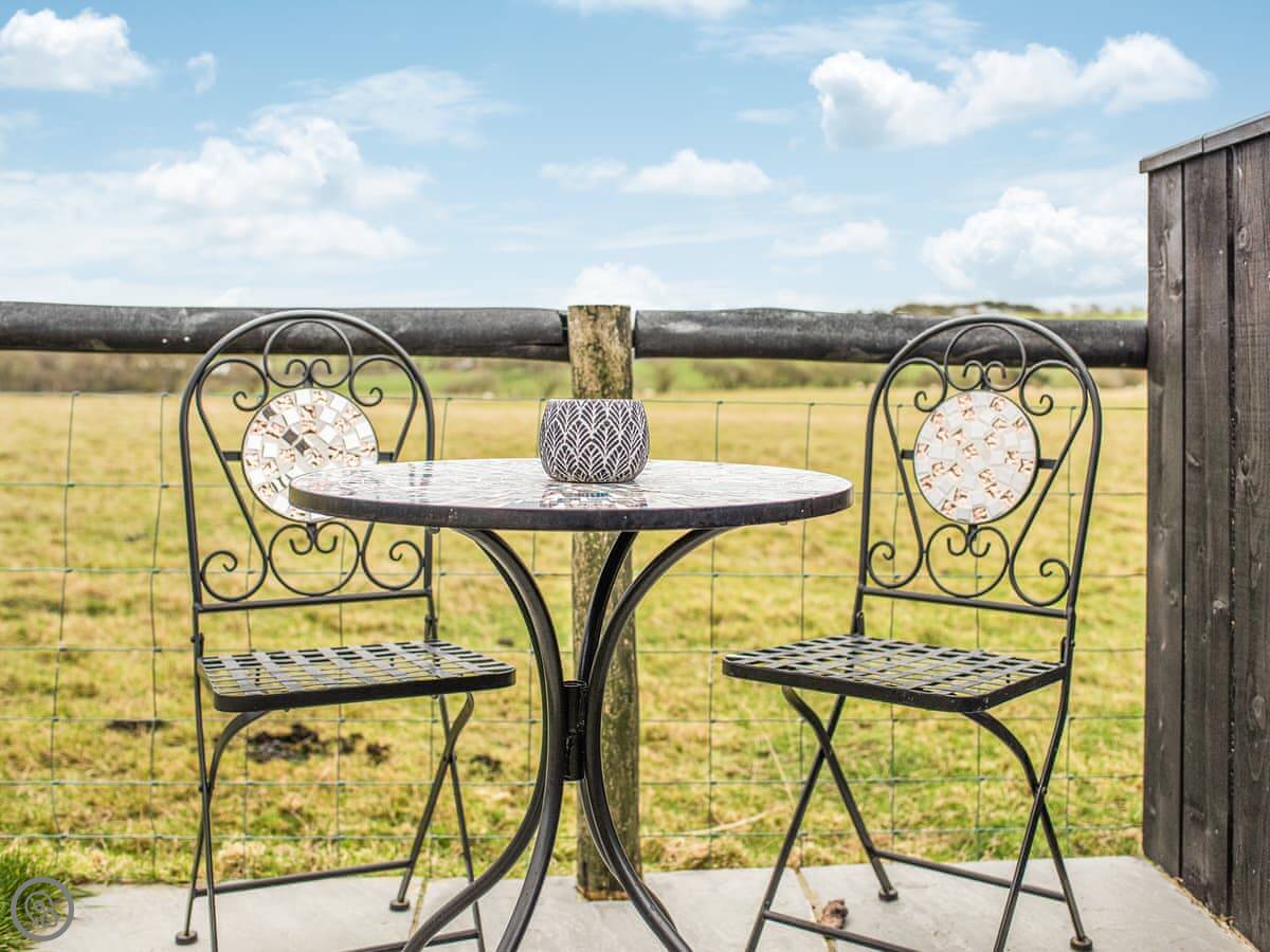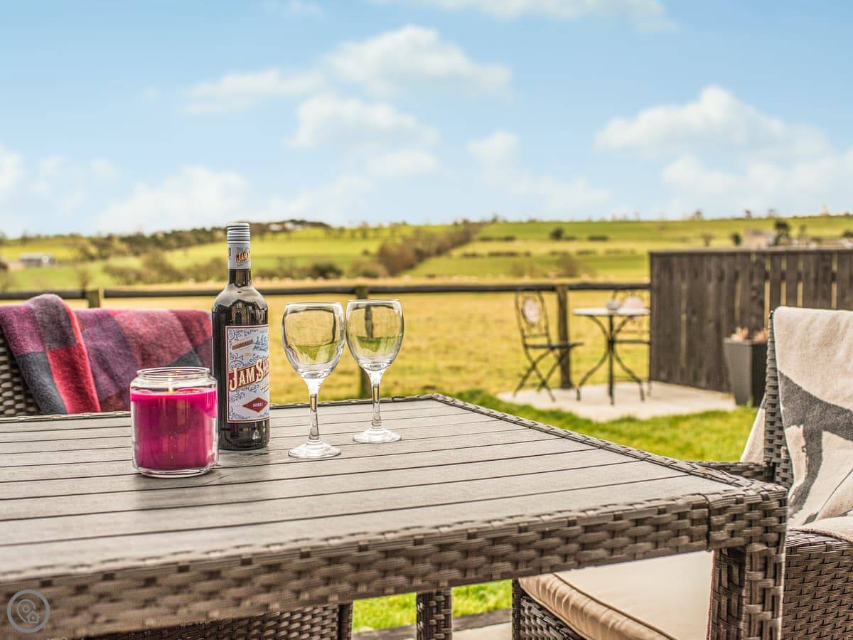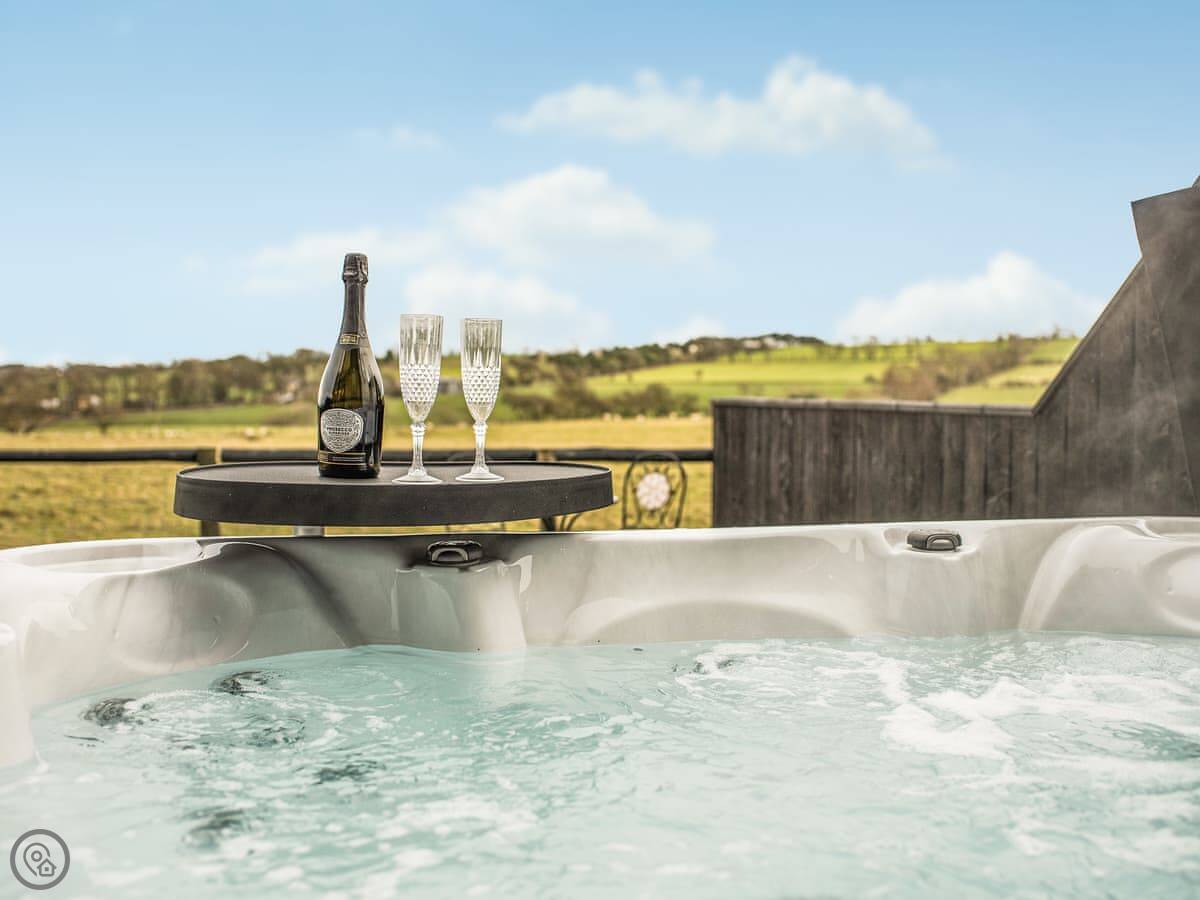 Outside, there's a south-facing stone patio with a hot tub and a BBQ. The views over the fields are very good.