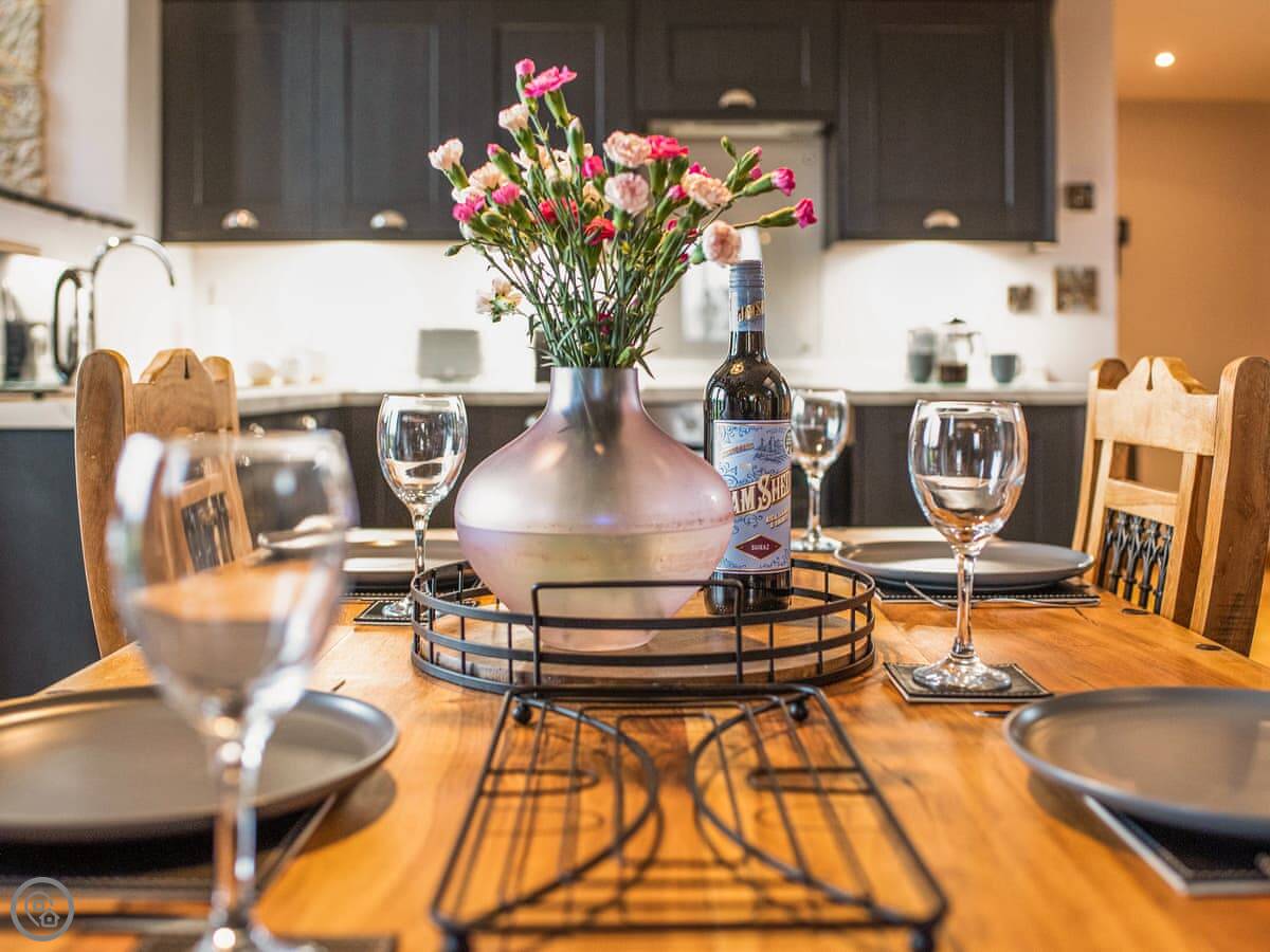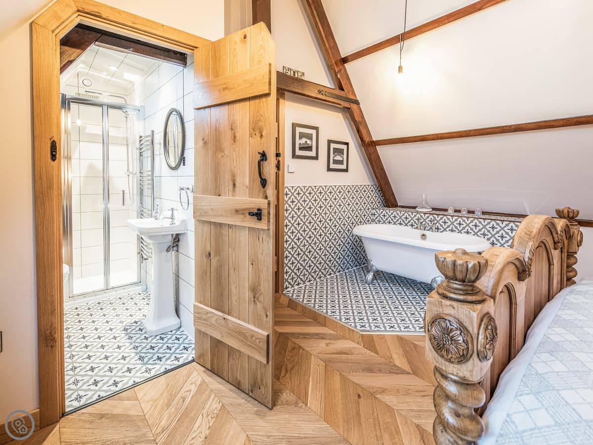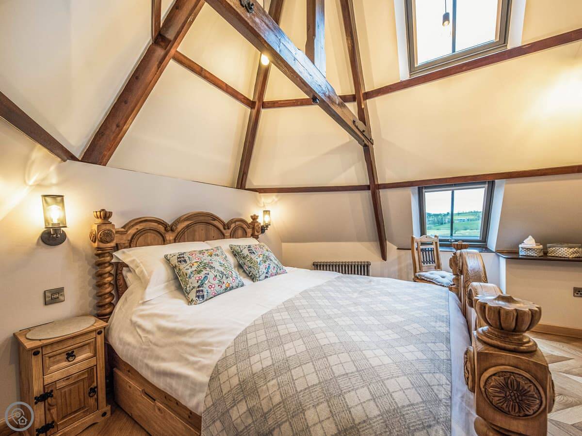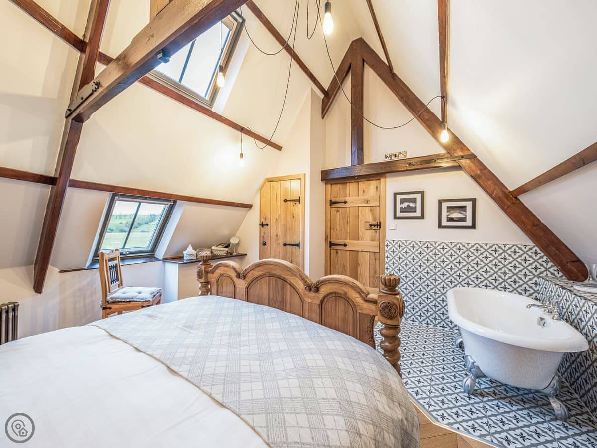 The main space is open plan, with the kitchen, dining table, and living area all together. There's a wood burner for cold nights. The stairs go up to the bedrooms under the vaulted ceiling. The main bedroom has a kingsize bed and a freestanding bath in the room itself. The second bedroom has two single beds.