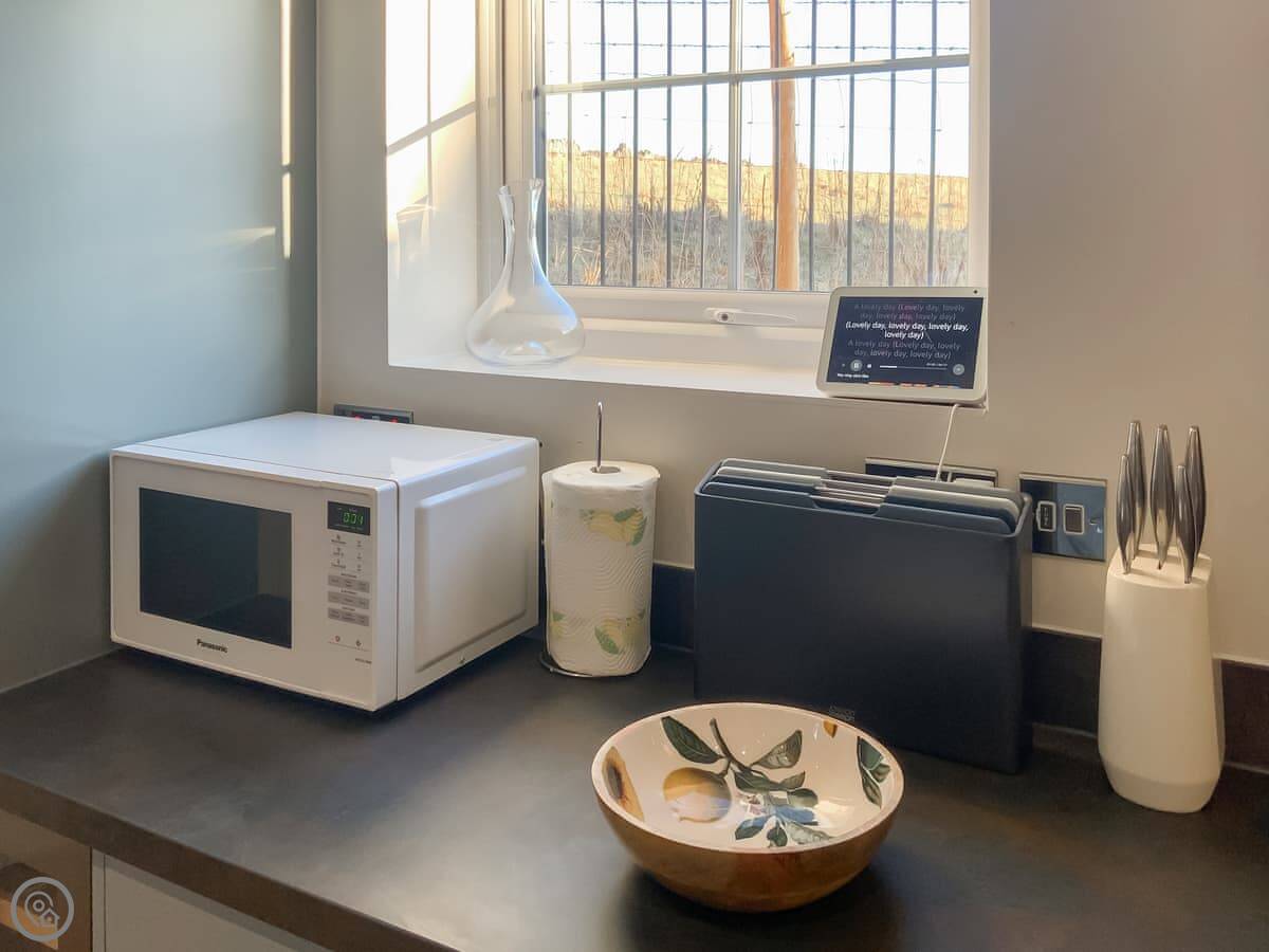The garden's enclosed, just lawn and a patio. It's handy. Inside, it's straightforward: a kitchen with what you need, a dining room, a lounge. There's a garage you can use for storing bikes.