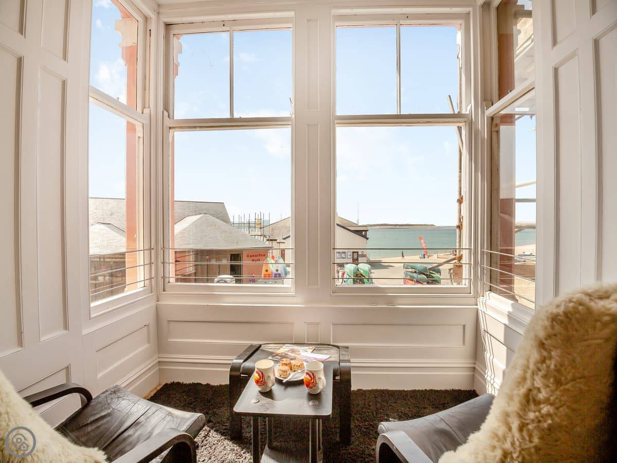 The main thing is the windows in the living room. They're huge bay windows looking out over the water. There are a couple of chairs right in front of them. The kitchen-diner is behind that, it's got a glass table and a dishwasher.