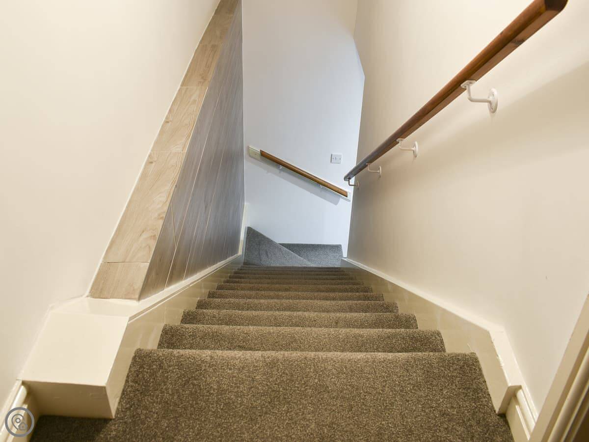The Studio is attached to the main house, Malt Kiln Cottage. You come in through a shared hallway to a small corridor. The shower room is there, and then stairs go up to the main room.