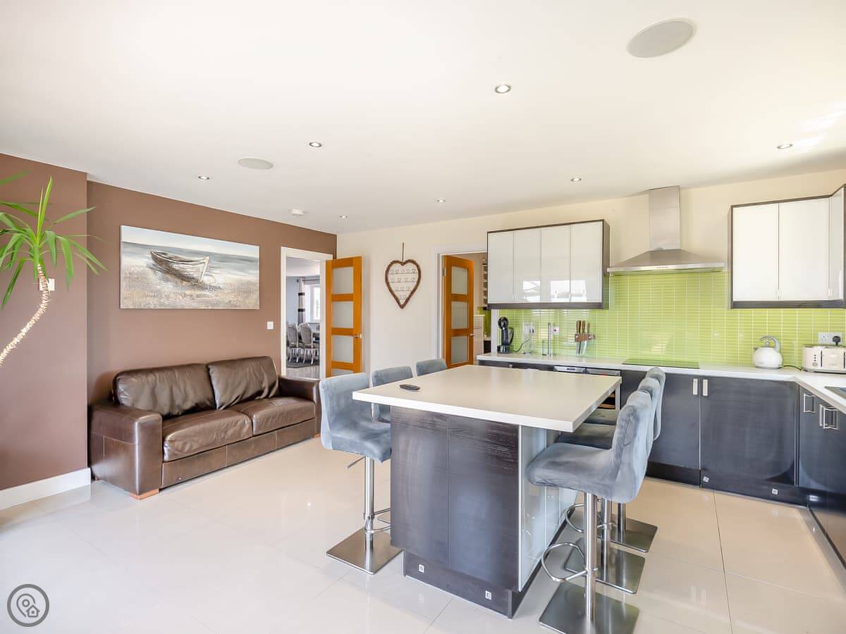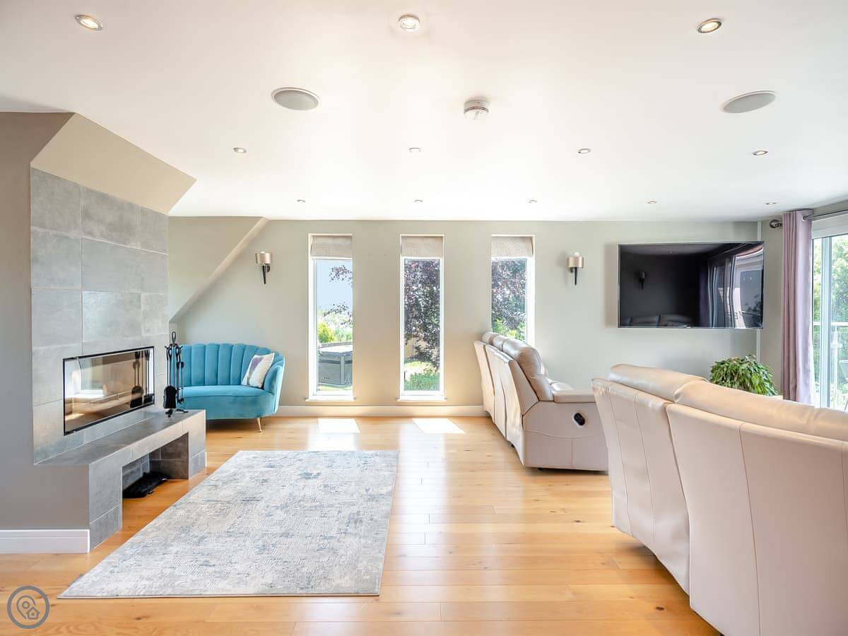 The living room is also upstairs, to make the most of the view. There's a wood burner for colder days. The kitchen is a good size for cooking for a group.