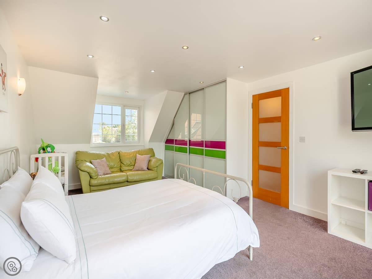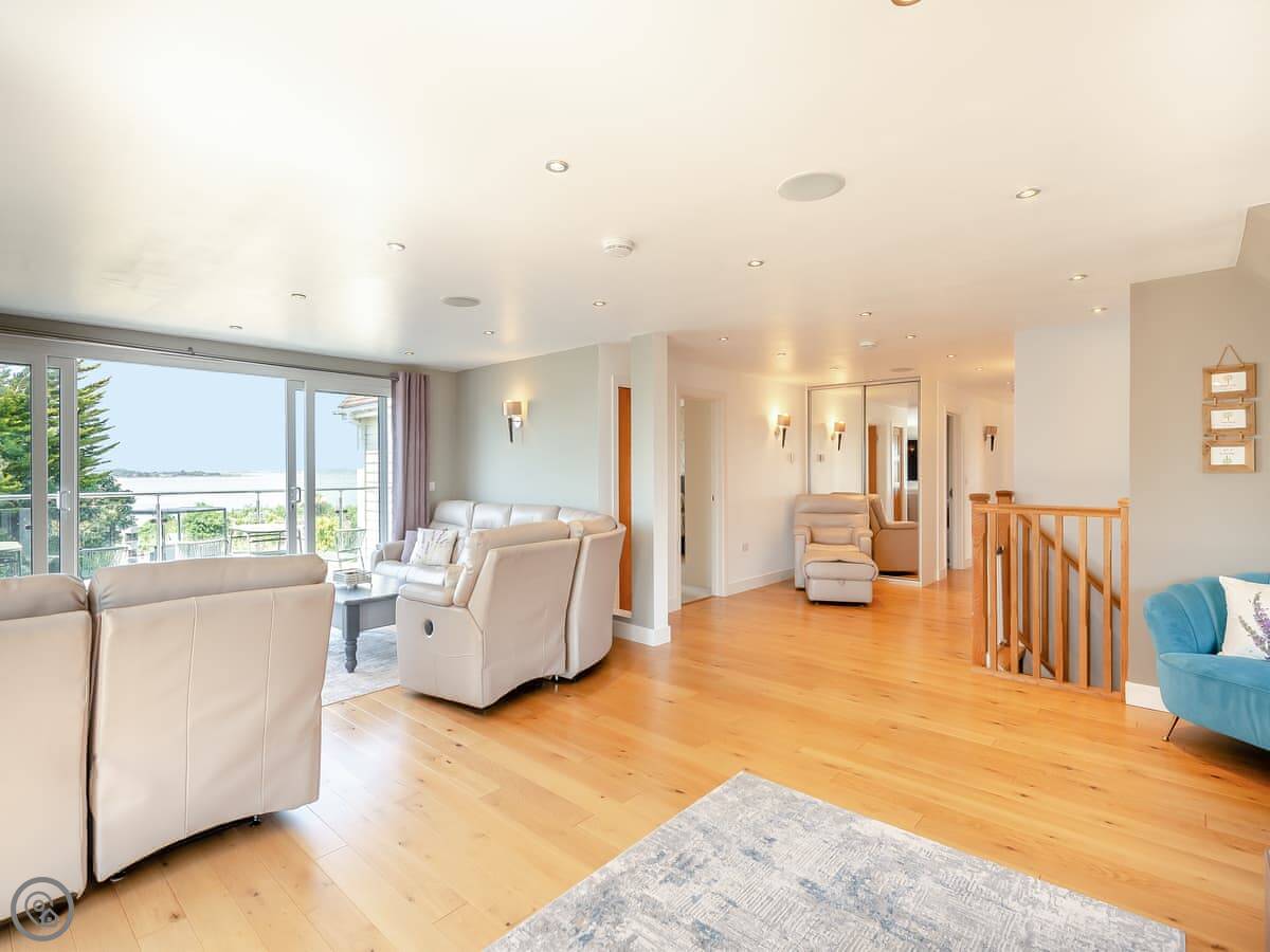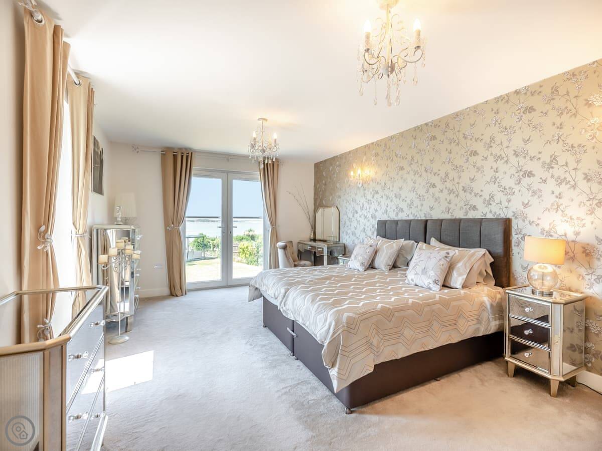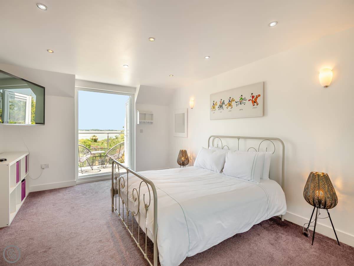 The house is bright and spacious inside. Some of the bedrooms are on the ground floor, and those have doors straight out to the garden, which is handy. The upstairs bedrooms have balconies looking out to sea. You can sit out there with a coffee.