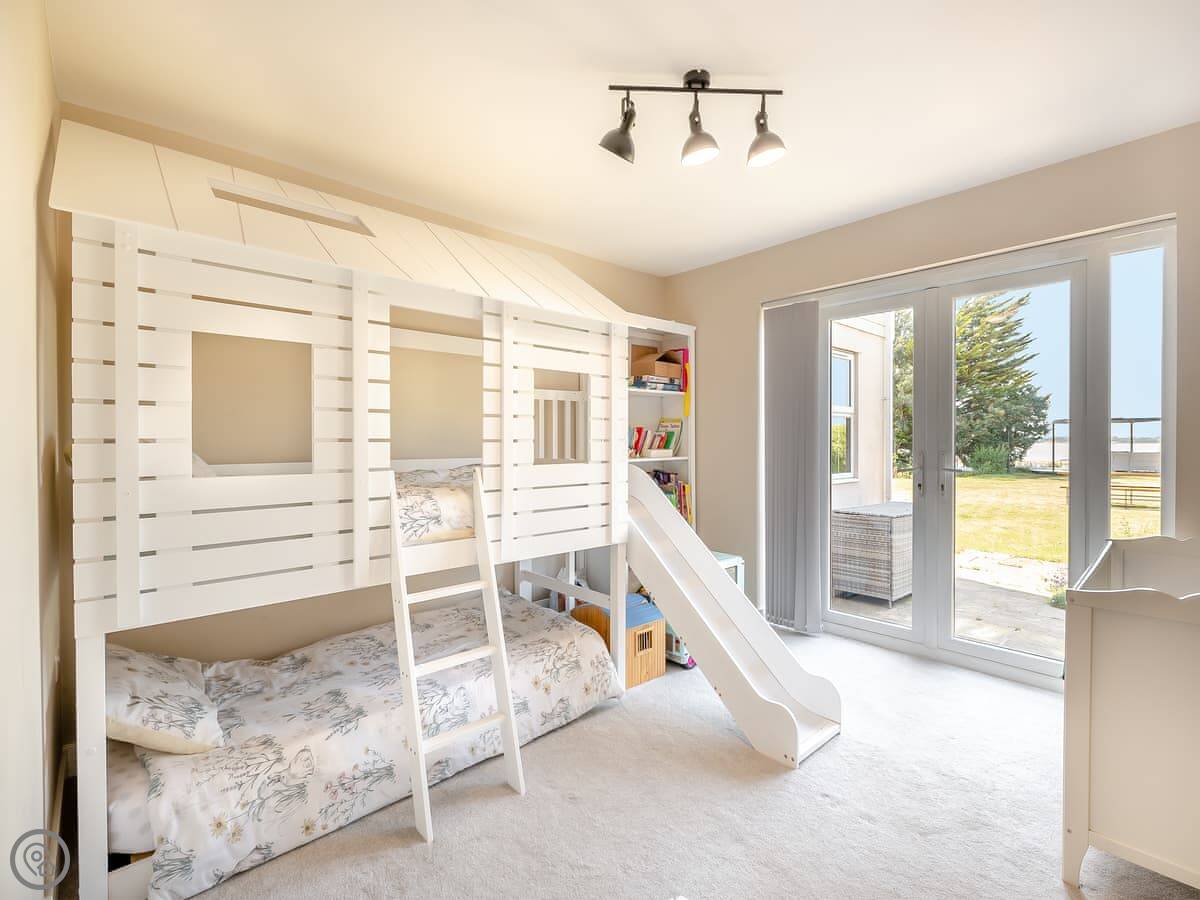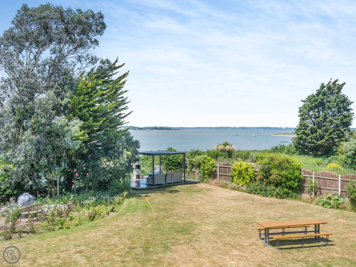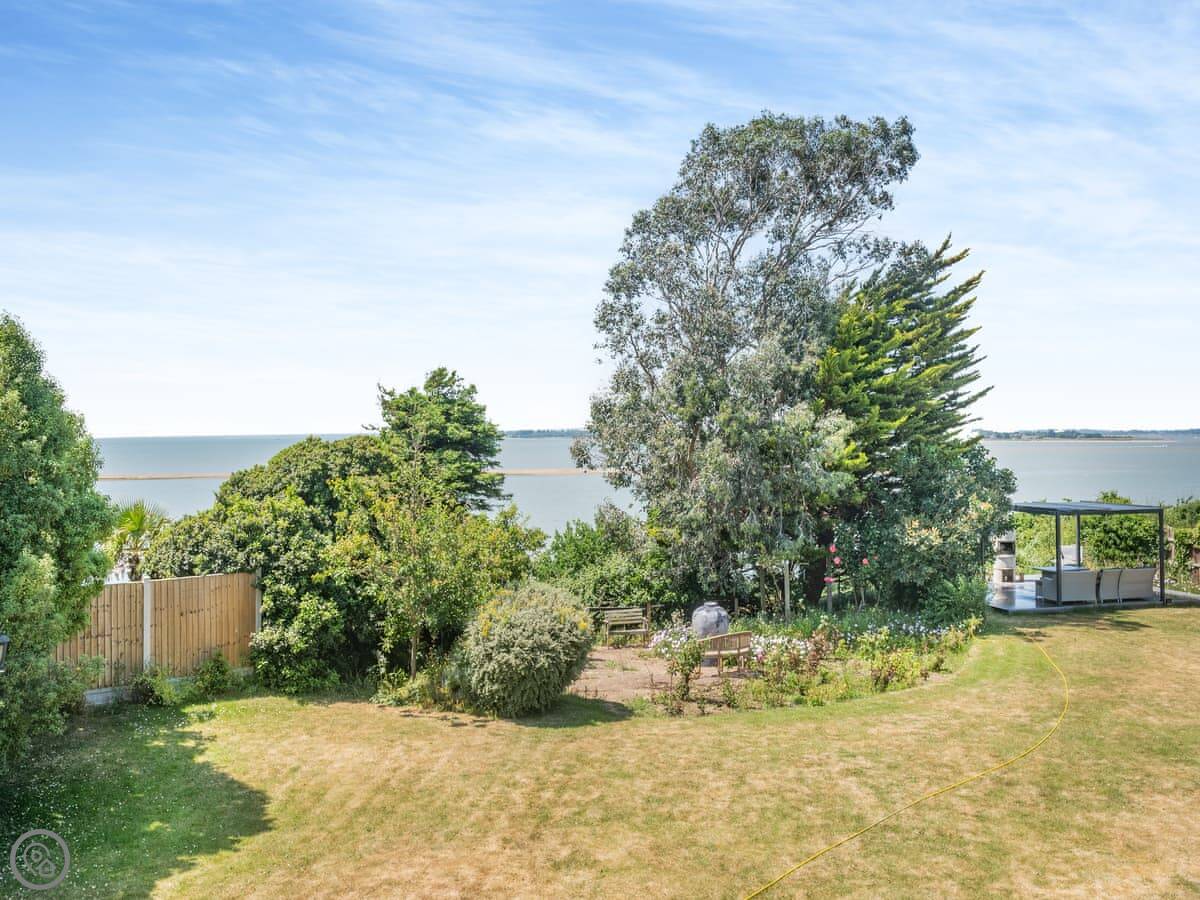 Outside, there's a large garden with lawn. It has a play area for kids, and a patio with a hot tub. The big thing is that the garden leads directly onto a quiet, sandy beach. You don't have to drive anywhere, you just walk down.